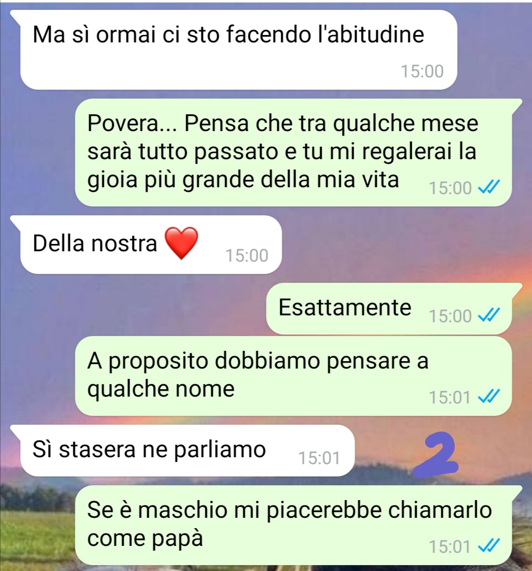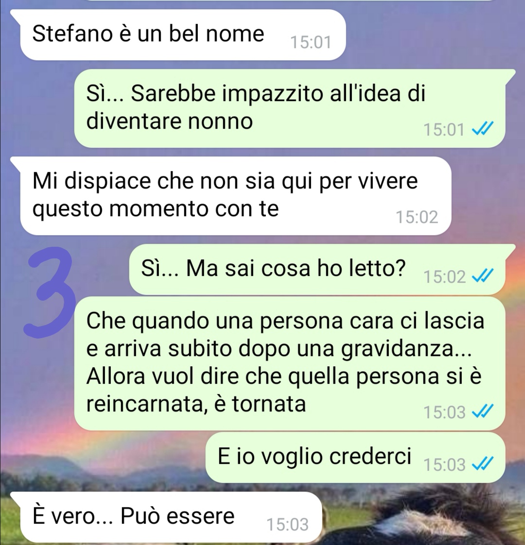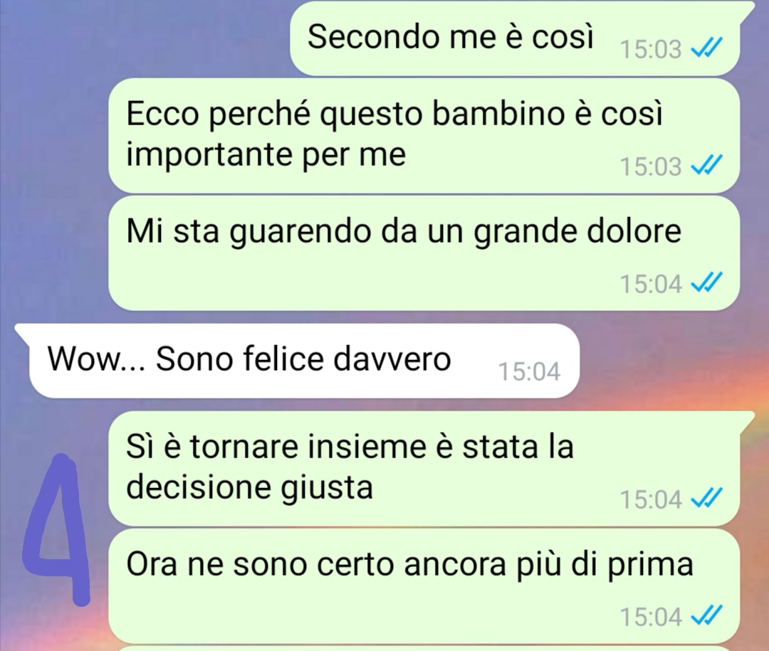 Ci arriva una mail molto lunga da parte di un ragazzo di 30 anni che negli ultimi mesi della sua vita ha vissuto un’altalena di emozioni. “Da profondi dolori a grande gioie”, così ci scrive lui. E leggendo la mail che accompagna la chat che ci manda si può capire subito a cosa si stia riferendo. Ha perso suo padre qualche mese fa, un dolore che non ha elaborato subito e accanto a quella perdita si è sentito lui stesso smarrito e confuso. Ha chiuso la relazione che aveva in corso perché non si sentiva più capito e ha cominciato a frequentare un’altra ragazza, volendo però andare con calma. Finché un giorno Lucia, la sua ex fidanzata, lo chiama e gli dice che aspetta un bambino. Lui subito è un po’ scioccato dato che non stanno più insieme, ma poi capisce che ora che sta per diventare padre deve ritrovare se stesso e il proprio equilibrio e fare la scelta più giusta. Così lui e Lucia ritornano insieme e questa nuova piccola vita che sta per arrivare lenisce la perdita del padre, perché ora potrà ricreare quel legame padre-figlio che gli manca. E tutto sembra davvero riacquistare senso, fino a quando non succede ciò che leggerete nella chat.