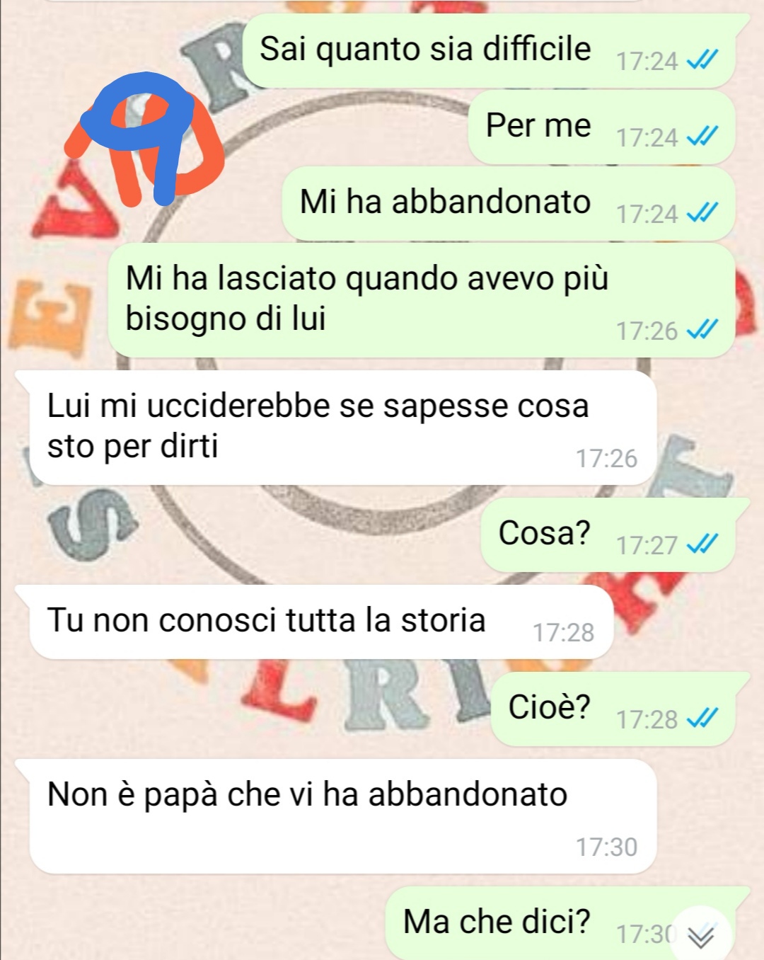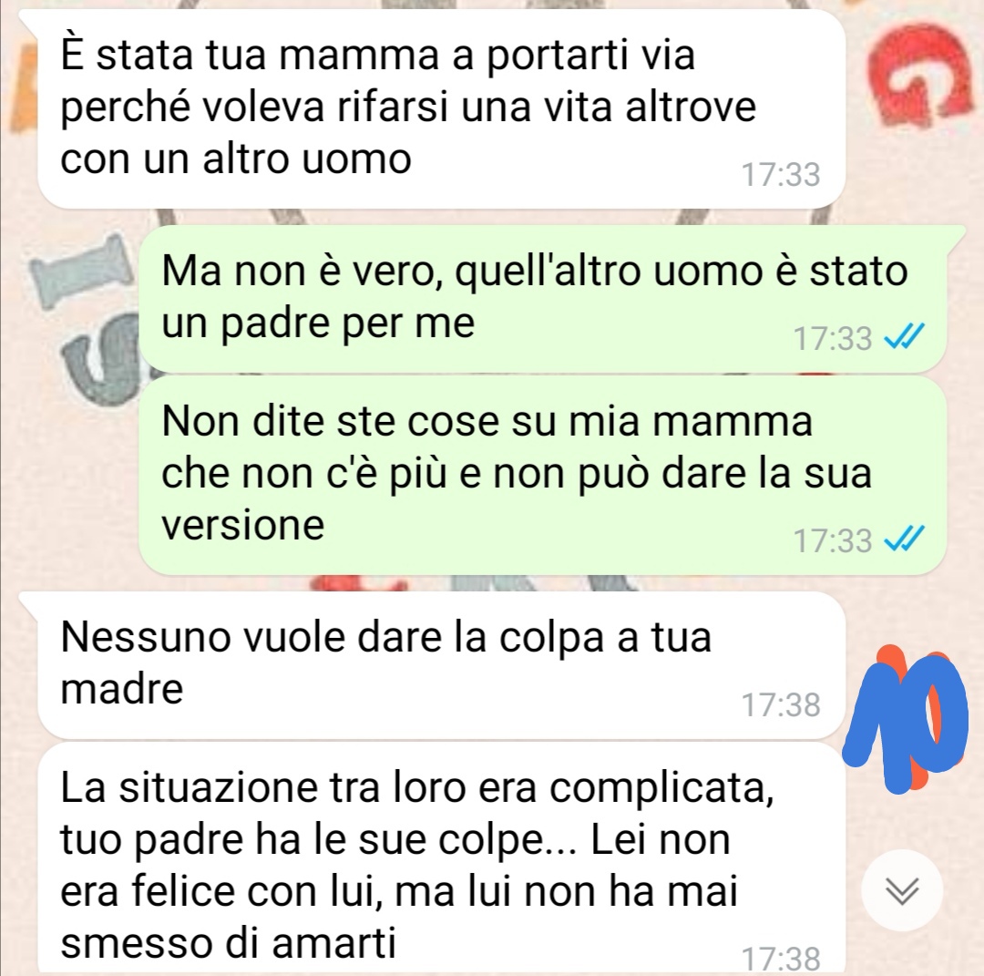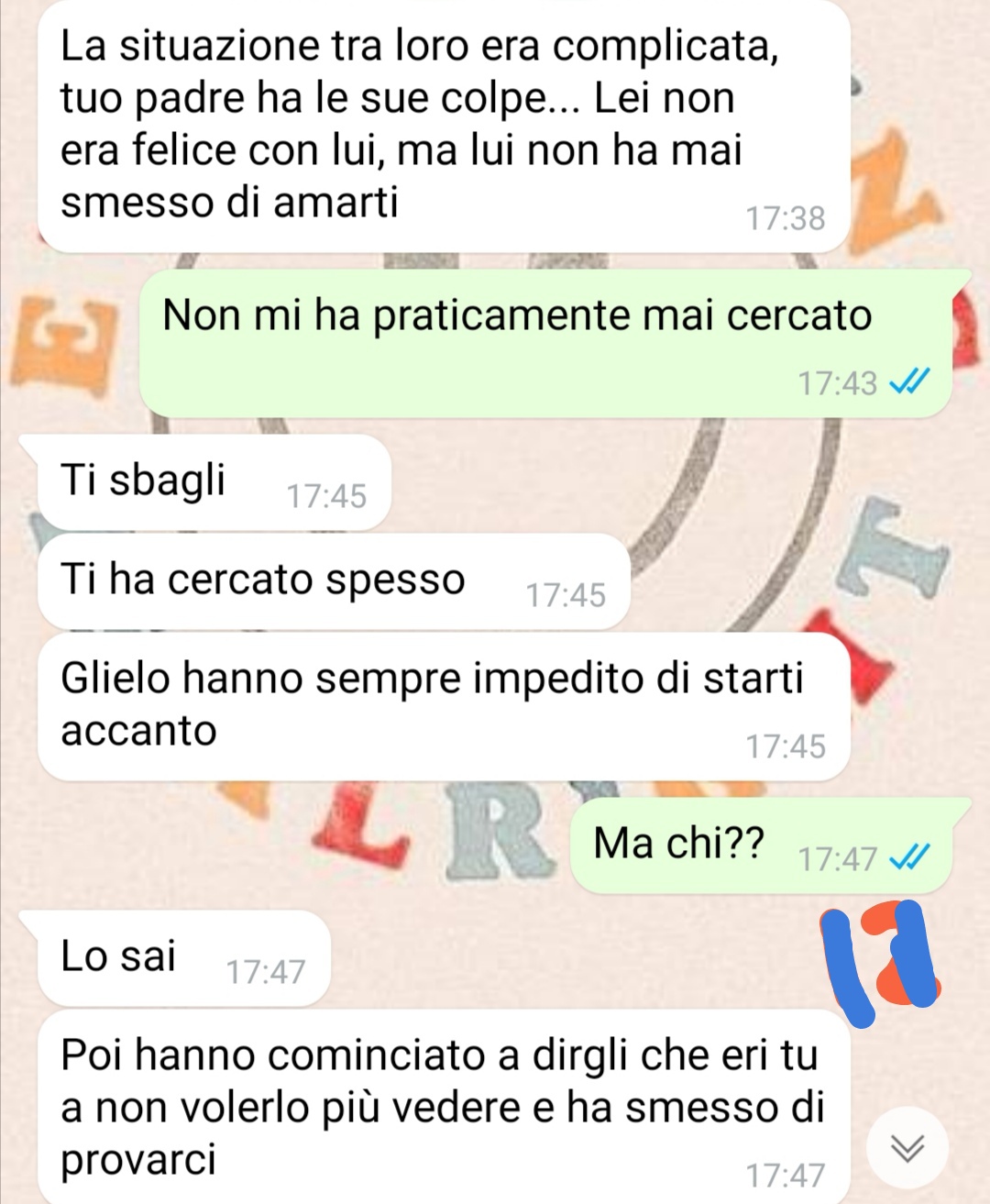 Per anni, ha creduto che il padre non avesse alcun interesse a cercarlo, salvo qualche raro episodio. Recentemente, però, la vita lo ha riportato a vivere nella stessa zona dell’uomo, grazie a un’eredità ricevuta da alcuni parenti. In età adulta e ormai indipendente, Maurizio ha anche avuto occasione di incontrarlo un paio di volte nella sua abitazione, ma senza mai riuscire a costruire un vero legame. Ammette che probabilmente la rabbia che covava dentro di sé ha impedito a quel rapporto di prendere forma.