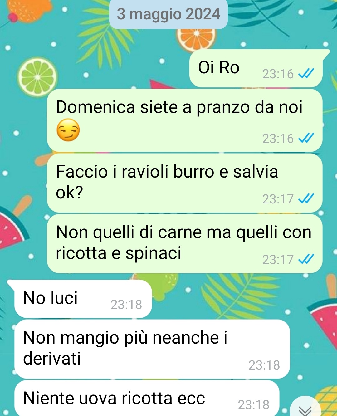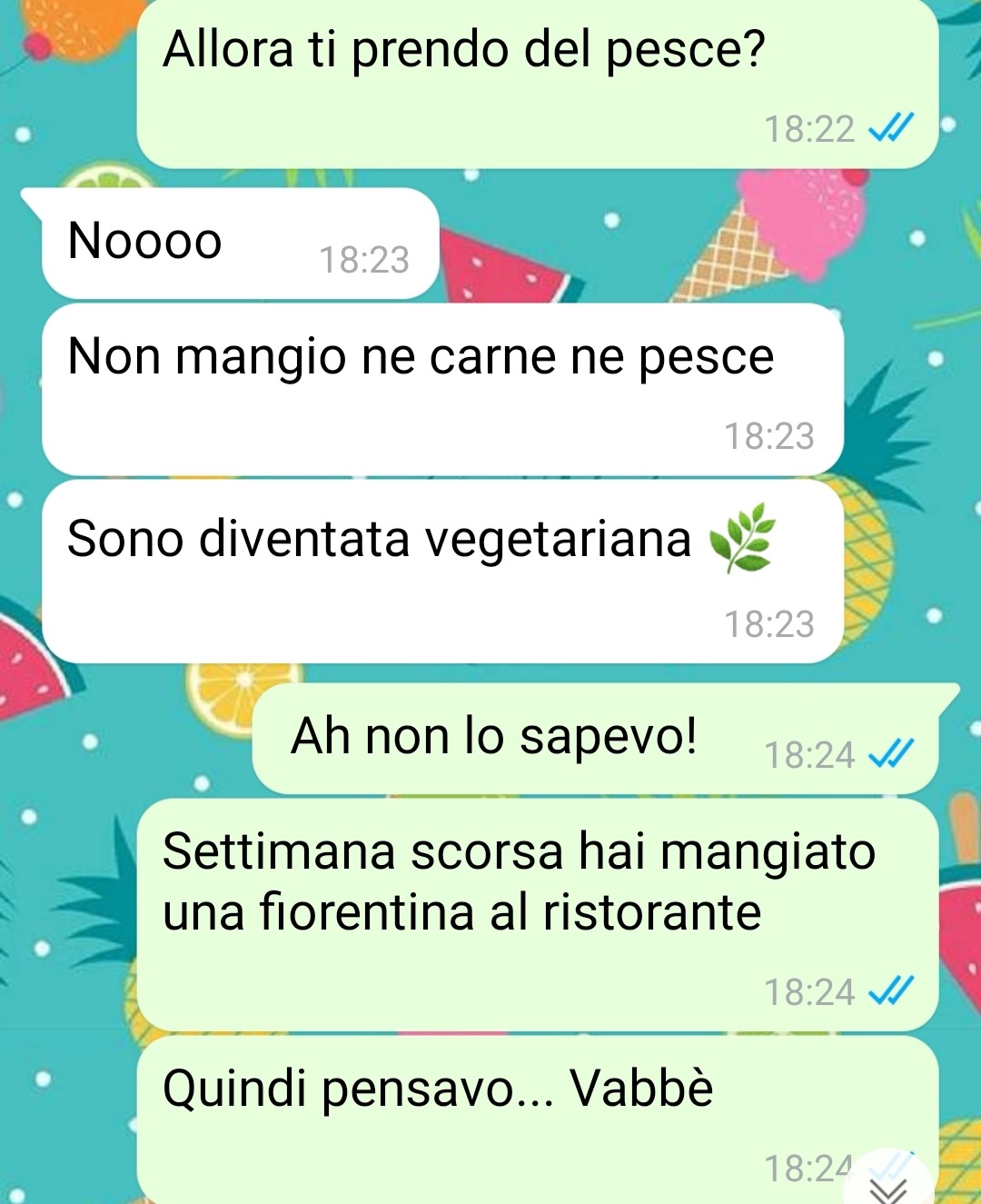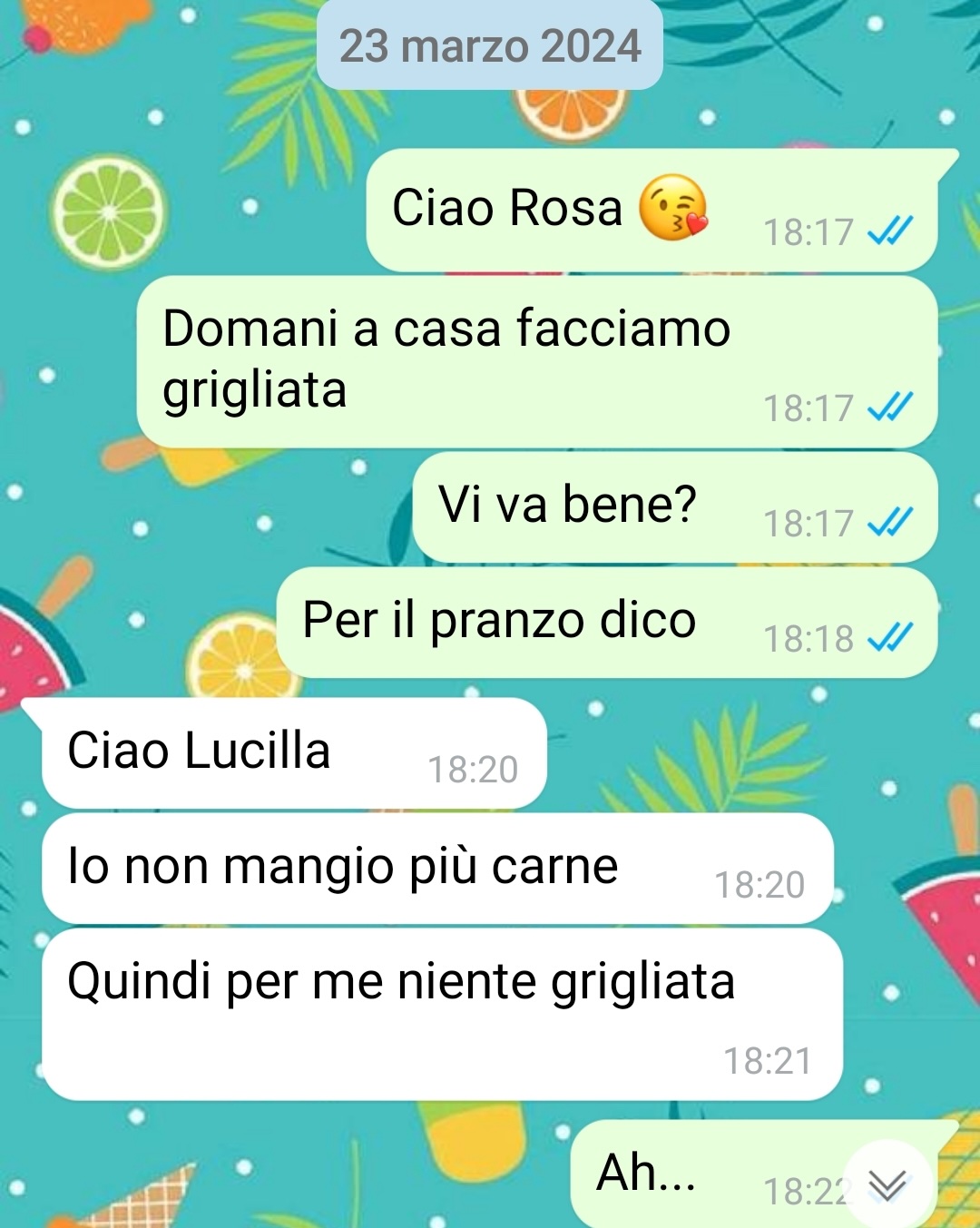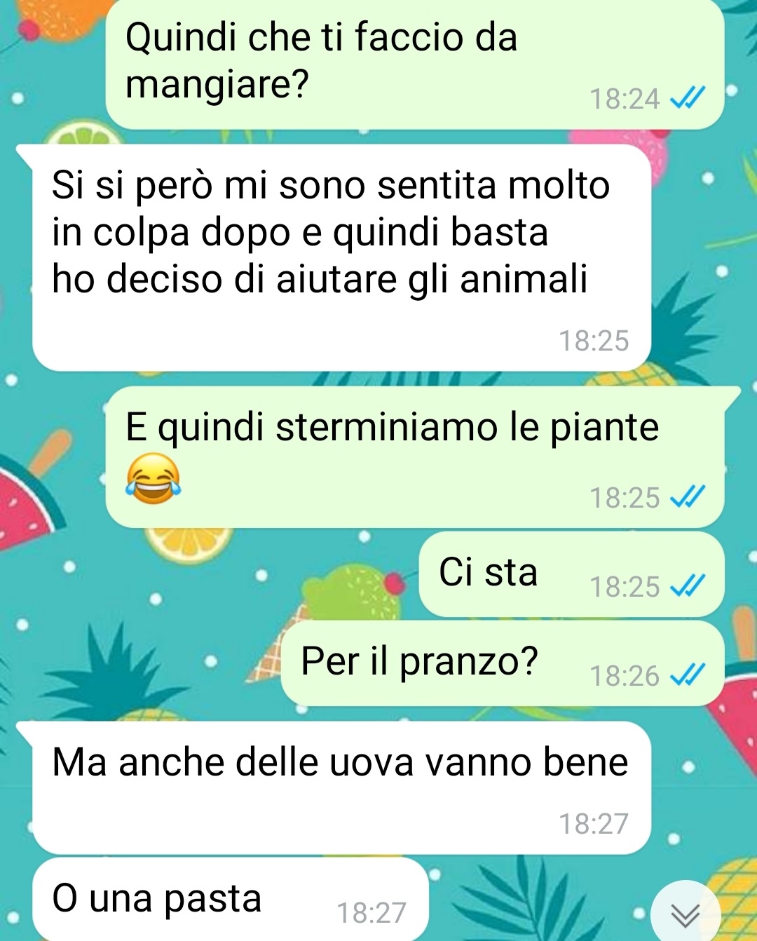 Mi chiamo Lucilla e sono onnivora. Ve lo premetto, per via di ciò che andrete a leggere. Mia cognata Rosa si fissa sempre con le cose che “vanno di moda”, tipo l’essere vegano, vegetariano, intollerante a questo o a quello. Ogni volta ne ha una diversa e sappiamo tutti che non è veramente seria nelle scelte che prende. Perché non mi puoi dire che sei vegetariana e poi ti mangi la bistecca, insomma, su! Comunque, nonostante io non me la beva, per il quieto vivere cerco di accontentarla quando vengono a mangiare da noi, preparo sempre cose a parte per lei, così è contenta. Il problema è che lei non sa accontentare anche gli altri: pretende, pretende, pretende, ma non da’ mai. Io mi sono un po’ stufata di fare sempre seicento piatti con le verdurine di qua e di là, perché sennò lei fa storie. Ma soprattutto, prendete le decisioni che volete senza influenzare gli altri. Volete essere vegani? OK. Volete essere vegetariani? OK. Volete mangiare carne? OK. Ma non vuol dire che allora lo debbano fare tutti intorno a voi.