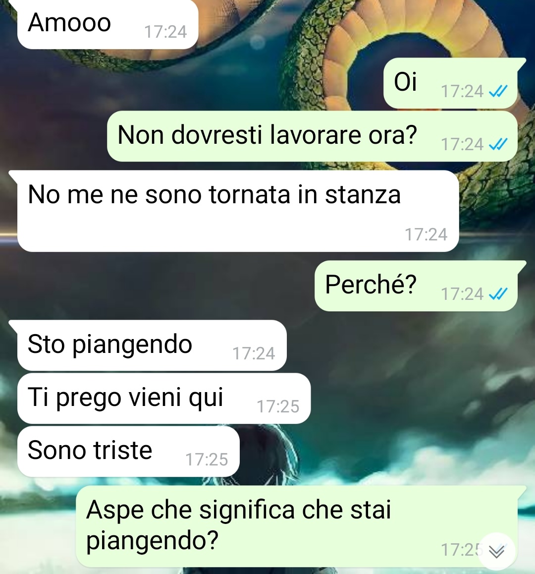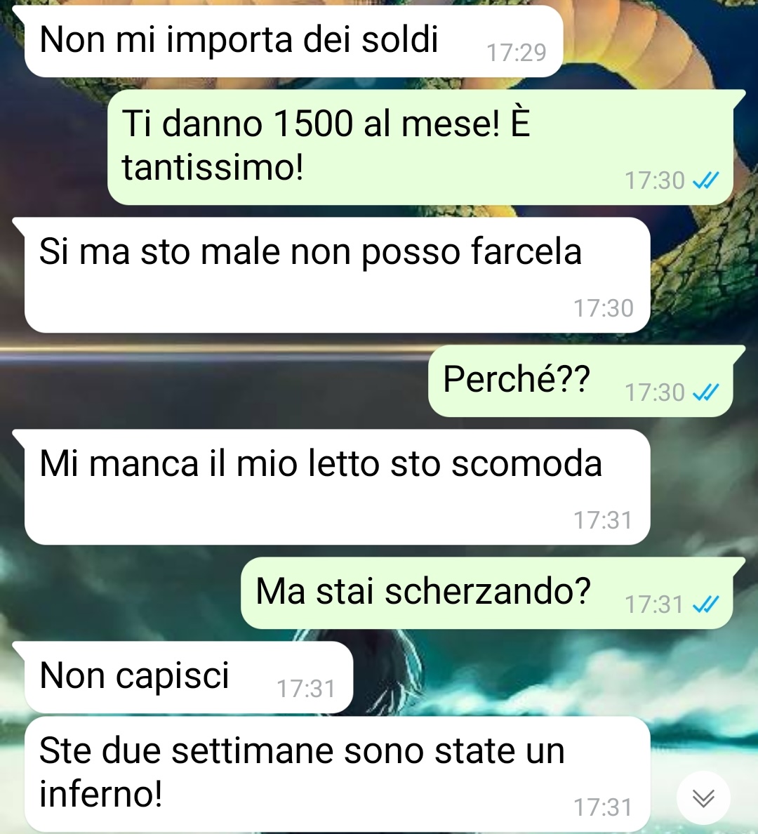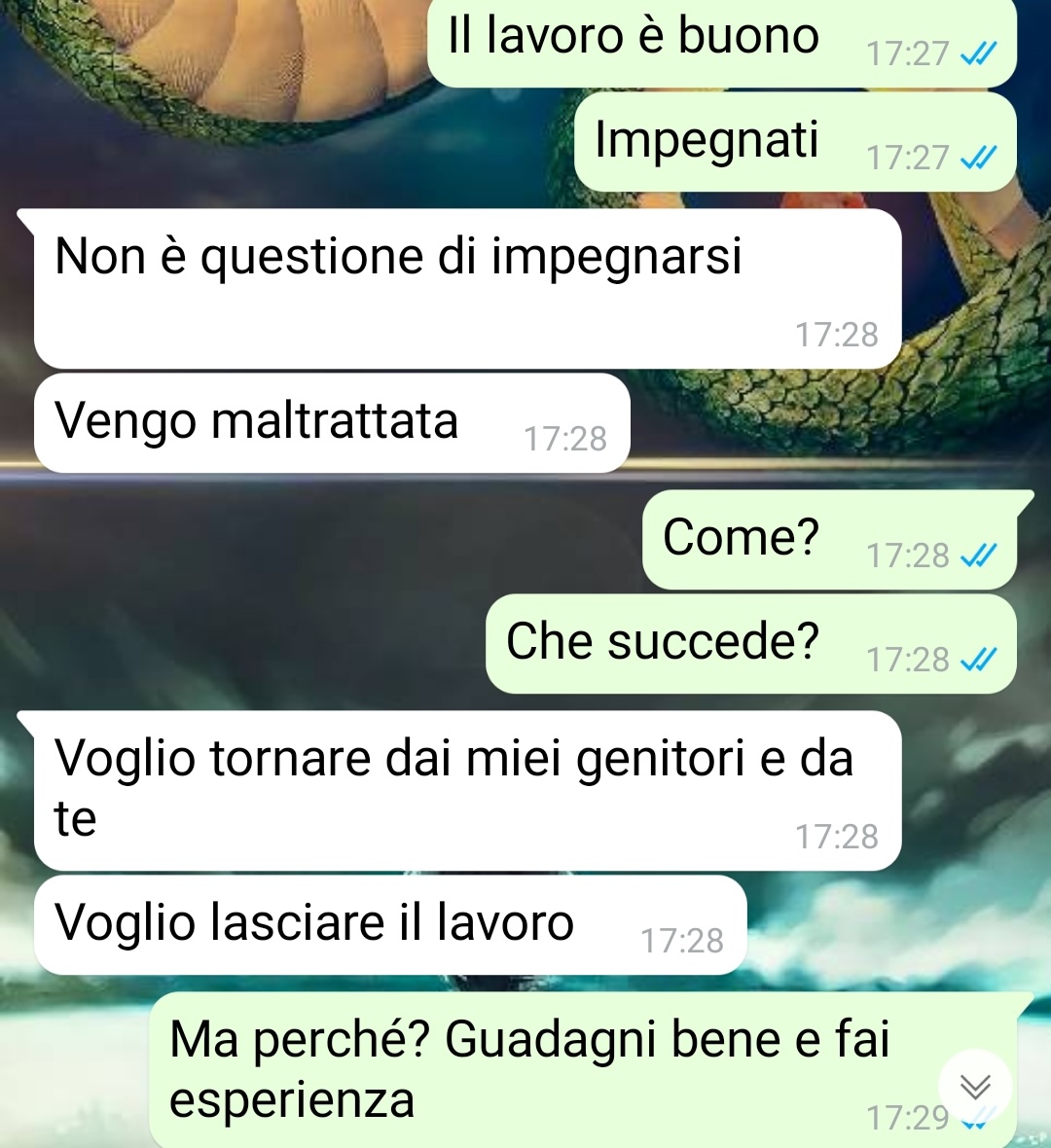 Sono Mauro e vi auguro di non avere mai a che fare con una persona talmente ingrata quanto lo è la mia ragazza. Ma non ingrata nei miei confronti, figurarsi io non ho fatto nulla di che, ma verso la vita, verso la fortuna incredibile che ha avuto. Io ora ci ho litigato a morte, lei non mi parla più, dice che sono stato troppo duro con lei, ma lei è anche troppo delicata. Dovete sapere che lei è sempre cresciuta nella bambagia, è una classica principessina, una che i genitori le hanno sempre dato ciò che voleva e quando lo voleva, perciò nel momento di entrare a far parte del mondo del lavoro, alla minima difficoltà si ritrova ad essere impaurita e abbattuta. Il problema ovviamente è che se avesse trovato un lavoro inutile, in un campo che non le compete e dove viene sfruttata allora potrei dire, ok ha ragione poveretta. Ma è nel campo per il quale lei ha studiato, dove la stanno trattando meglio di molti altri italiani e il suo essere ingrata per questa fortuna mi ha reso particolarmente duro con lei, lo ammetto.