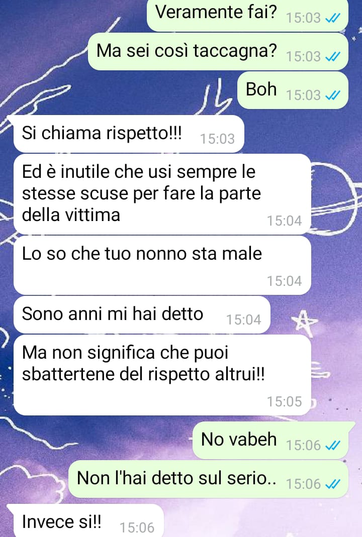 La nostra fan ha deciso di condividere questi messaggi perché ritiene che la reazione ricevuta sia sproporzionata e lontana da ciò che lei considera davvero importante nella vita. È rimasta colpita da come alcune persone sembrino perdere di vista le priorità e trasformino piccoli disguidi in drammi personali, dimenticando il valore dell’empatia, del dialogo e della comprensione reciproca.