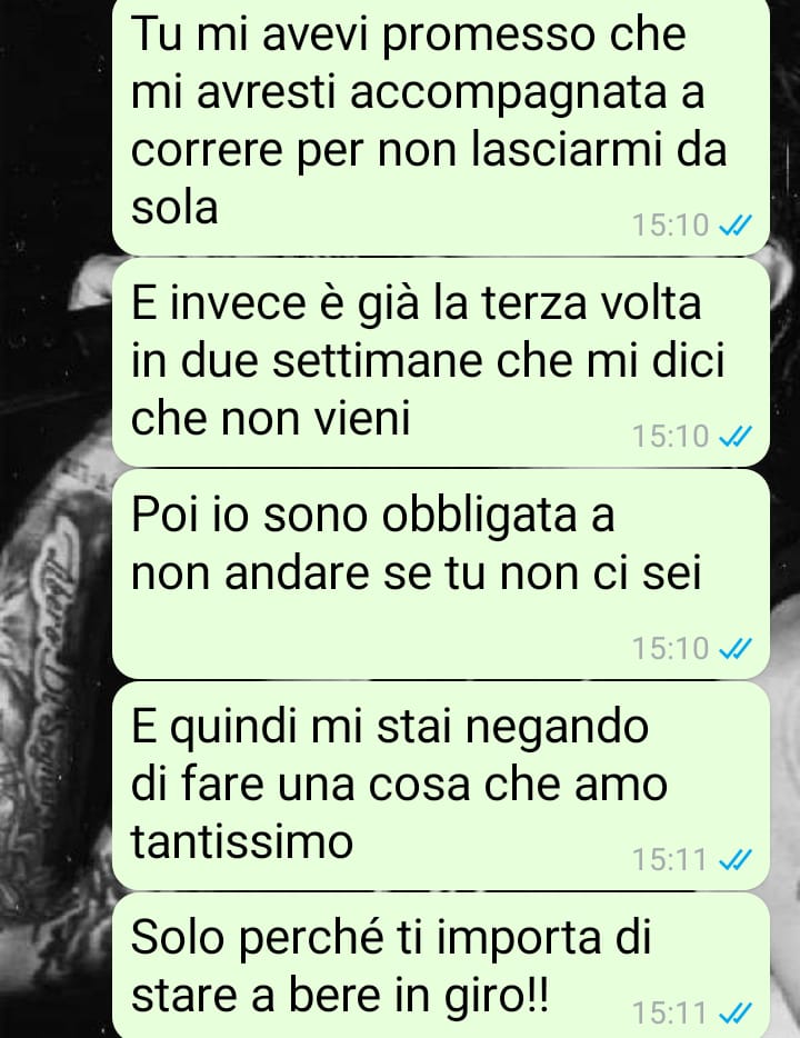 Da tempo aveva espresso il desiderio che il suo ragazzo la accompagnasse in queste uscite, non tanto per fare attività fisica insieme, quanto per un motivo specifico che svela nella conversazione. Tuttavia, nonostante le ripetute richieste, lui ha sempre rifiutato. Questa volta però, di fronte all’ennesimo no, la nostra follower non è riuscita a far finta di nulla.