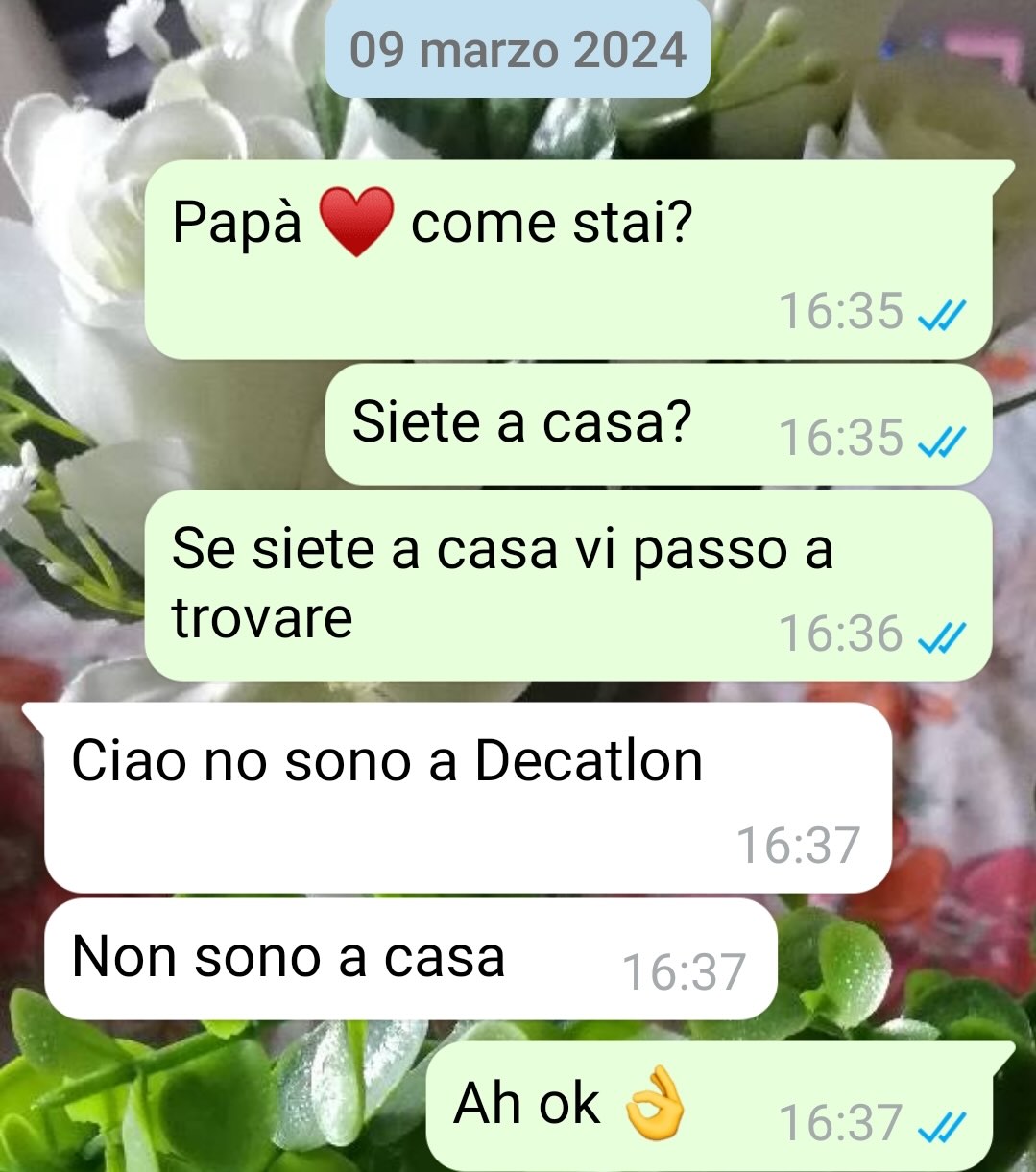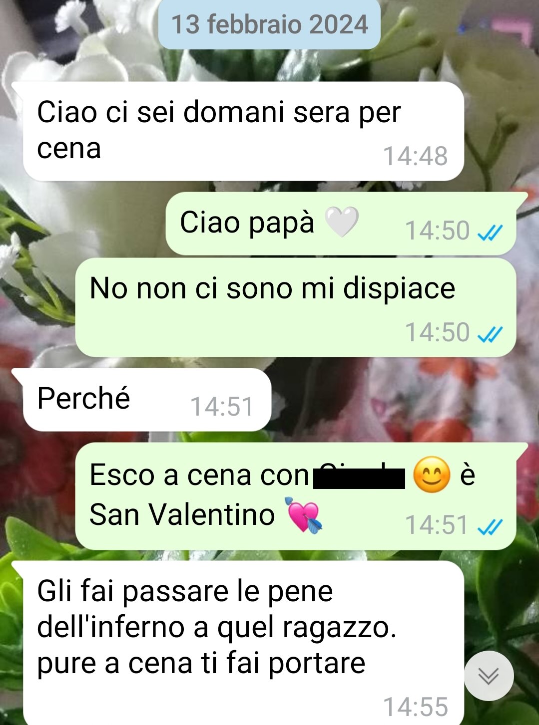 Preferisco che il mio nome rimanga anonimo. Soprattutto avrei voluto condividere anche io, come fanno tanti sulla vostra pagina, una bella relazione con la mia famiglia; invece, non posso farlo… Invidio un po’ tutti quelli che condividono le battute dei nonni oppure le gaffe dei genitori, simpatici e alcuni molto premurosi, come in effetti dovrebbero essere. Capisco anche che non sia facile essere genitori, ma vorrei condividere con voi il rapporto con mio padre, che non è mai stato dei migliori, ma oggi, che ragiono più di quando avevo 15 anni, mi r endo conto che il suo comportamento mi abbia influenzato molto negli anni. E forse continua, in minima parte, a farlo anche oggi. Con l’unica differenza che, oggi, sono più grande e sono più forte di una volta… Ci rimango male, sì, ma per fortuna non mi ab batto fino allo stremo. Vi mando solo alcuni screen, ma potrei continuare all’infinito… Questo è solo per rendere l’idea e per far capire che non è sempre tutto rose e fiori, come a volte si pensa.