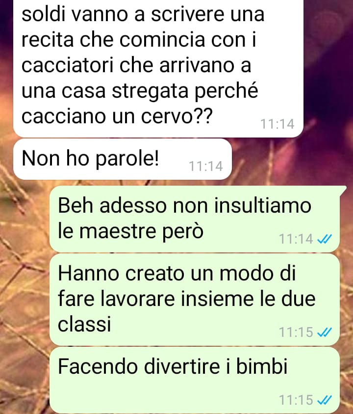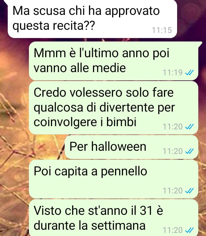 La nostra fan Marta condivide una situazione delicata che la coinvolge come madre di un bambino che frequenta l’ultimo anno delle scuole elementari. L’episodio ha inizio quando le maestre della classe decidono di organizzare una recita scherzosa per Halloween, pensata come un modo divertente e coinvolgente per celebrare la festività con tutti i bambini dell’ultimo anno. L’iniziativa, apparentemente innocua e finalizzata al divertimento dei piccoli alunni, diventa però il punto di partenza per una controversia inaspettata che metterà alla prova i rapporti tra genitori.