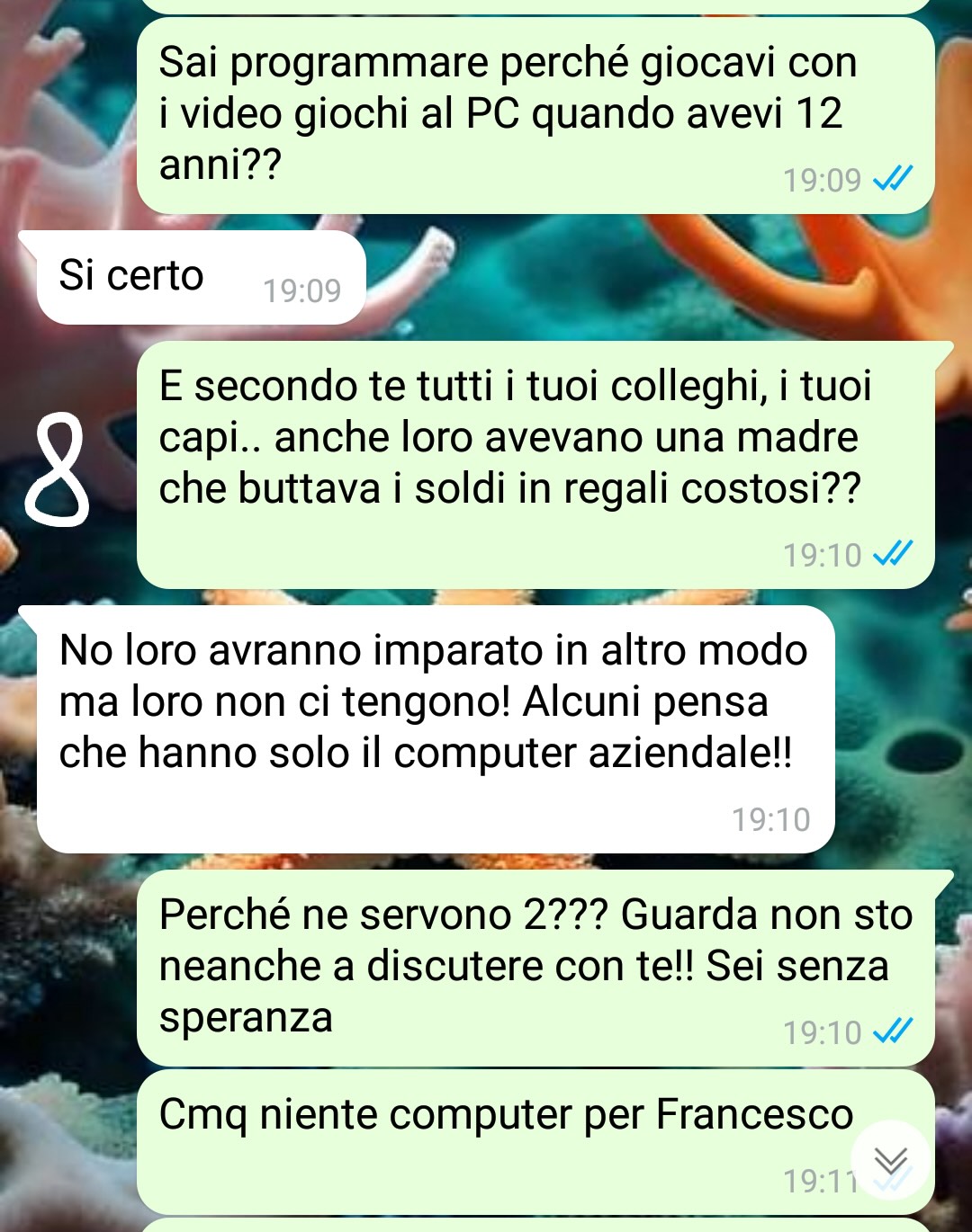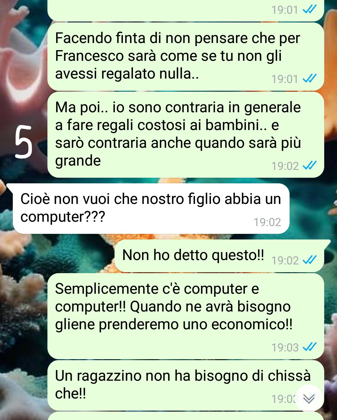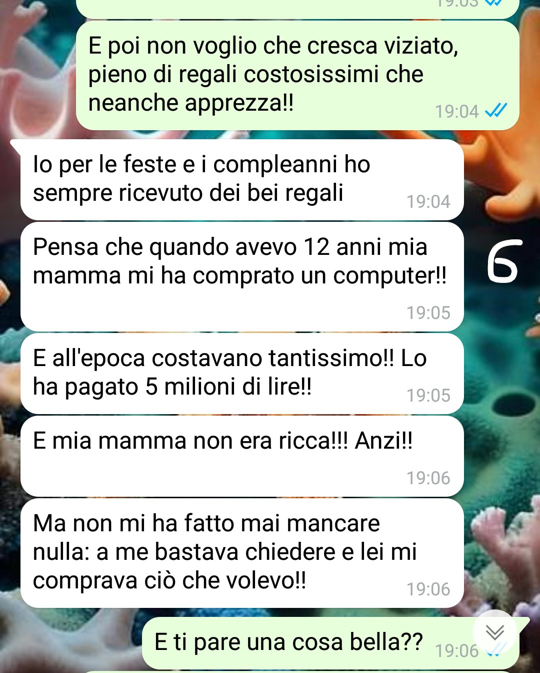 Nel suo racconto, la nostra fan descrive l’ex marito come una persona fondamentalmente perbene, ma con idee molto rigide e personali che considera verità assolute, tanto da costruirci intorno ogni sua convinzione. Una delle sue fissazioni principali, secondo quanto scrive Ursula, riguarda il modo di vivere le ricorrenze come compleanni e feste comandate. Per lui, spiega, è indispensabile fare regali costosi: il valore economico diventa più importante del pensiero o dell’utilità di ciò che viene donato.