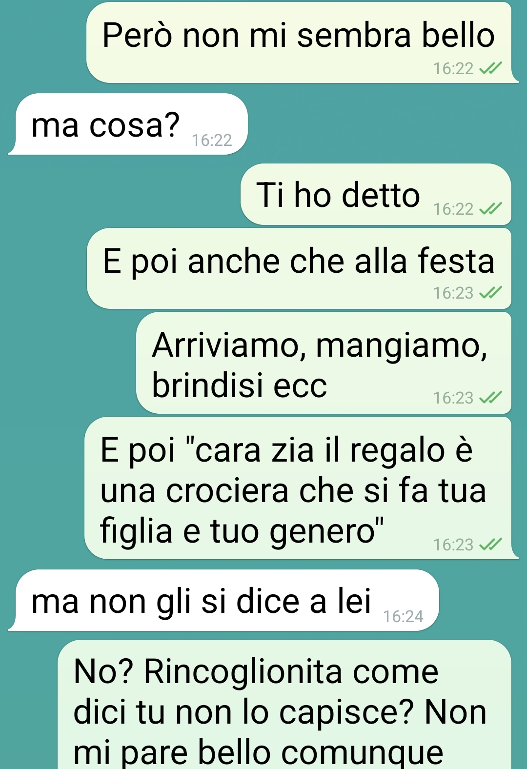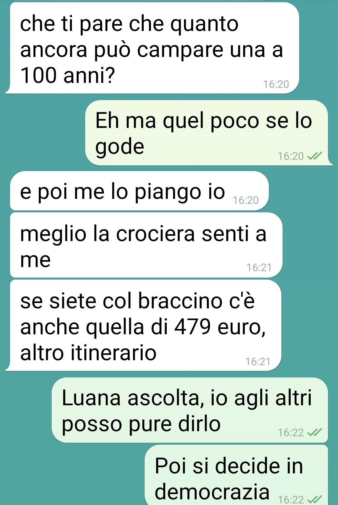 La proposta di regalo che Luana avanza lascia Sara completamente perplessa: una crociera per la madre centenaria, che però in realtà si prenderebbe lei stessa. La nostra amica accenna anche all’esistenza di alcuni messaggi scritti che peggiorerebbero ulteriormente la già compromessa figura della cugina. La situazione si presenta quindi come un paradosso in cui quella che dovrebbe essere una festa per la madre diventa qualcosa di completamente diverso.