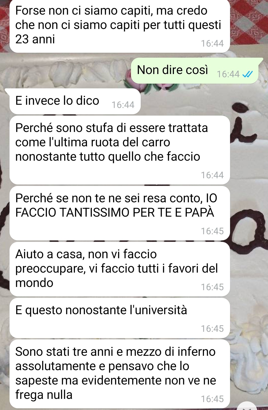 Per me e per mio marito Fabrizio, Laura, la nostra unica figlia, è quanto di più prezioso esista al mondo. Sicuramente è una ragazza molto difficile così come anche noi potremmo non essere (anzi sicuramente non li siamo) dei genitori perfetti. Però la amiamo. Laura è il nostro grande tesoro fin dalla sua nascita, e per quanto possibile le siamo stati vicini sempre e comunque. Ma ovviamente, non sempre si può. Dopo un periodo complesso alle superiori si è iscritta all’università e pensavamo potesse essere il momento di una svolta positiva nella sua vita, mentre è stato tutto il contrario. Ha faticato a studiare e a tenersi in pari, ha faticato a fare amicizia, e soprattutto ha faticato a trovare quella serenità e leggerezza di vita che una studentessa universitaria dovrebbe avere a quell’età. Finalmente, nonostante tutto ciò, si è riuscita a laureare. Noi, per ovvie ragioni, eravamo e siamo immensamente fieri per lei e per questo obbiettivo raggiunto. Presa dall’emozione e dall’amore che provo per lei, avevo deciso di farle un regalo direttamente dal cuore, ma purtroppo non è andata come avevo immaginato.