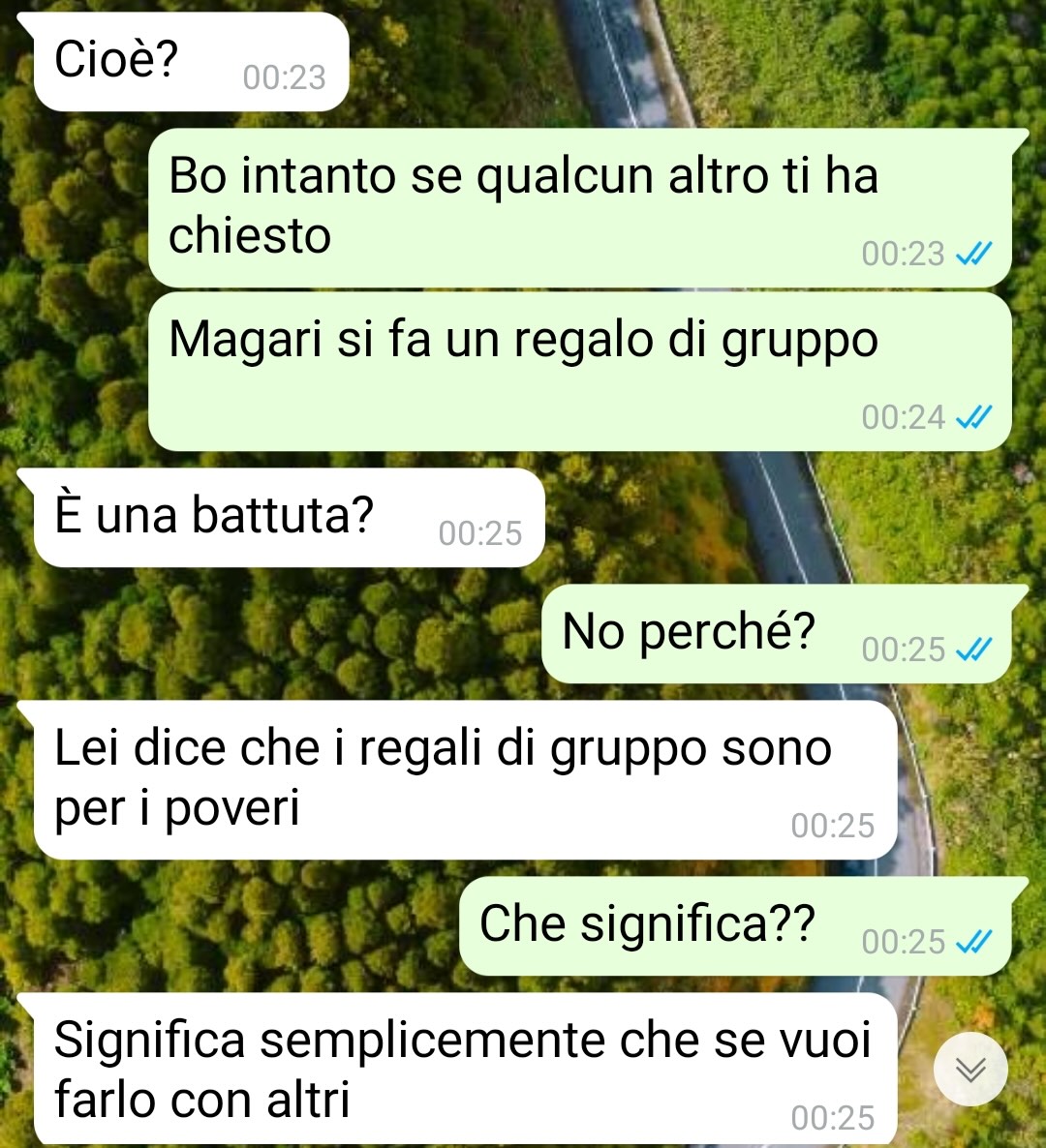 Il mio nome è Saverio e il mio migliore amico si chiama Federico, mentre la sua fidanzata si chiama Valentina. Ora, che sia chiara una cosa. Io non ho il minimo interesse per lei, anche se in passato c’è stata una mezza cosa prima che si mettessero insieme. Lui a volte fa il geloso e se ne esce con dichiarazioni da medioevo, ma sono pure fidanzato e anche molto felicemente. Sto per andare a convivere con una ragazza fantastica che si chiama Maria e trovo che sentirmi dire ancora cose su un mezzo flirt avvenuto 7 anni fa sia piuttosto infantile. Il problema di questa storia, quello vero, ha però a che fare con il compleanno di Valentina. Io la conosco abbastanza, ma è anche vero che è un tipo di persona che o ha tutto o non le piace nulla ed è piuttosto complesso. Come fare allora? Ho chiesto un aiuto al mio amico per capire cosa potevo regalarle ed è iniziato il dramma. Io penso che lui abbia avuto una reazione esagerata e che la mia idea di regalo non era così assurda.