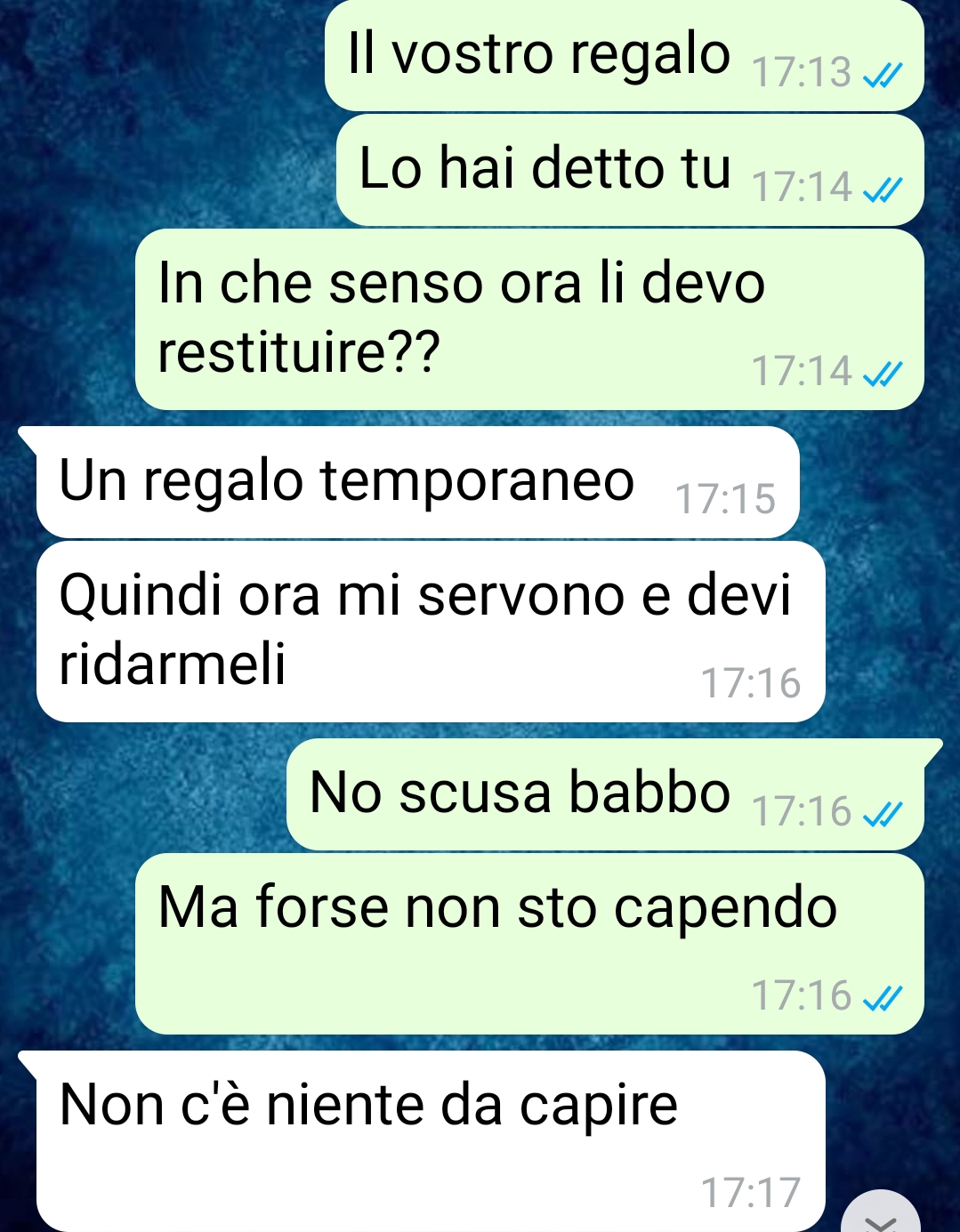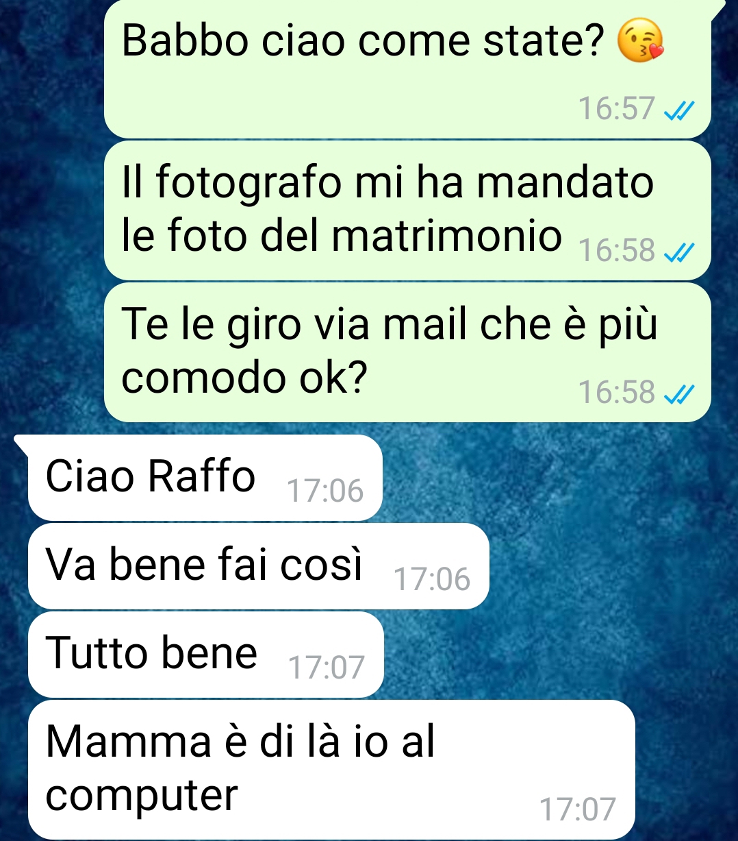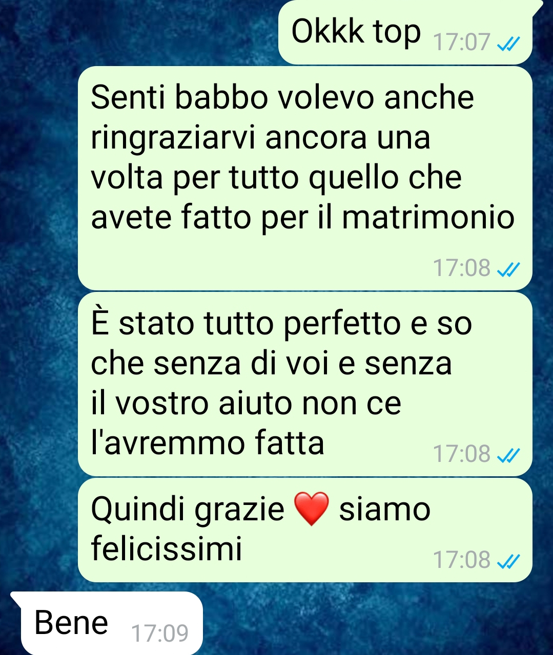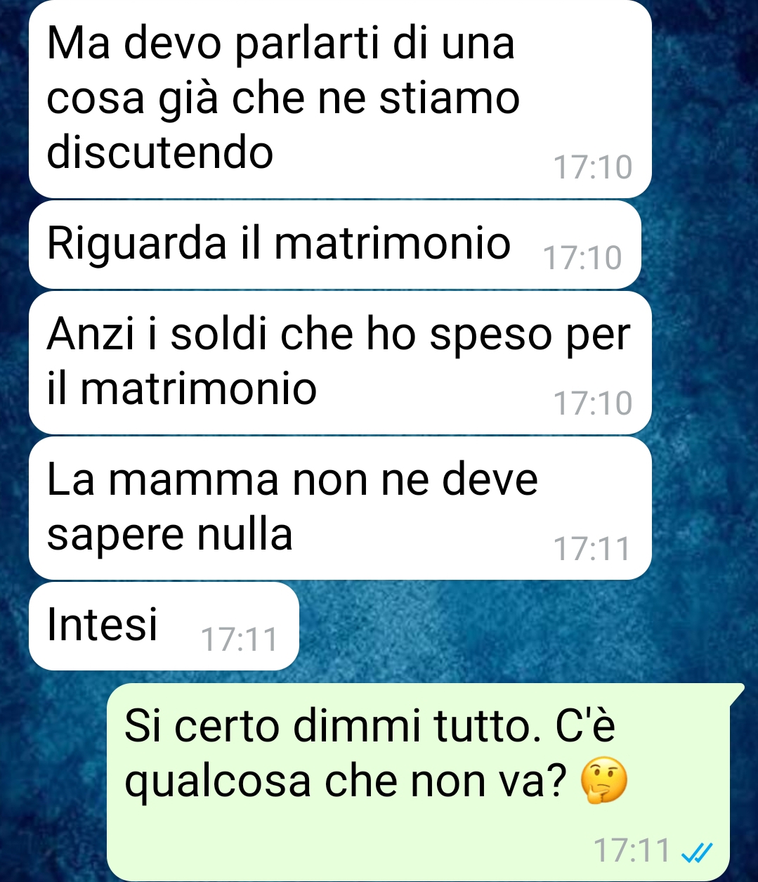 Mi chiamo Raffaele e il mese scorso mi sono sposato con la mia dolce metà… Ho visto sulla vostra pagina che ultimamente tante persone si sono sposate o dovevano sposarsi e vi mandavano le loro storie/ peripezie. Diciamo che è stato un po’ questo a spingermi a scrivervi. Spero che condividiate la mia esperienza, un po’ perché vorrei sentirmi meno solo e un po’ perché voglio che la gente veda che il detto “parenti serpenti” è proprio una certezza! Vi avviso che la questione è un po’ complicata, cercherò di spiegarmi al meglio ma a quanto pare c’è un intreccio di sotterfugi e di bugie che fa invidia ai migliori scrittori. Mio padre mi ha aiutato economicamente ad organizzare il matrimonio, senza che mamma lo sapesse. Infatti, con lei presente mi aveva dato un assegno di 1000 euro, poi però si era fatto avanti e mi aveva pagato tutto il resto e io in effetti a mamma non ho m ai detto nulla di esplicito perché c’era sempre lui presente e perché pensavo lo sapesse. Io ero preso dal fatto che per una volta le attenzioni fossero tutte su di me… Povero illuso che sono…Vi mando la conversazione con mio padre post matrimonio, quindi tipo due settimane fa.