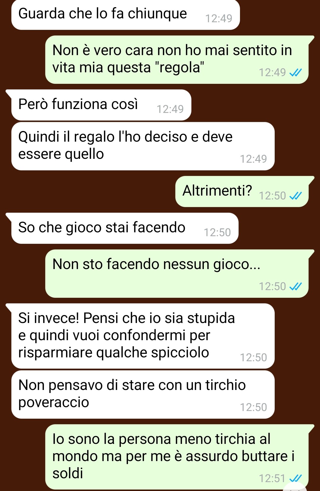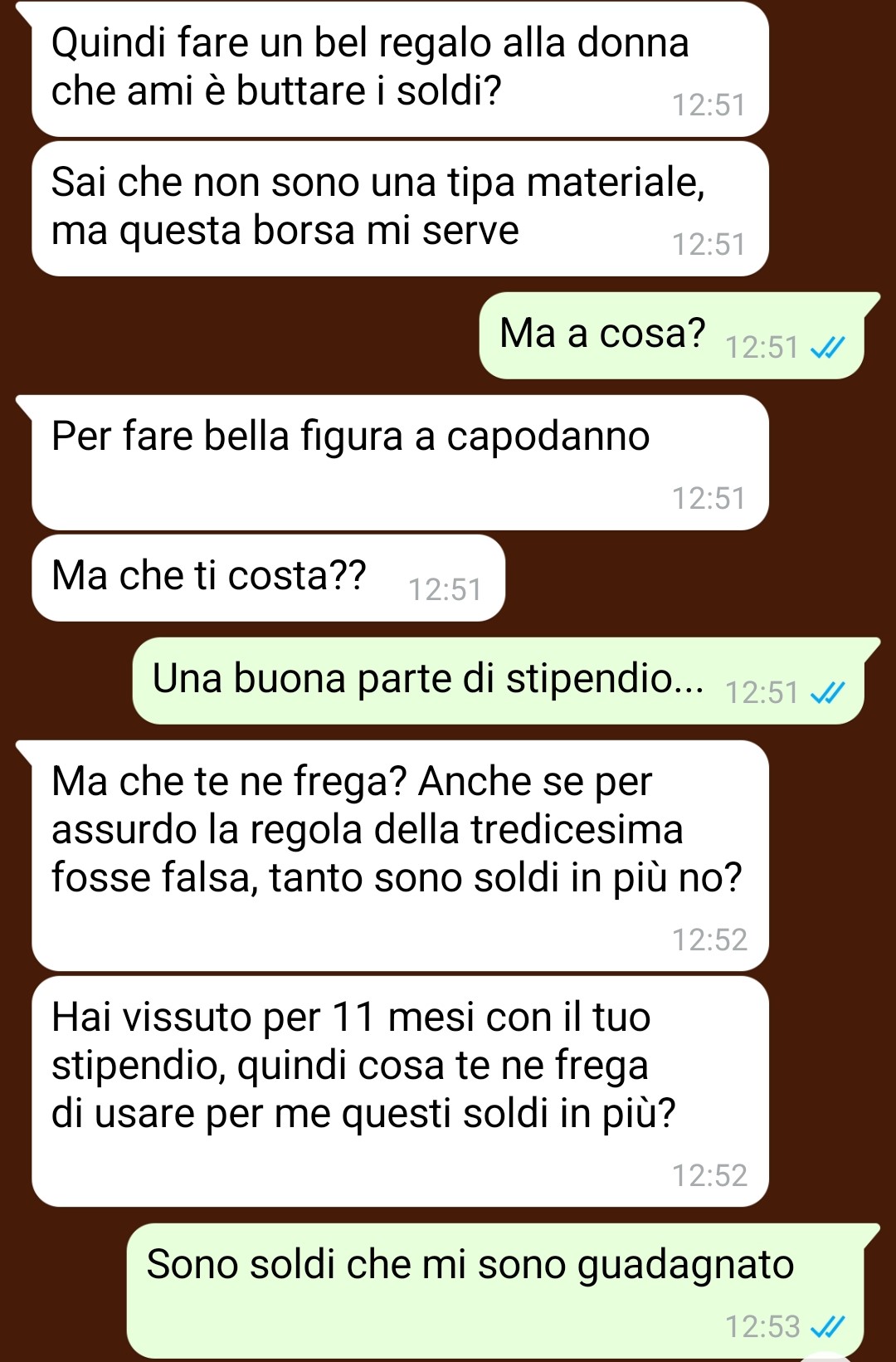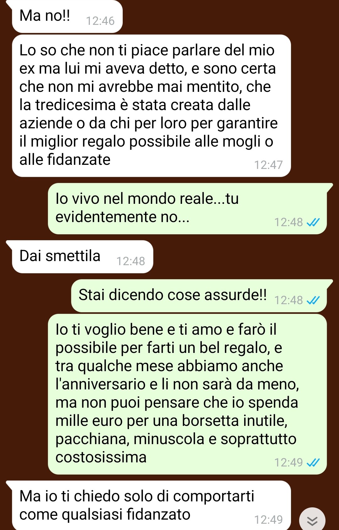 Il nostro follower racconta di una situazione che lo ha messo in difficoltà con la sua fidanzata di nove mesi. L’amico tiene a precisare fin da subito di non considerarsi una persona tirchia, ma piuttosto attenta alle spese, distinguendo tra le due cose. Spiega che secondo lui viviamo in un periodo in cui più si spende, più si viene considerati persone migliori, cosa che ritiene una follia. Quando necessario o per fare regali speciali l’uomo spende volentieri, ma non ama buttare i soldi, anche perché ha uno stipendio dignitoso ma non eccessivo. Durante la relazione con la ragazza, molto carina e simpatica con cui si trova bene, il nostro fan si è spesso trovato a pagare per entrambi dato che lei non lavora, situazione che ha sempre accettato di buon grado essendone consapevole fin dall’inizio.