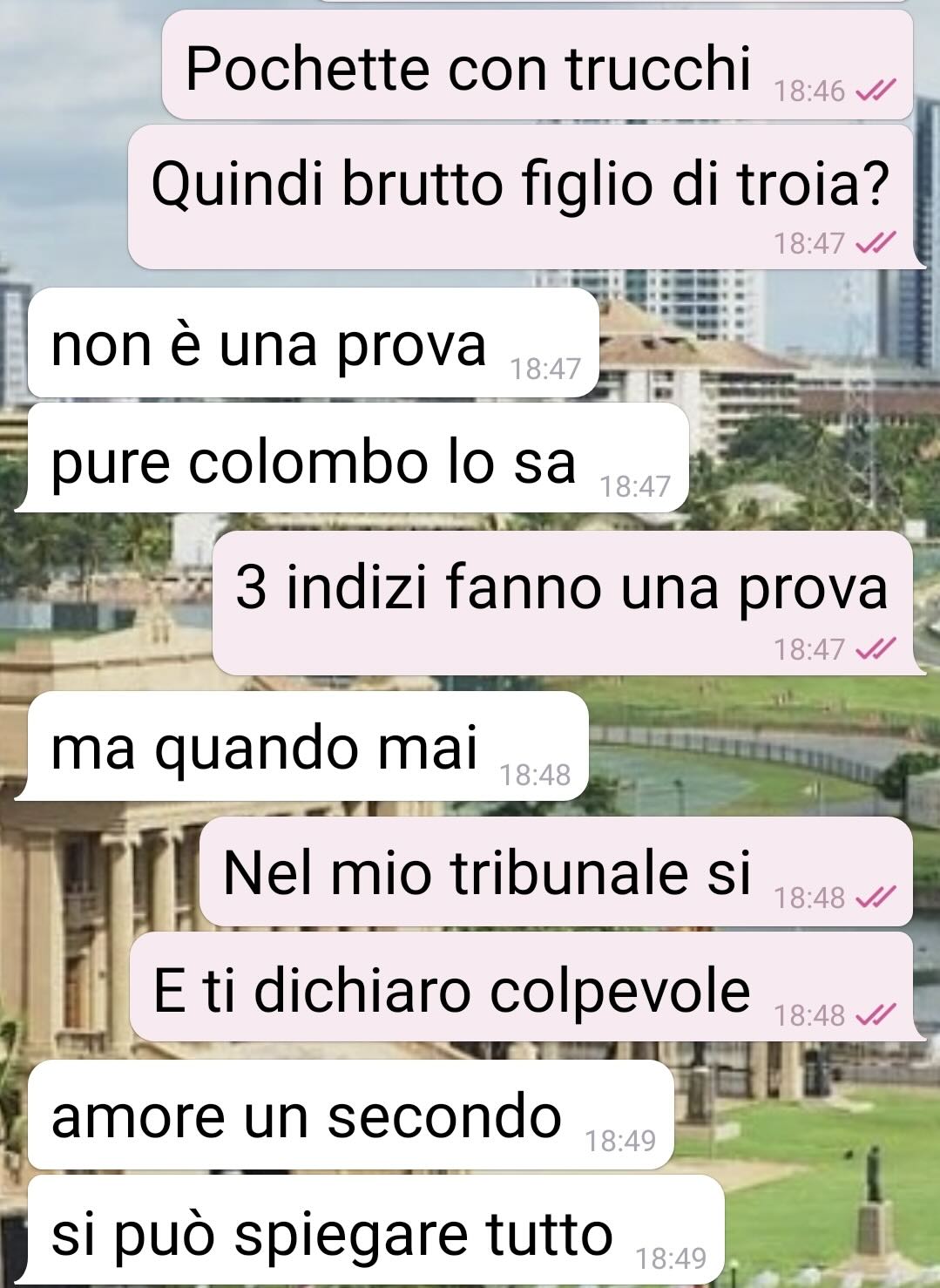 Quasi come in un episodio di Colombo, in cui l’assassino viene rivelato subito e il fascino è nel capire come il tenente giunga alla verità, anche lei svela fin dall’inizio chi è il “colpevole”: suo marito. La chat che invia mostra l’intero “processo investigativo,” mentre lei raccoglie gli indizi per capire le reali intenzioni del marito e scoprire cosa le sta nascondendo.