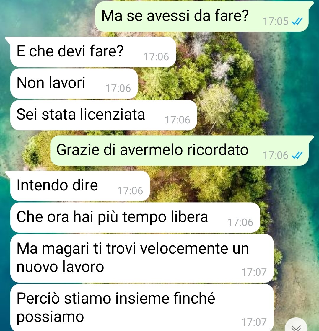 Sono Vita e sono una ragazza molto indipendente che si ritrova in una relazione in cui riesco a esserlo molto poco. A prescindere penso che non si possa essere totalmente indipendenti e avere una storia allo stesso tempo, che sia sempre necessario fare qualcosa per la coppia e vivere un po’ in funzione di essa, ma non significa che letteralmente tutto deve essere così. Dovete sapere che il mio ragazzo ha qualche piccolo problema di controllo, per usare un eufemismo. Infatti lui è tipo quel personaggio di Carlo Verdone in quel vecchissimo film, Furio mi pare che fosse o una cosa del genere. Lui ha molto la mania del controllo, non solo una cosa che sfocia in una terribile gelosia che riesco più o meno a controllare, ma è un po’ ossessivo compulsivo al punto che vuole ordinare tutto in casa mia, o fare le cose come secondo lui sono migliori. E non vi dico quando partiamo cosa mi combina. Ma non vi anticipo nulla di quello che leggerete nella storia che vi sto mandando, solo che mi giustifico dicendo che avevo bisogno di un po’ di tempo per me stessa, senza necessariamente mollarlo. Ma dico perché quando si è in una relazione bisogna per forza fare tutto insieme?