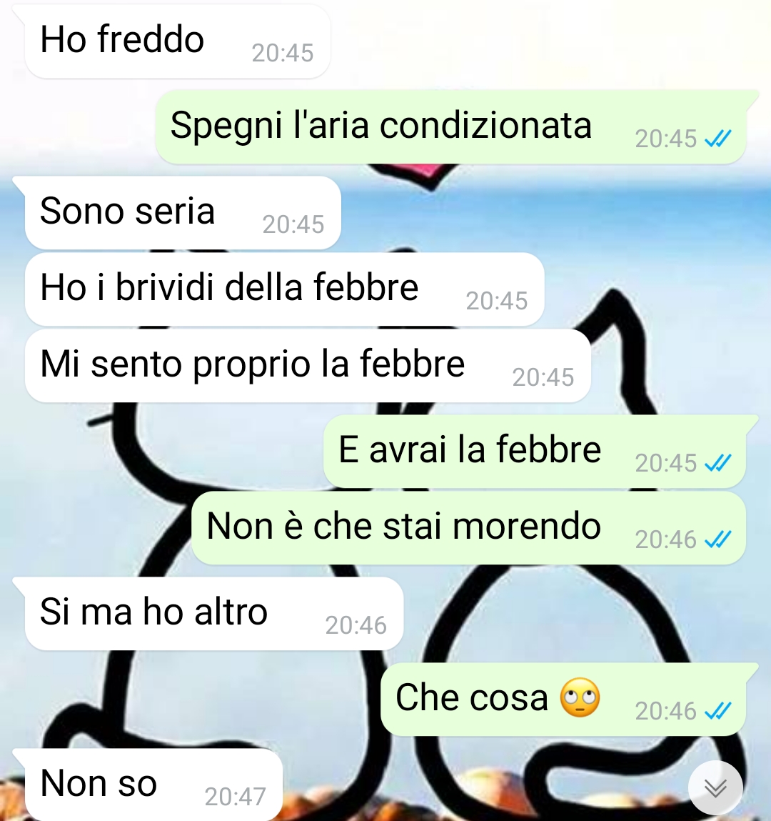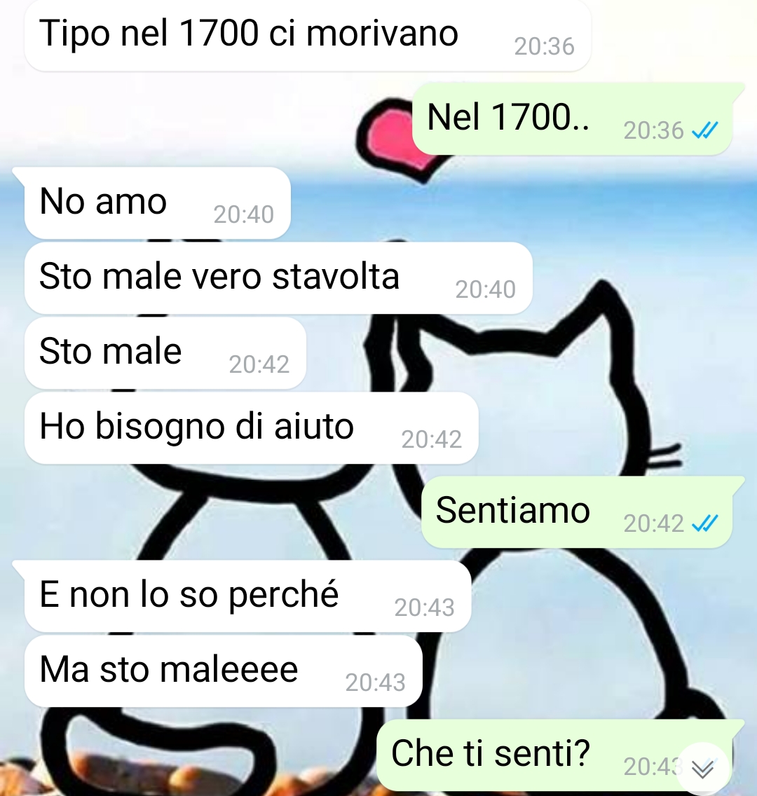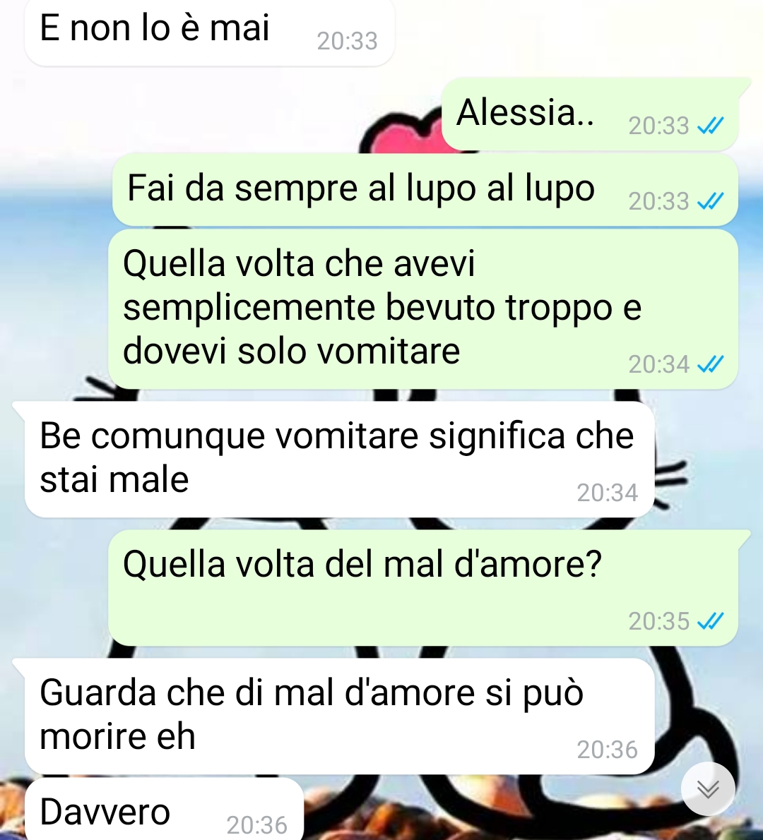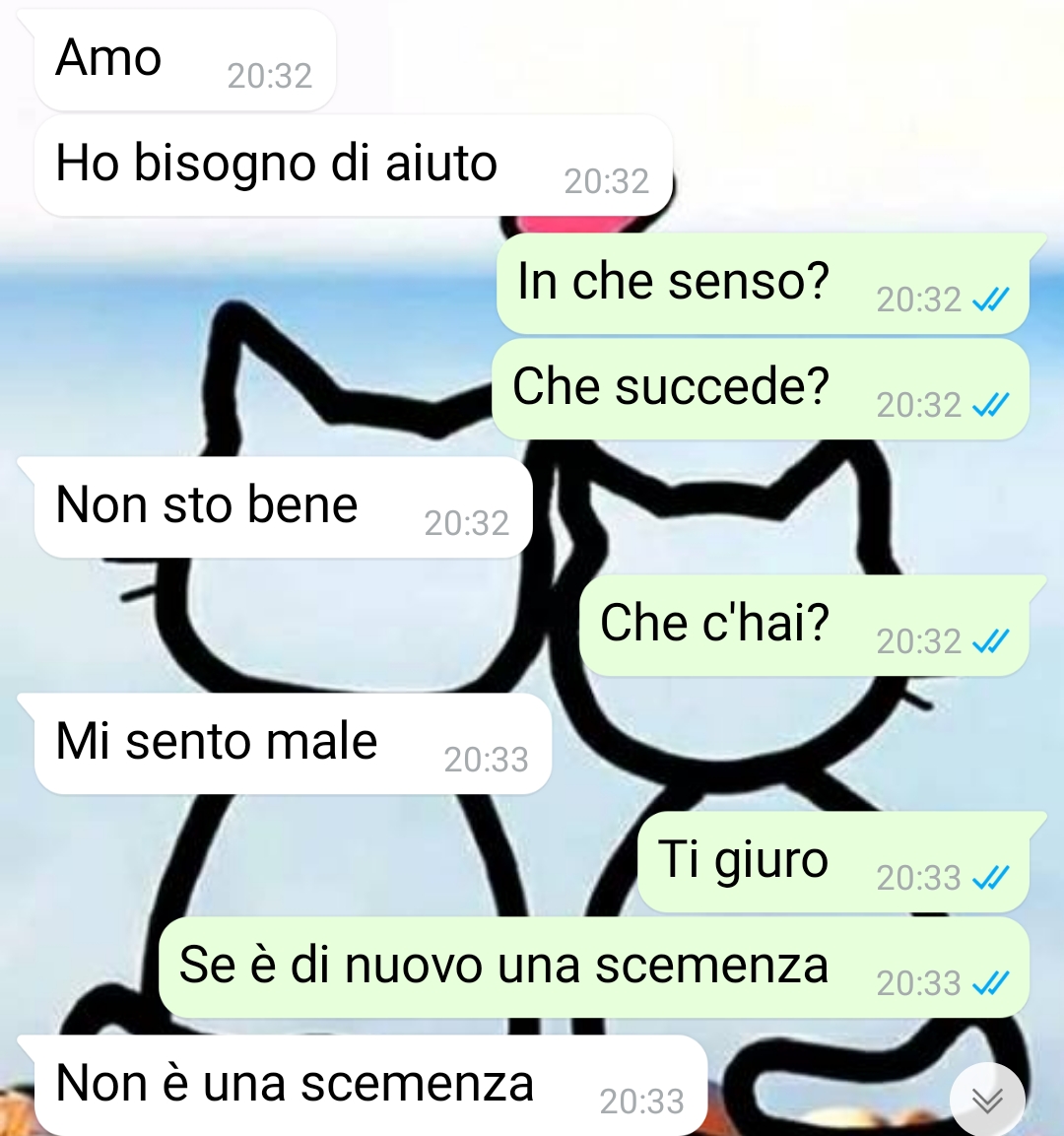Sono Damiano, ho 31 anni e mi ritrovo in una relazione con una ragazza che mi fa davvero sclerare, ma alla quale è impossibile non volere bene. Alessia diciamo che non è proprio una cima, si è ritirata dal liceo, ora di recente l’ha ripreso con le lezioni serali per finire gli studi, ma lei l’ha sempre ammesso, non è mai stata fatta per studiare o impegnarsi. Vien da sé che, come detto, non è proprio una cima, fa delle scelte discutibili come quella che leggerete nella storia, ma almeno sa scrivere in italiano corretto. Se fosse stata completamente ignorante non mi ci sarei mai messo. Ora, non voglio mica parlare male di lei che ci sto ancora, ma è per farvi capire il perché ha fatto quello che ha fatto. In ogni caso è anche una persona d’oro, affettuosissima, altruista, amorevole, simpatica, fa tanto ridere e la relazione con lei è sempre un piacere. Però ha dei momenti un po’ irritanti, come quando mi ha fatto credere che avesse un problema grave, che mi pare si era tagliata e c’era sangue ovunque e aveva bisogno di aiuto perché aveva male e dolore. Mi sono fatto una corsa a piedi, che non sta nemmeno vicina, e mi stava venendo un infarto nel frattempo, e poi mi dice che ha mal d’amore e che voleva solo un bacio ed essere abbracciata. Immaginerete quanto me la sia presa. E immaginerete che quando mi ha detto di stare di nuovo male non le ho creduto. All’inizio almeno…