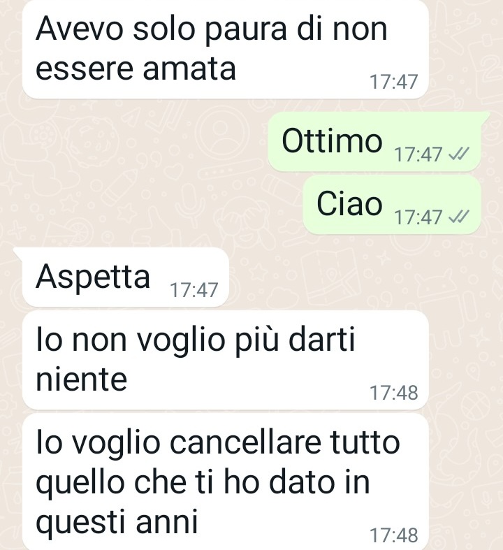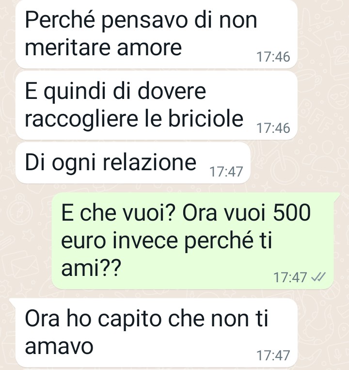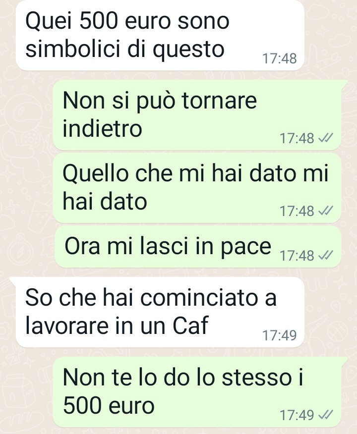 Secondo quanto racconta, la richiesta lo ha colto di sorpresa. Non capisce il motivo per cui la sua ex voglia indietro quella somma e, più ancora, il modo in cui gliel’ha comunicato. Per lui si è trattato di una manovra manipolatoria, un tentativo di farlo passare per cattivo o irresponsabile, cosa che lui respinge con forza.
