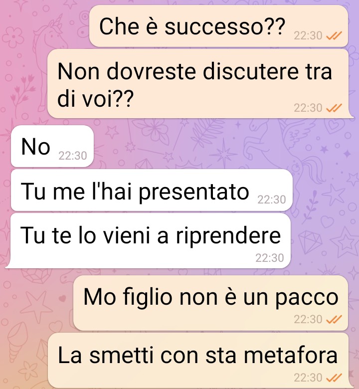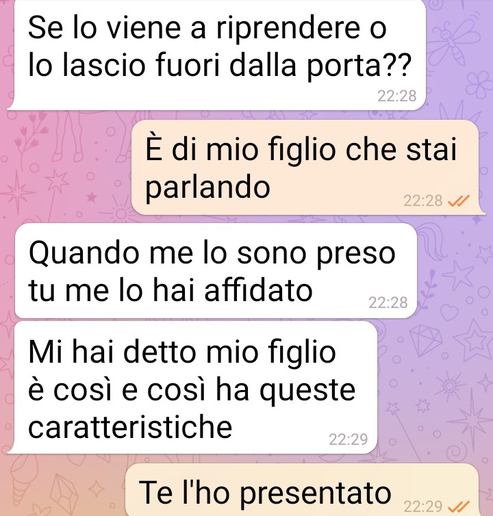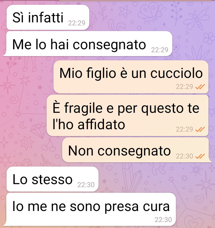 Mia “nuora” mi sta facendo il reso di mio figlio. Non vuole più stare col mio bambino. E me lo sta ridando. Res=tuendo come si fa con i pacchi. Io sono una donna giovane ok ma per queste cose non transigo. La compagna di mio figlio è una mia amica ma non si può permeEere di traEare mio figlio così né di dirmi certe cose, certe cose così così… vi mando la chat per dimostrare quanto le persone possono deluderci, persone amiche che invece ci pugnalano alle spalle e che per fu=li mo=vi ci abbandonano. Non esistono pregiudizi di nessun genere e a volte la persona che sembra più normale e buona si rivela la più caKiva come nel caso della mia amica, ora ex amica. Mi ha faEo il reso del mio bambino, ma come si permeEe e per un mo=vo del tuEo banale. Frivolo e sono sicura che è lei difeEosa. Non mio figlio. Ecco le immagini di questa chat. Ecco cosa si è permessa di dire. Non permeEete a nessuno d fare il reso di voi stessi. Ma cercate di essere sempre voi a dire basta, ad avere il potere se vi traEano male come ha faEo questa signora con mio figlio che è innamorato di lei come uno scemo.