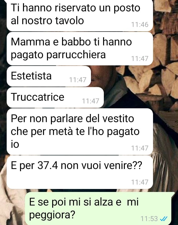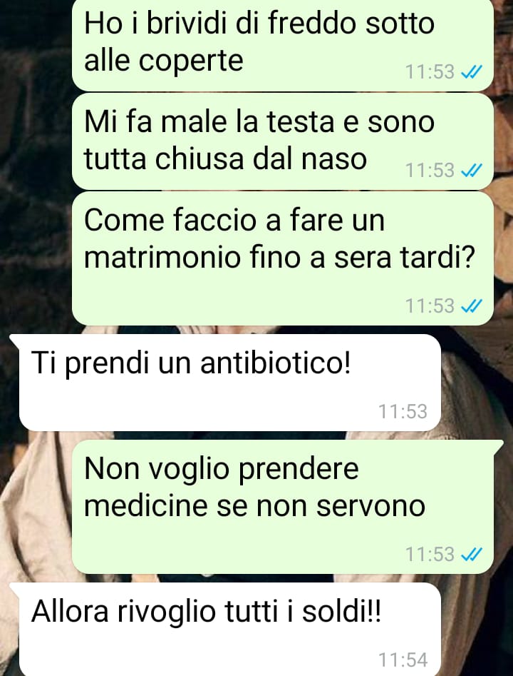 La nostra amica spiega che stanno insieme da abbastanza tempo da credere di conoscersi a fondo: gusti, difetti, pregi e fragilità reciproche. Tuttavia, proprio quella mattina, al risveglio con l’influenza, ha scoperto un lato del compagno che afferma di non aver mai visto prima. Dopo aver misurato la febbre, gli ha scritto per informarlo che non sarebbe potuta andare al matrimonio di suo fratello.