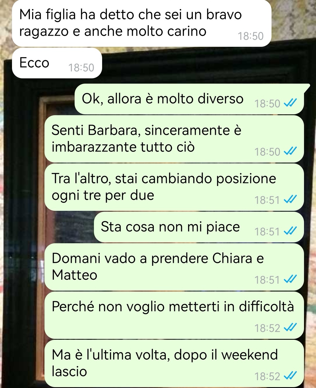 Recentemente, Barbara ha contattato Simone per chiarire la somma che gli doveva, ma la conversazione ha preso una piega strana e Simone si è sentito a disagio. Ha deciso di affrontare la situazione, esprimendo il suo imbarazzo riguardo a alcune frasi che percepiva ambigue. Questo ha scatenato una reazione da parte di Barbara, che si è arrabbiata. Simone ammette che alcune frasi avevano connotazioni poco chiare, ma ha sentito il bisogno di affrontare la situazione in modo diretto.