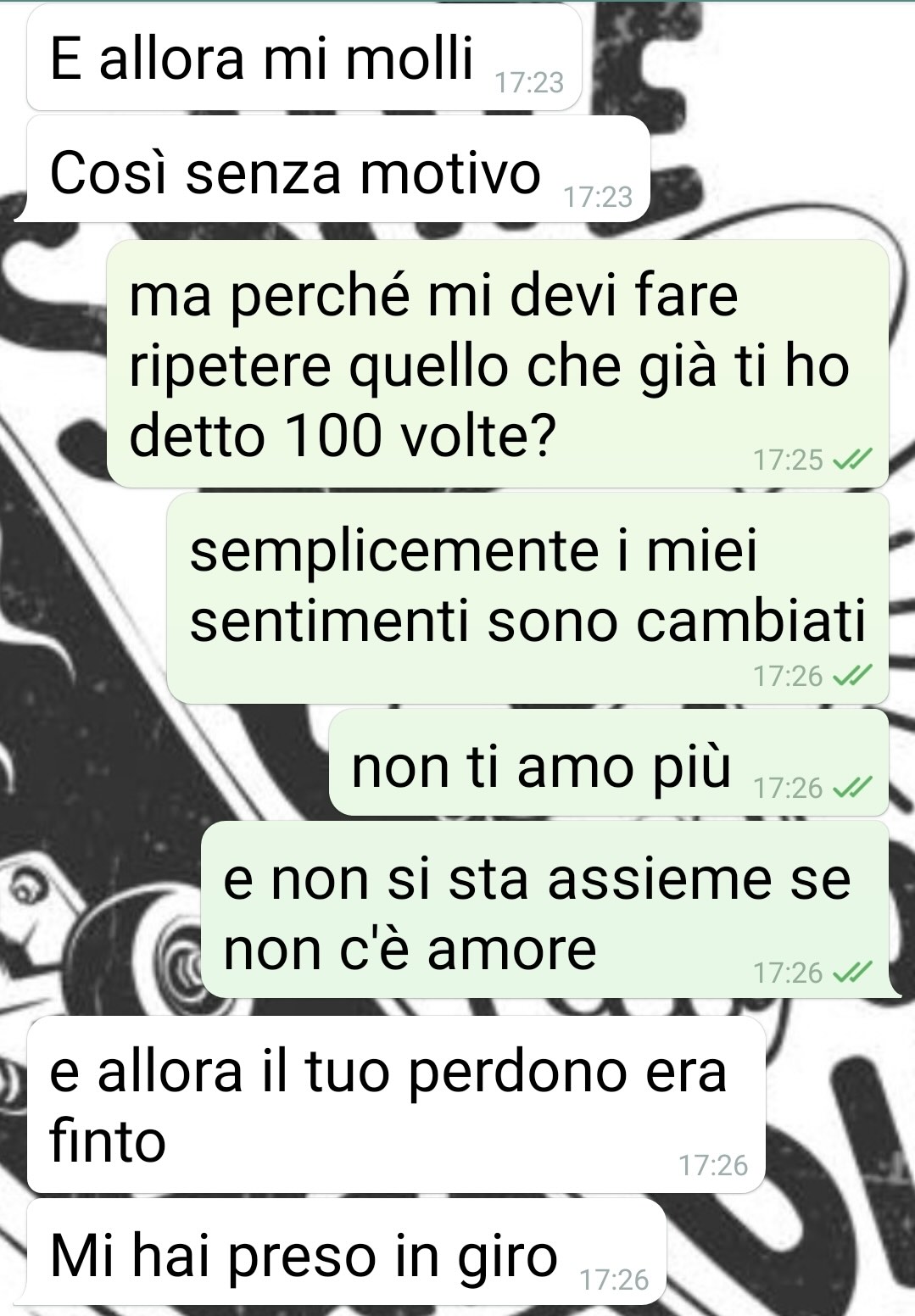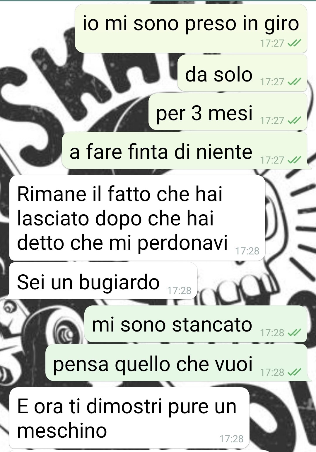 Un nostro fan ha voluto condividere con Commenti Memorabili una conversazione significativa avvenuta tra lui e la sua ex fidanzata, con cui ha avuto una relazione lunga e importante, durata oltre quattro anni. La storia tra i due è terminata dopo un tradimento da parte di lei, descritto come una sbandata isolata. Nonostante il dolore, il nostro amico ha scelto di perdonare, cercando di salvare il legame.