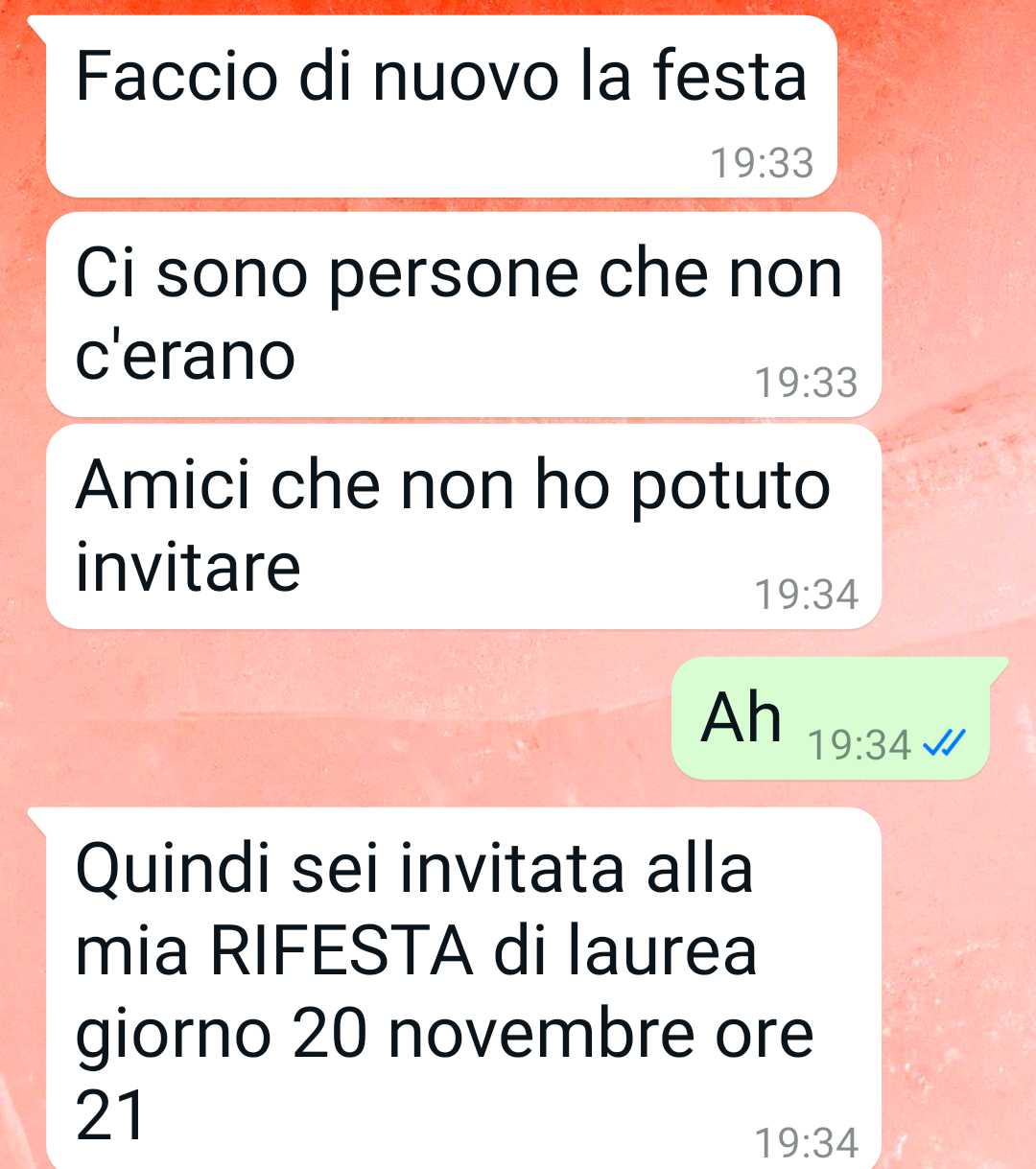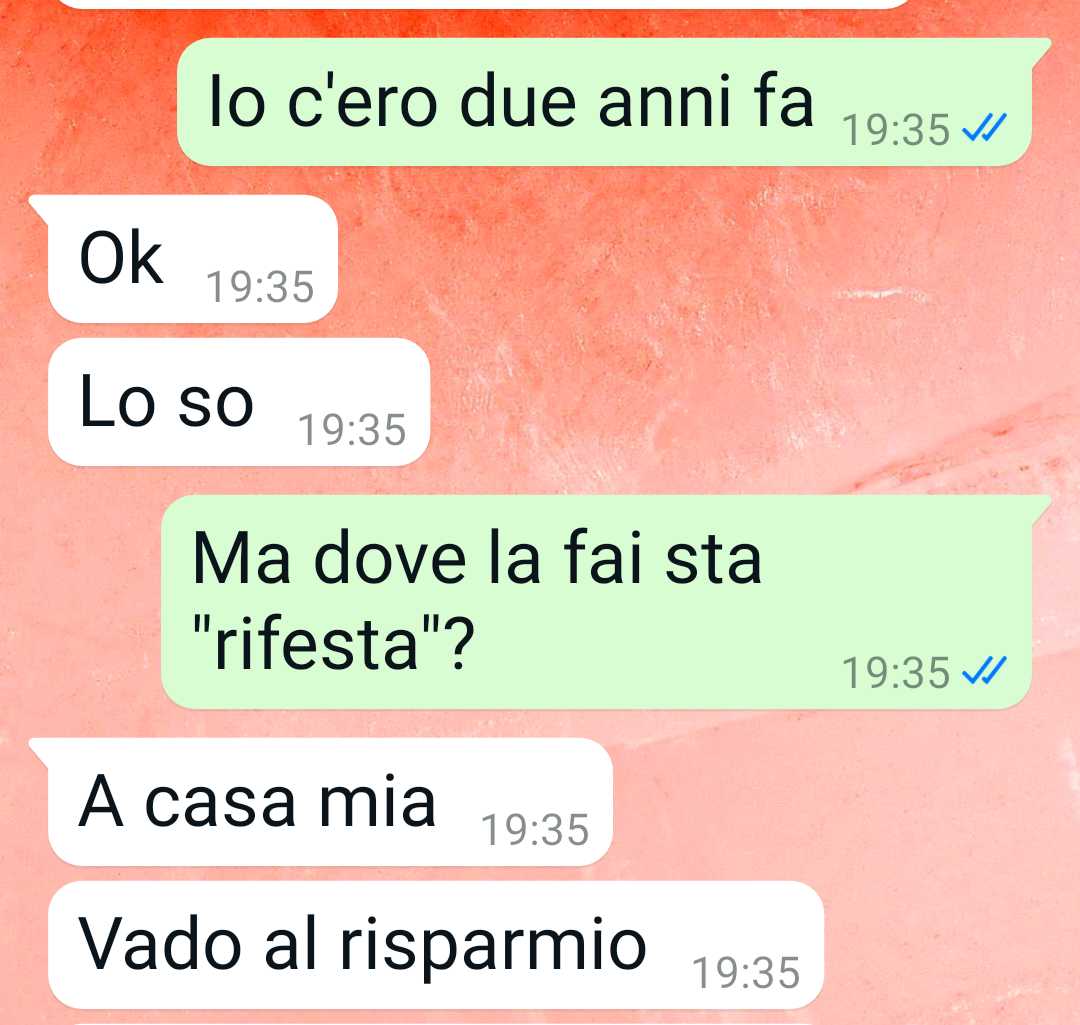 La mia amica Teresa festeggia la sua laurea dopo due anni. È la seconda festa che fa. Io alla prima c’ero!! Ancora deve scroccare?? La mia amica si è laureata due anni fa. Qualcuno però non è potuto venire e lei adesso vuole fare una RIFESTA DI LAUREA, come la chiama lei. Vuole cioè festeggiare di nuovo la sua laurea. C’è un problema: io già due anni fa c’ero, porca miseria! Le ho fatto un bellissimo regalo, le ho regalato una collana d’argento con un ciondolo a ninfea, se sapevo che finiva così me la tenevo io quella collana bellissima. Lei è una di quelle persone viziate, figlia unica, i cui genitori pigrissimi nell’educazione, le fanno passare ogni capriccio. Teresa dice che vuole fare un’altra festa di laurea dopo due anni e i suoi genitori gliela fanno rifare. I miei genitori mi avrebbero mandato cordialmente a cag***. Ma è giusto, cioè ci vuole un limite. Io sono un tipo amichevole, cioè te le dico le cose ma cerco sempre di non perdere rapporti anche quando sono logori e stanchi. Il finale di questa storia è da terrore… penso che per i prossimi 5 anni emigrerò all’estero.