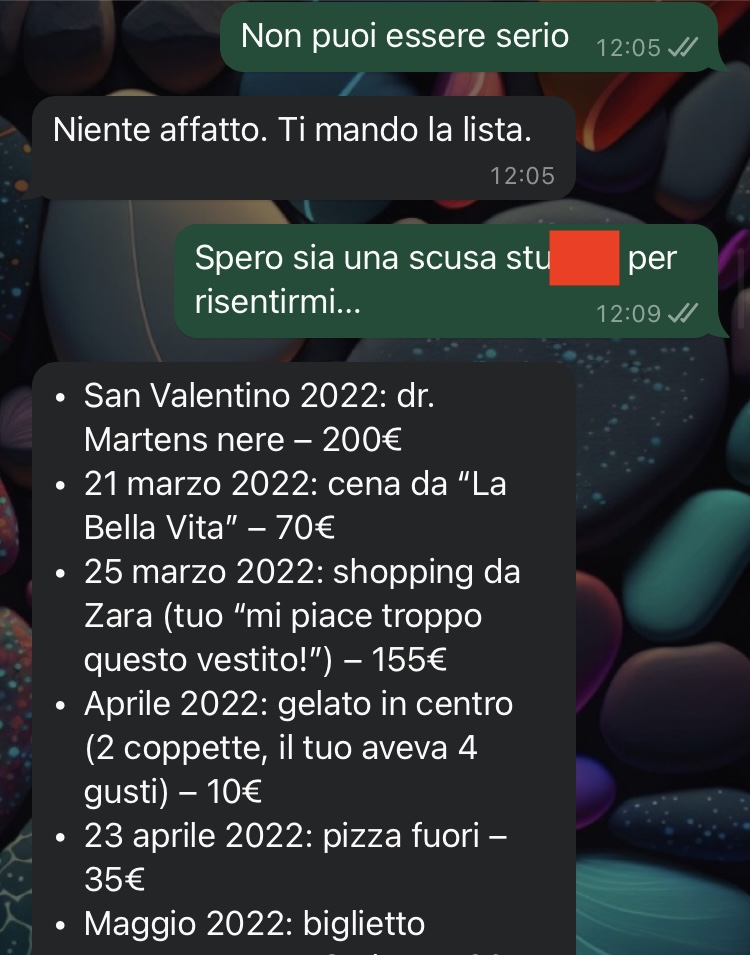Ciao amici della community di Commenti Memorabili. Sto attraversando un periodo un po’ complicato: io e il mio ex ci siamo lasciati da poco. È stato lui a lasciarmi, ma devo ammettere che le cose non andavano più bene: dopo il classico periodo da “farfalle nello stomaco” è arrivata la monotonia, e con essa anche i primi litigi e incomprensioni. Abbiamo capito di non essere fatti l’uno per l’altra. Però è stata dura essere lasciata. È difficile accettare la fine di una relazione, soprattutto dopo aver condiviso momenti bellissimi insieme dove tutto sembrava perfetto. Per questo è stato ancora più difficile realizzare che qualcosa si era spezzato. Comunque, mi ha lasciata e io sono sprofondata in giorni di pianto in cui non volevo neanche uscire di casa per via del mio cuore spezzato. Ma quello che non mi sarei mai aspettata è ciò che è successo dopo. Invece di lasciarmi il tempo per metabolizzare tutto, mentre stavo praticamente affogando tra le lacrime, lui mi ha mandato una serie di messaggi che, sinceramente, mi hanno lasciata senza parole. Non voglio rovinarvi la sorpresa, ma vi dico solo che ho dovuto rileggerli più volte per credere che fossero reali. Sono curiosa di sapere cosa ne pensate, perché io non so davvero come reagire. Vi è mai successa una cosa del genere? Ecco le chat…