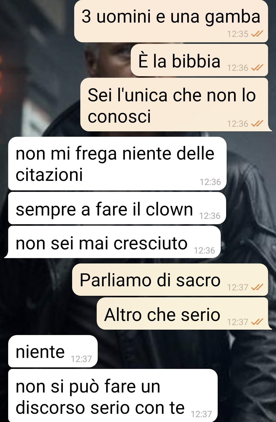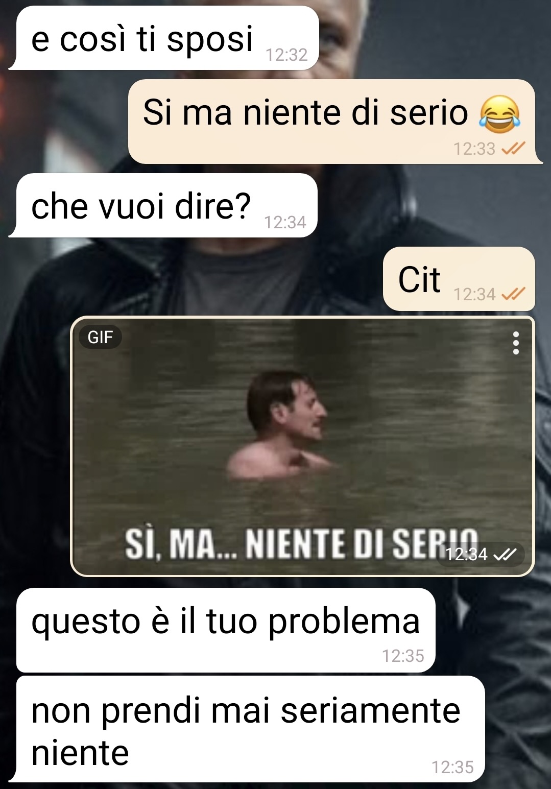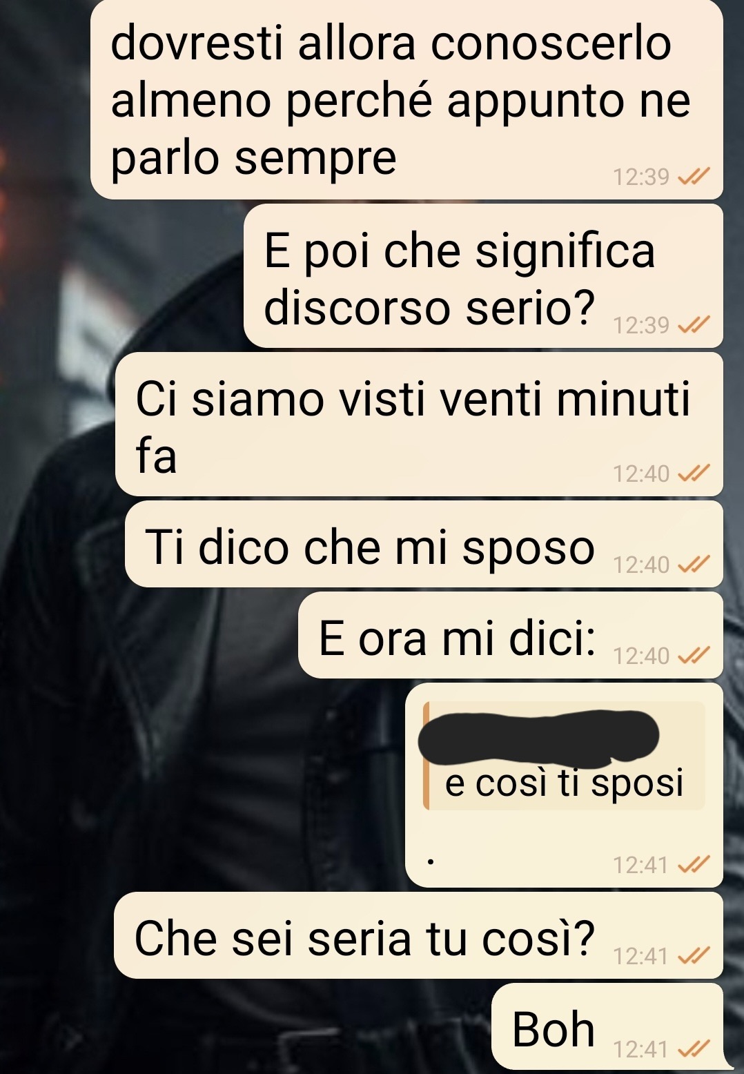 La mia amica non è contenta del fatto che stia per sposarmi. E mi ha spiegato le sue mo2vazioni. Vi seguo da tanto ormai e mi spiaccico quando trovo storie con citazioni o che ricalcano qualche opera conosciuta. Sono un appassionato di tu/o ciò che è cult, che va quindi conservato, ricordato e citato. E nel mio piccolo questa chat ha tu/o per diventare un cult. Si tra/a di una discussione con la mia amica Flavia. La conosco da almeno 10 anni, mi ero pure innamorato di lei e lo sono stato fino a quando, dichiarandomi, lei mi respinse. Ma ne è passata acqua so/o i pon2. Ho poi conosciuto Patrizia e abbiamo deciso di sposarci. Lo dico alla mia amica speciale Flavia in un brunch ma/u2no. Non se lo aspe/ava, ma mi augura il meglio, a me e a Patrizia. Passano 20 minu2 però e mi scrive. Io non dovrei sposarmi a quanto pare. E non scherza, quello lo faccio io sempre. Lei mai. Leggete da voi perché dovrei mandare a monte il matrimonio e pure Patrizia.