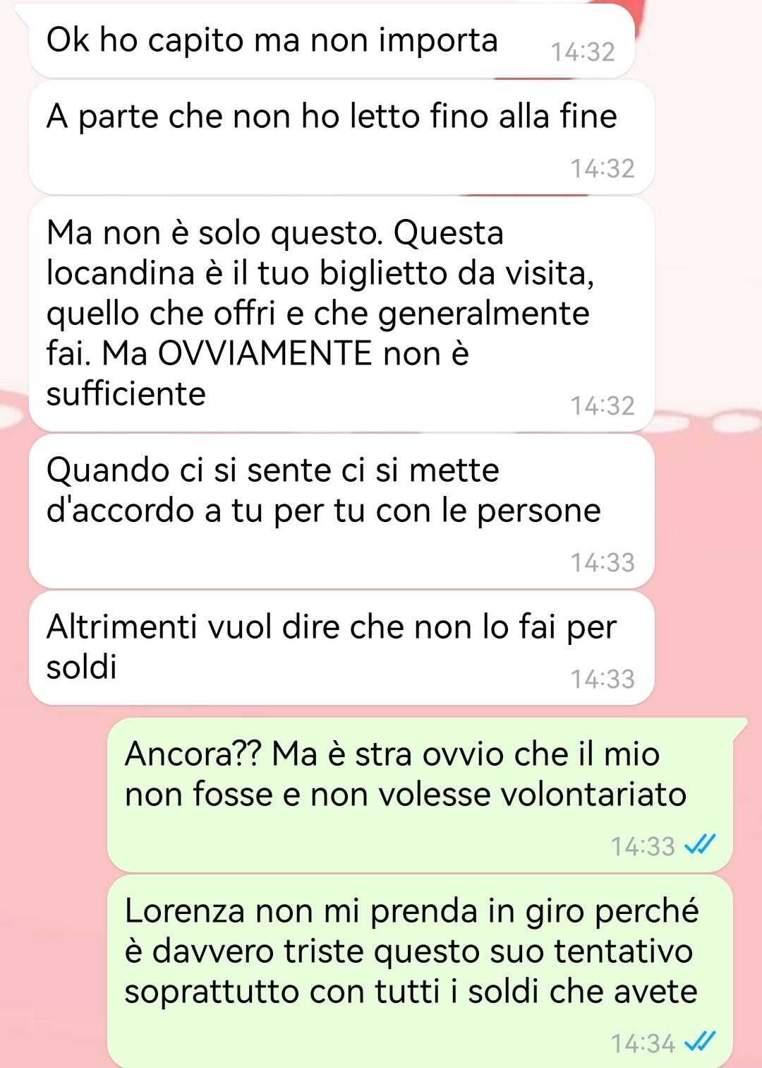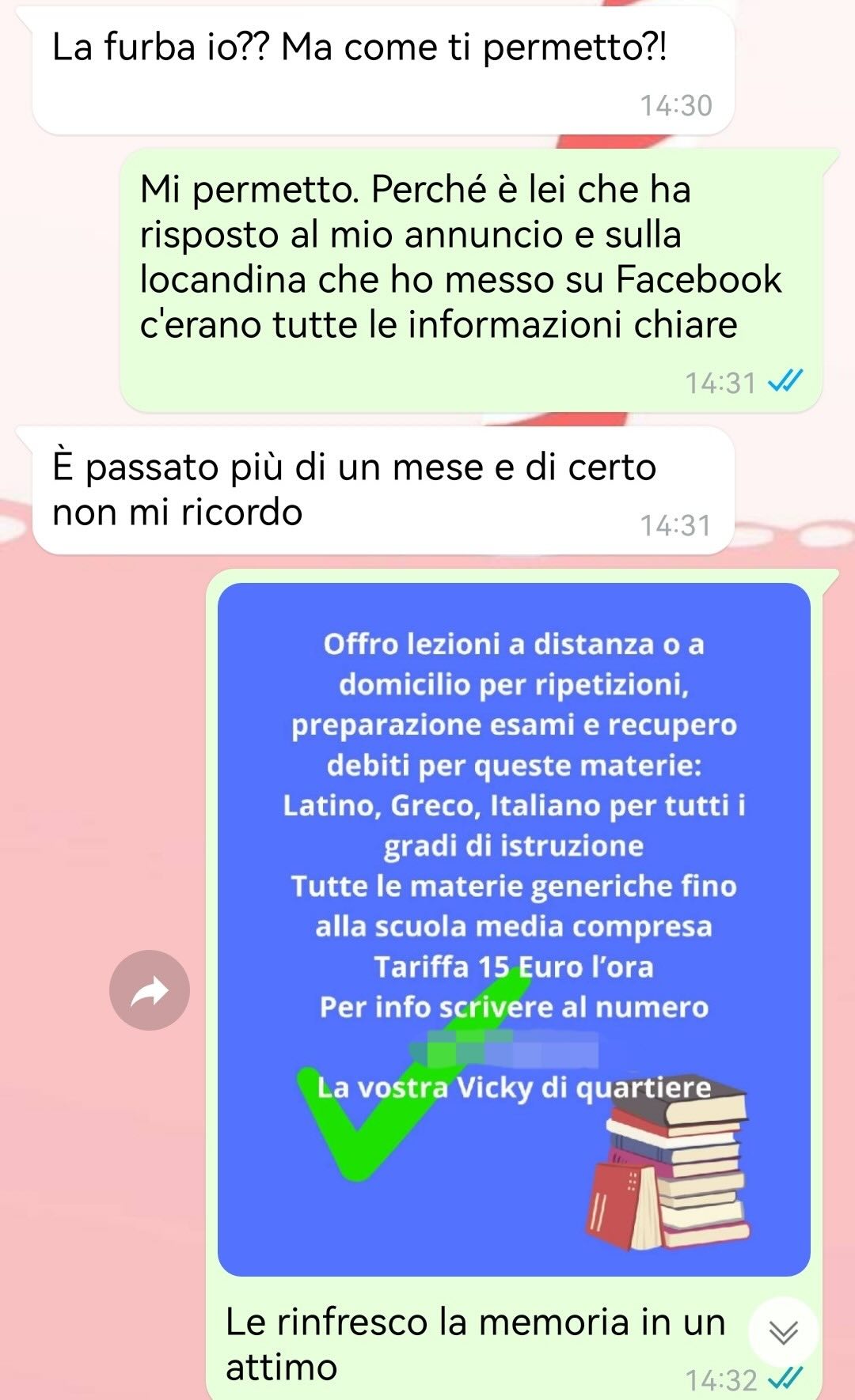 Tiene particolarmente alla questione economica, consapevole che per molte famiglie le ripetizioni rappresentano un sacrificio. Per questo motivo ha deciso di proporre un prezzo che ritiene molto onesto, forse anche troppo, ma che le consente di continuare a svolgere la sua attività con soddisfazione e rispetto verso chi si affida al suo aiuto.
