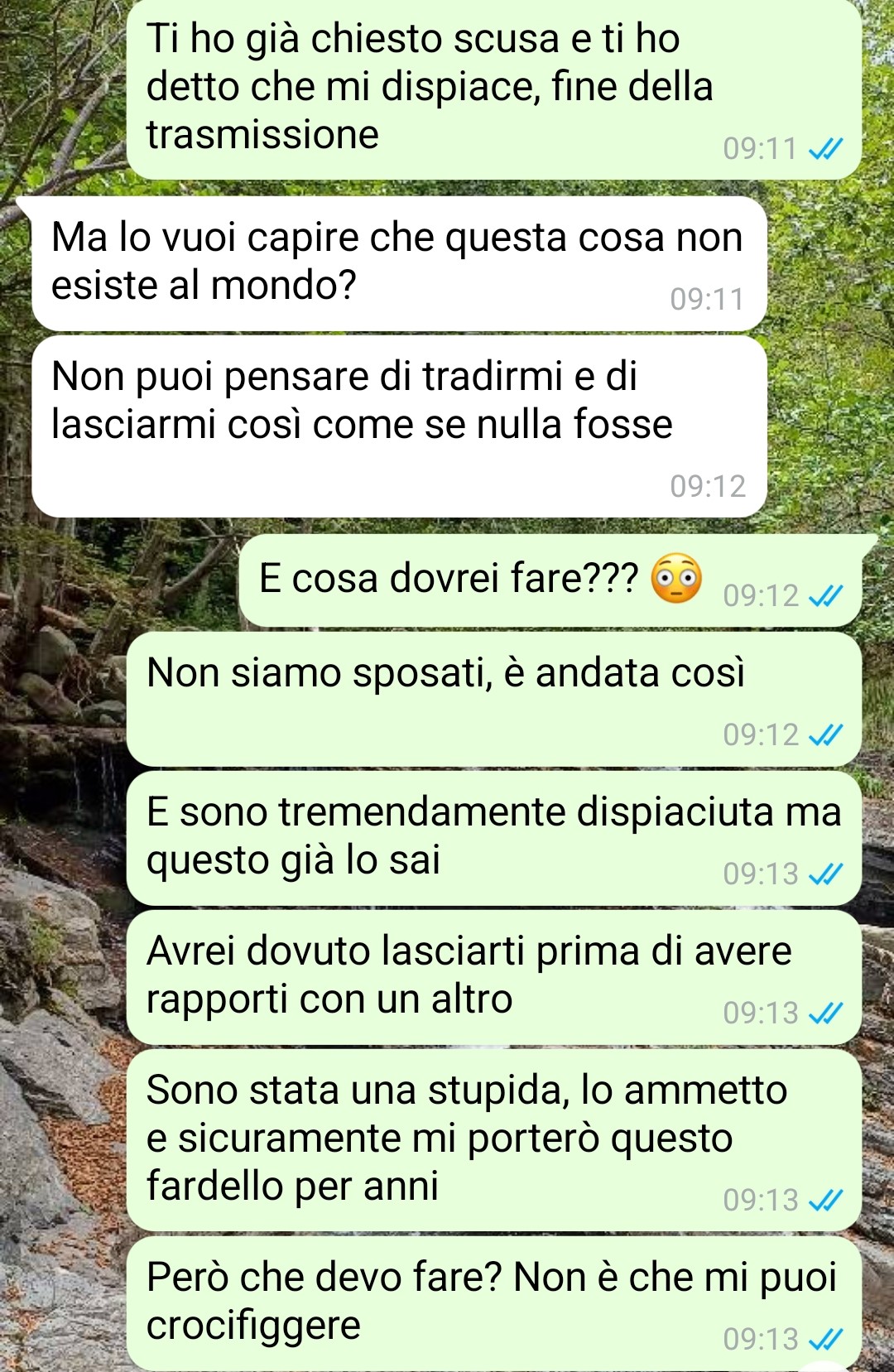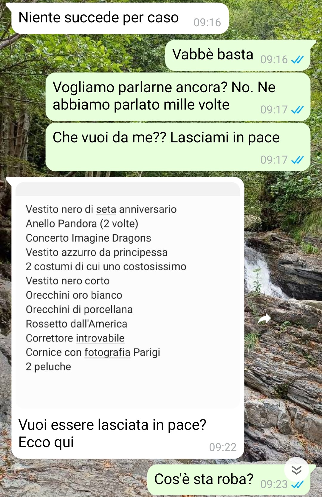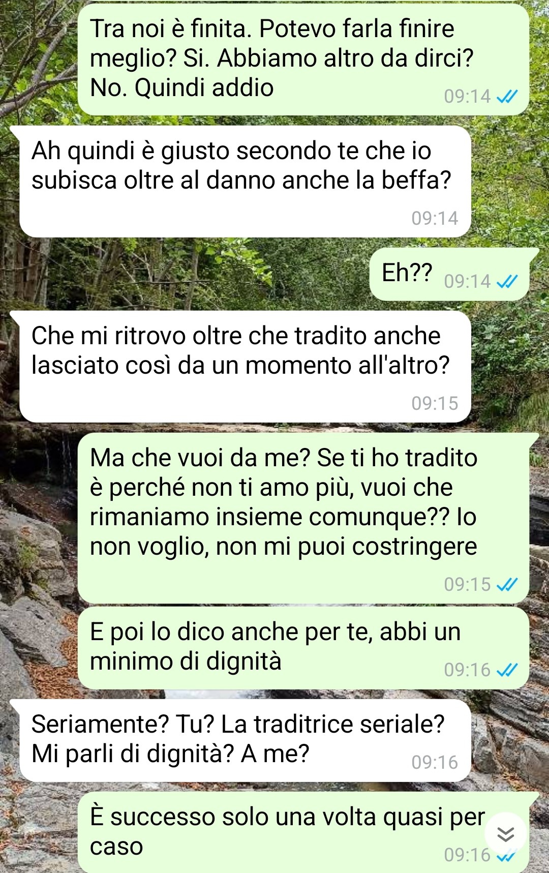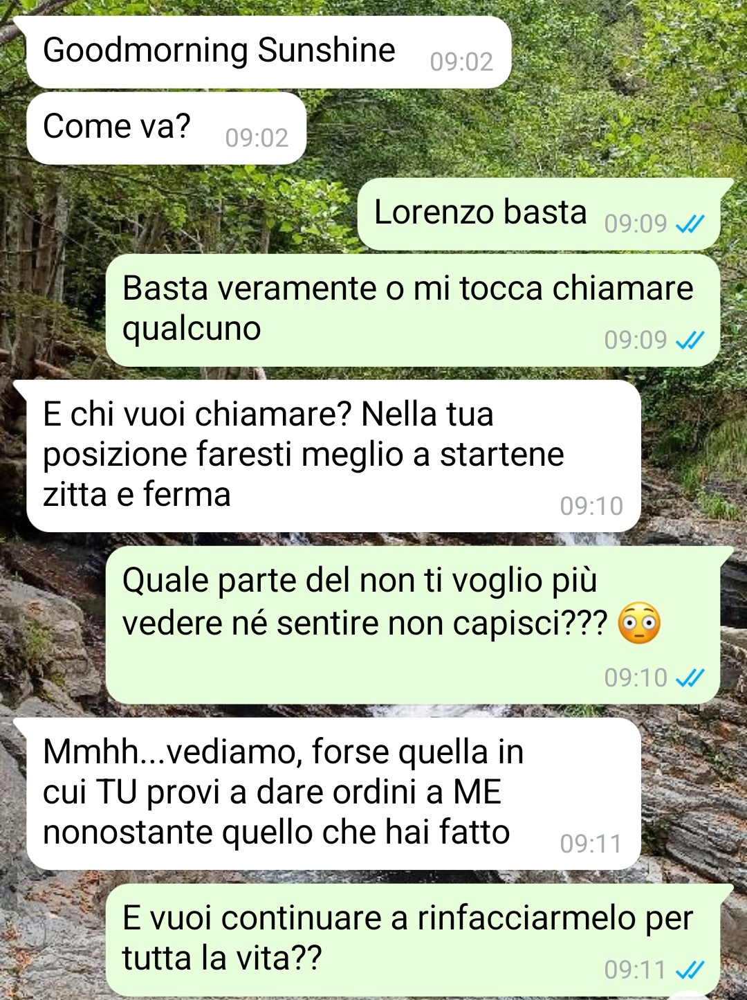 La conversazione che sto mandando purtroppo non è l’ultima che ho avuto con il mio ex fidanzato Lorenzo (perché poi la situazione si è evoluta ulteriormente e in peggio) ma sicuramente è una delle più significative che fa capire con che razza di ragazzo sono stata negli ultimi due anni e mezzo. E mi sto trattenendo perché potrei dirne anche di peggio ma lo vedrete voi da soli. Ci siamo conosciuti poco meno di tre anni fa. All’inizio facevamo parte dello stesso gruppo di amici, abbiamo cominciato ad uscire tutti insieme ed entrambi eravamo ben consapevoli che ci fosse del feeling. Ci lanciavamo occhiate, sorrisi e da cosa nasce cosa e, circa due anni e mezzo fa, quindi dopo qualche mese da quei primi momenti, ci siamo messi insieme. All’inizio andava bene ma come spesso succede non tutto dura per sempre, l’amore, soprattutto da parte mia, è svanito giorno dopo giorno ed entrambi, anche io, siamo arrivati a scelte drastiche di cui, perlomeno per quanto mi riguarda, non vado fiera e me ne pento spesso. Però la storia si era chiusa e ci eravamo lasciati. Poi lui mi ha riscritto e da lì è cominciato l’inferno.