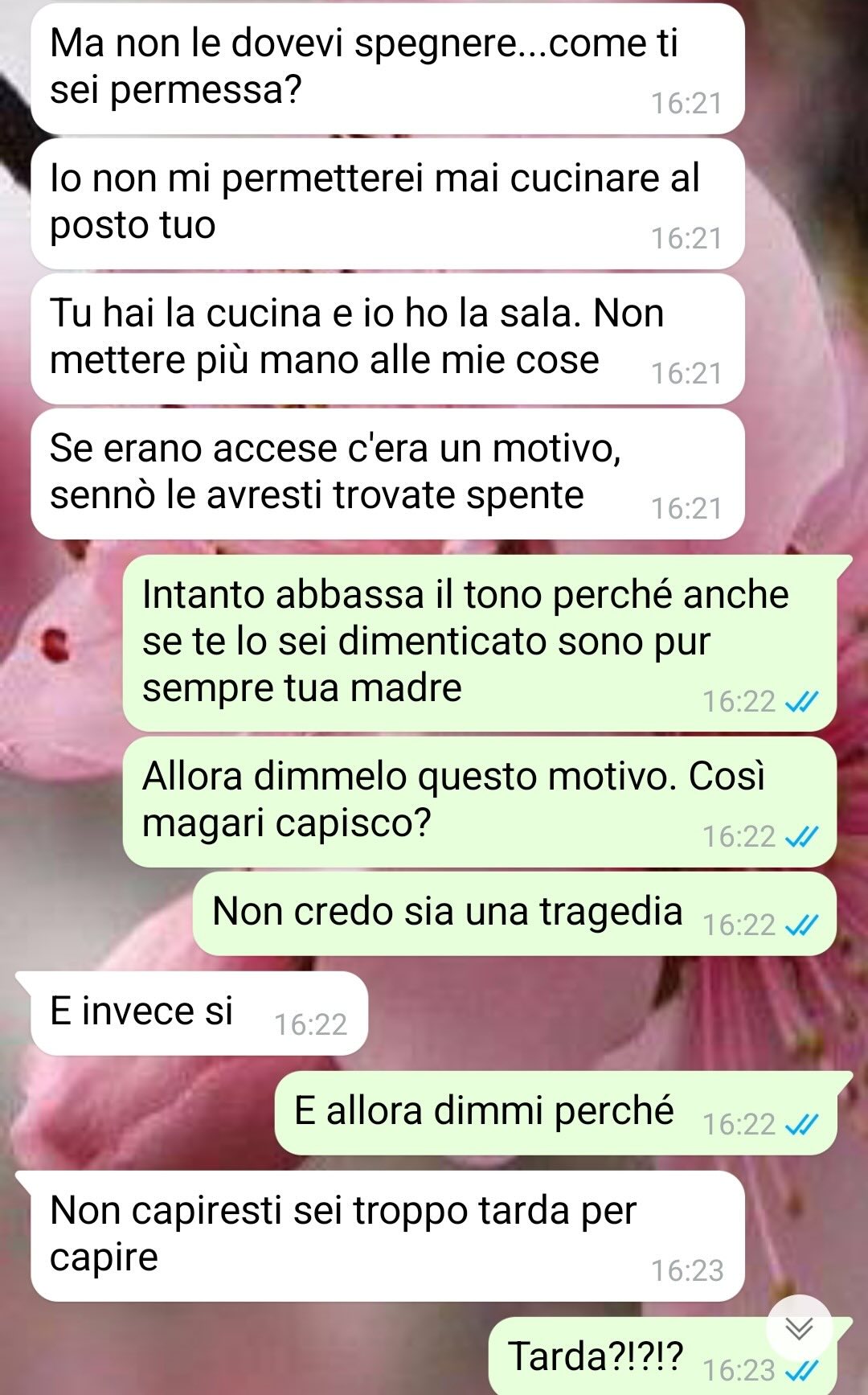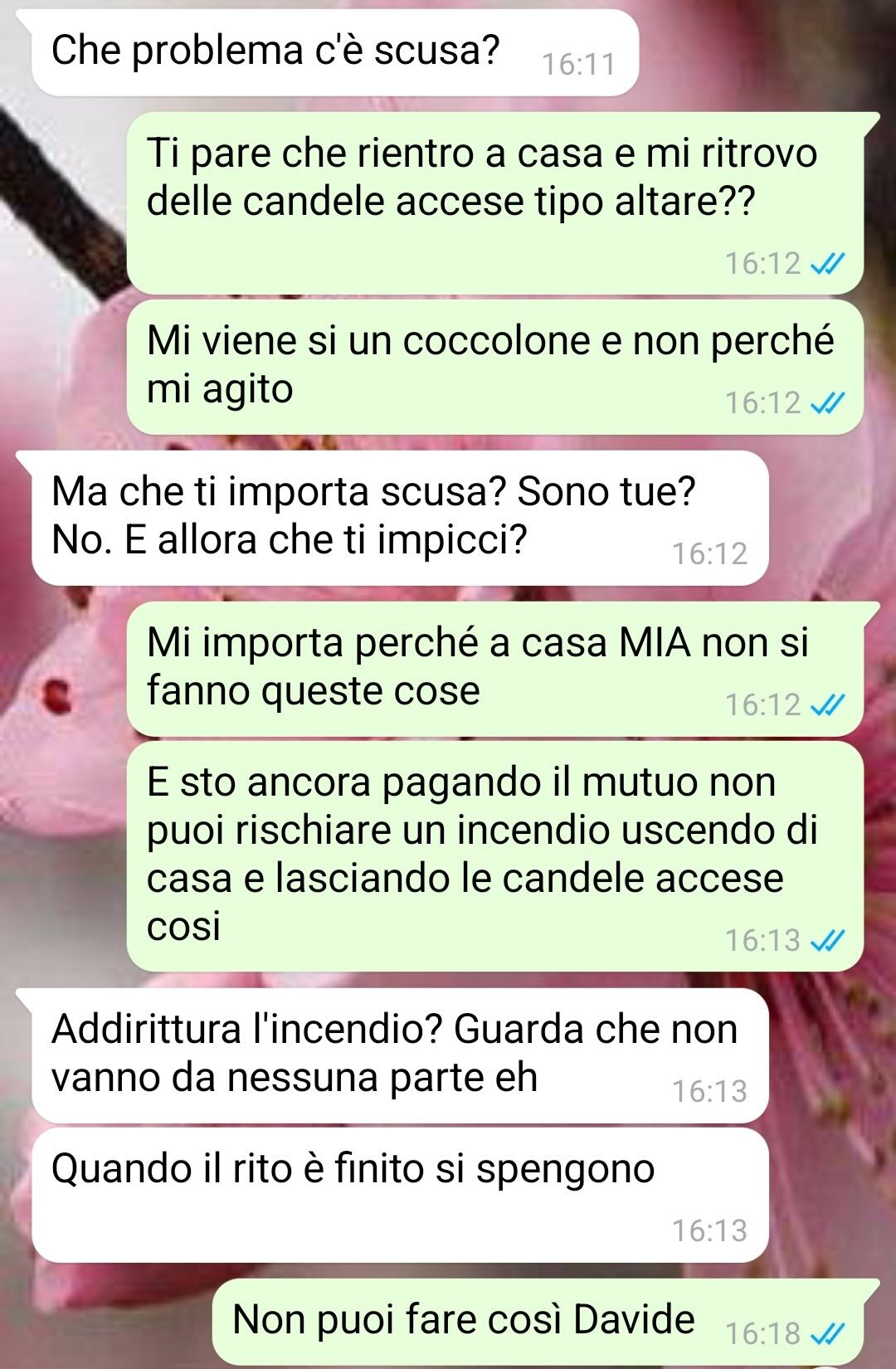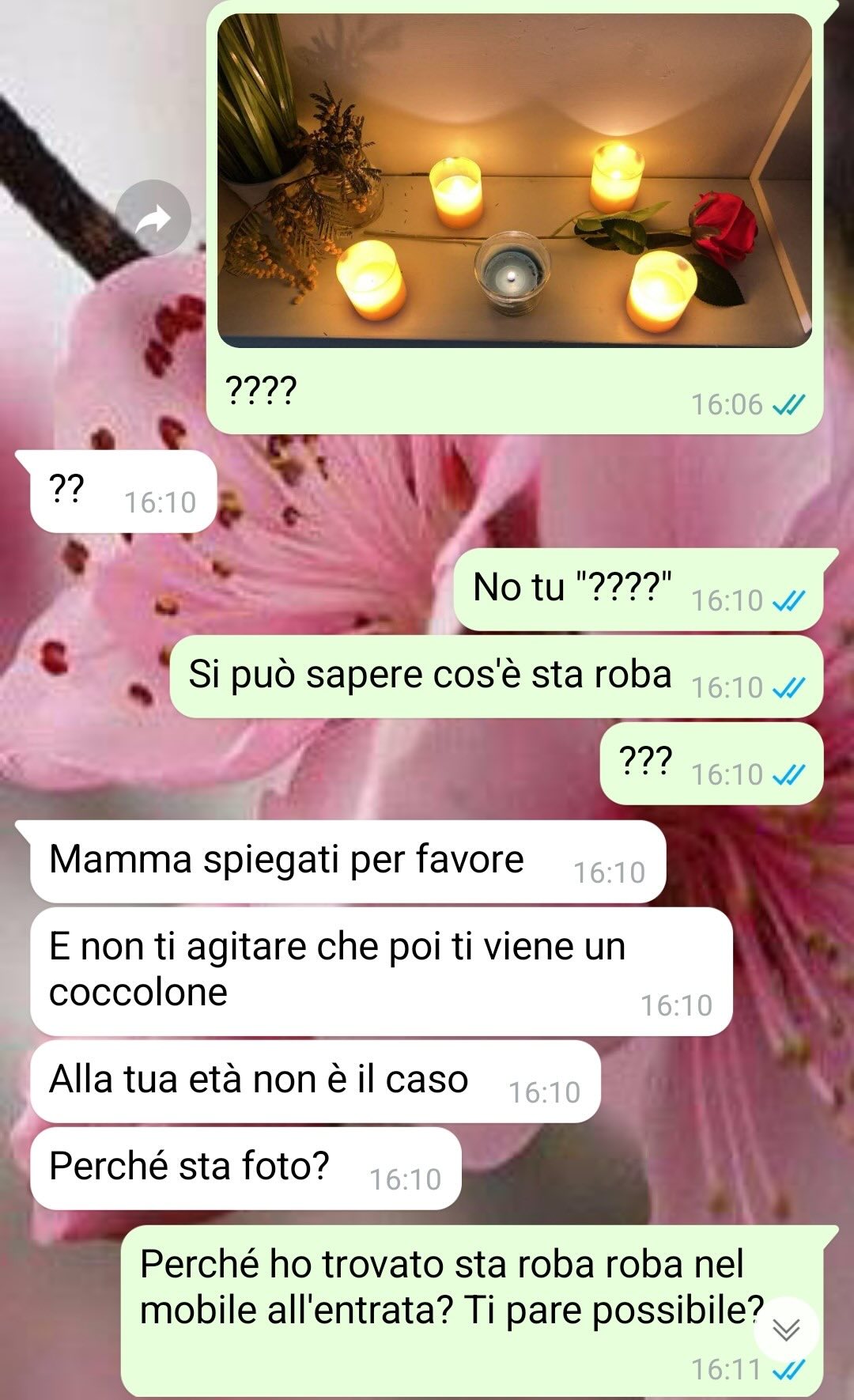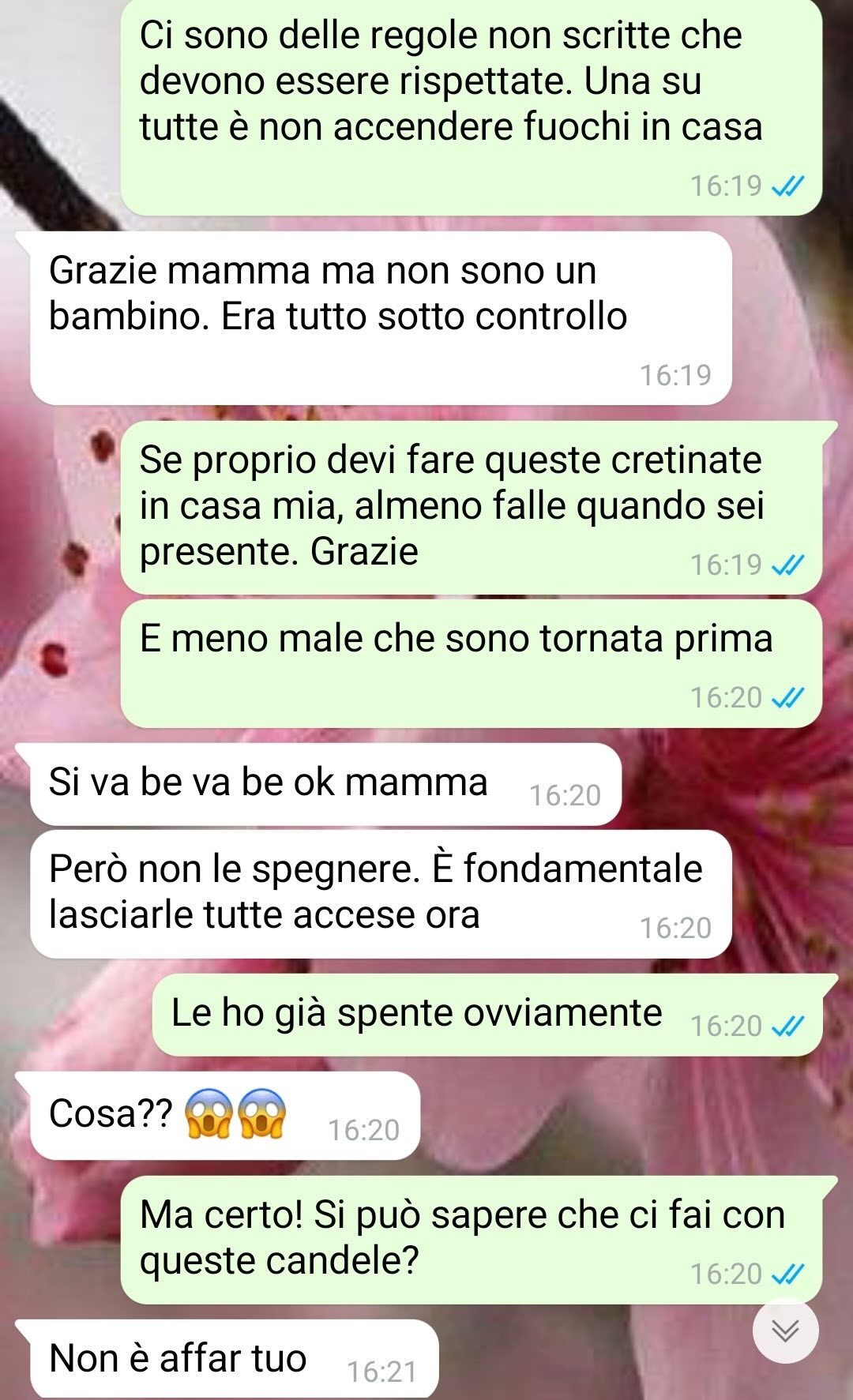 Sono una madre di poco meno di settant’anni e ho un figlio di trent’anni, Davide. L’ho cresciuto da solo perché suo papà mi ha abbandonata quando sono rimasta incinta, e da li è stato tutto in salita. Ad ogni modo io mi sono rimboccata le maniche e ho cercato di fare il meglio che potevo per educare Davide come si deve e non fargli mancare nulla, e pensavo di esserci riuscita. Lui è un carissimo ragazzo, ma devo ammettere che ha molti difetti e alcune stranezze non da poco. All’inizio pensavo fossero delle fasi, e alcune cose in effetti lo sono state, ma dopo quest’ultimo episodio, che potete leggere nella chat che ho inviato, ho davvero poche speranze che possa tirarsi di qua e darsi una sistemata. Il mio peggior timore è di dovermene occupare io ancora per molto tempo, cosa che non troverei né sana né giusta nei miei confronti. Mi sono già fatta un mazzo così a sufficiente, ora alla sua età è il caso che si dia una svegliata e diventi autonomo! Ma di questo passo, con giochi di candele e teorie strane, non so dove possa andare…è ora di intervenire duramente.