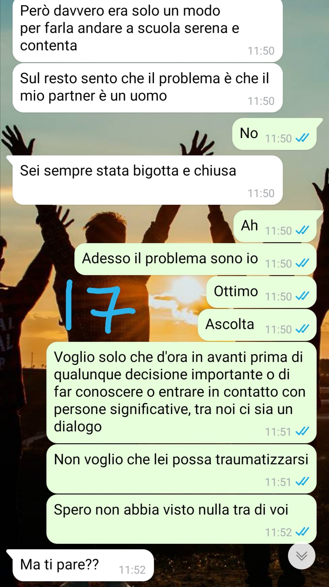 Silvia descrive la rabbia che ha provato non appena ha visto Ambra e dopo aver ascoltato le parole della maestra. Esprime la sua frustrazione e si rivolge alle altre mamme che potrebbero comprendere il suo stato d’animo. Condivide la chat che ha scatenato una discussione accesa, chiedendo come avrebbero reagito le altre persone in una situazione simile.