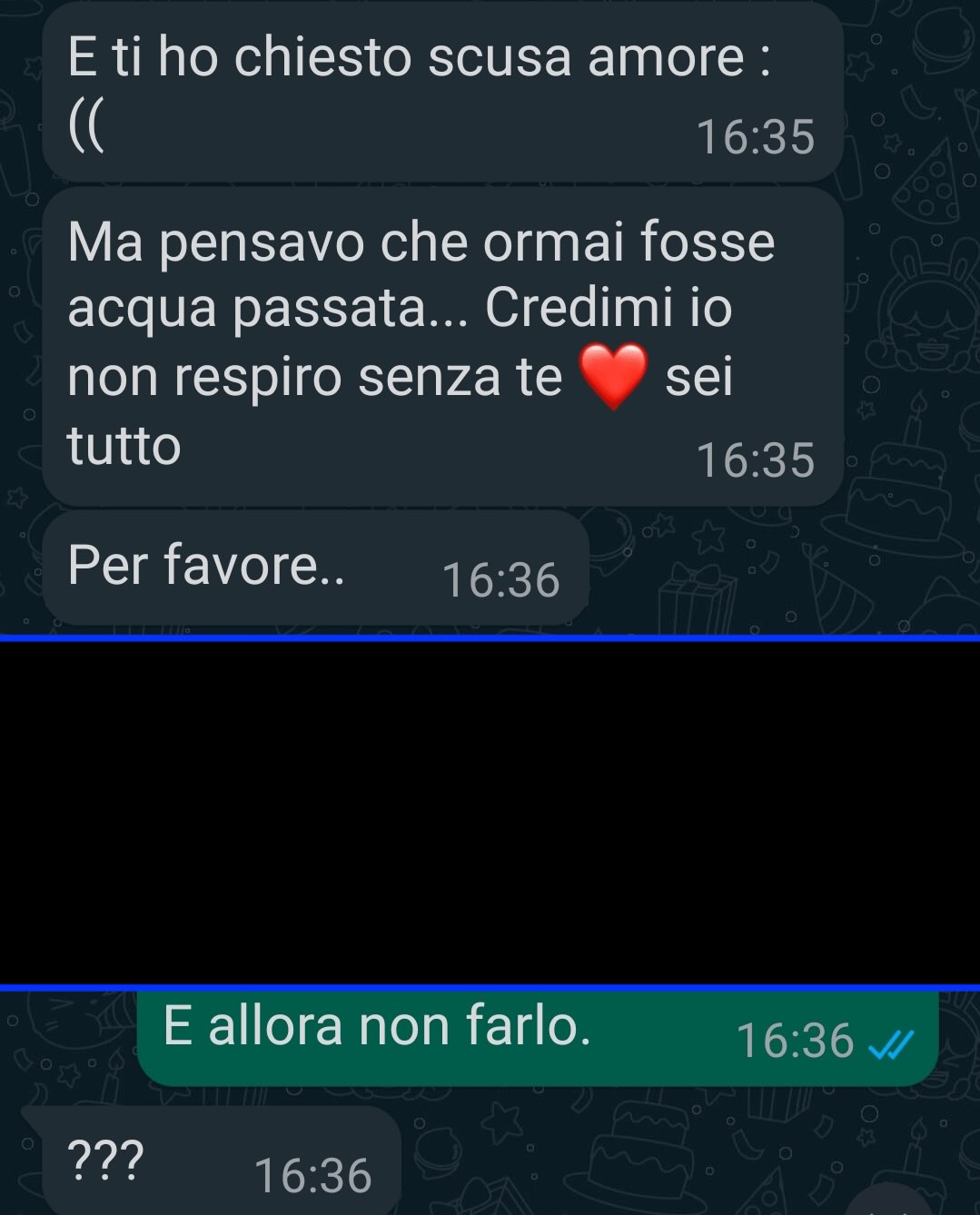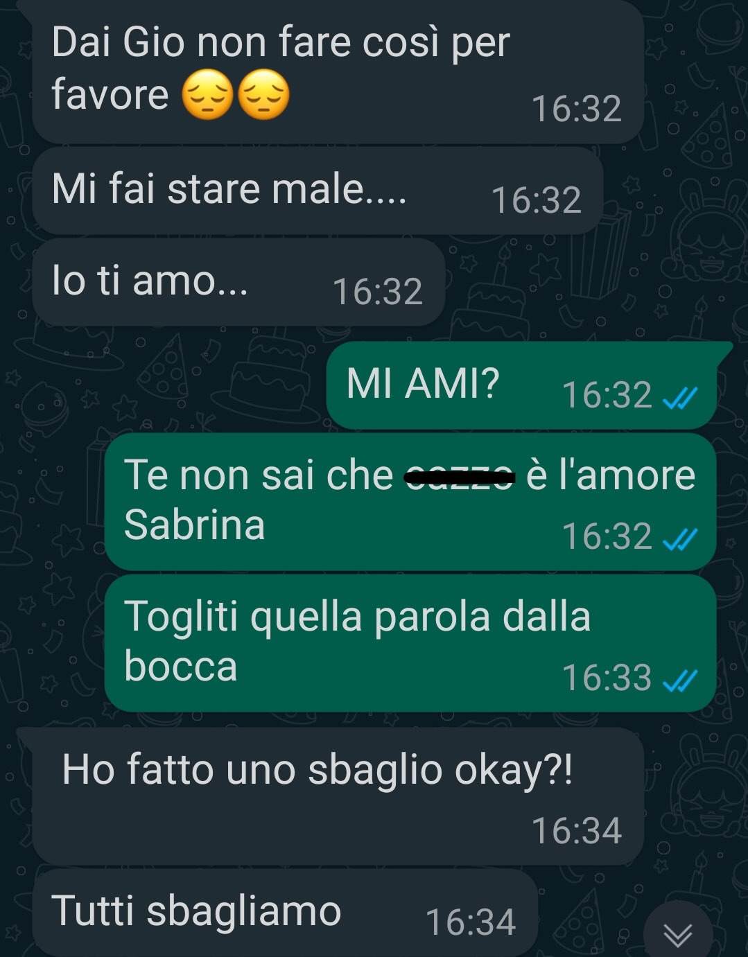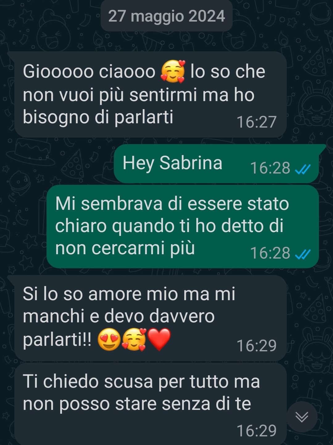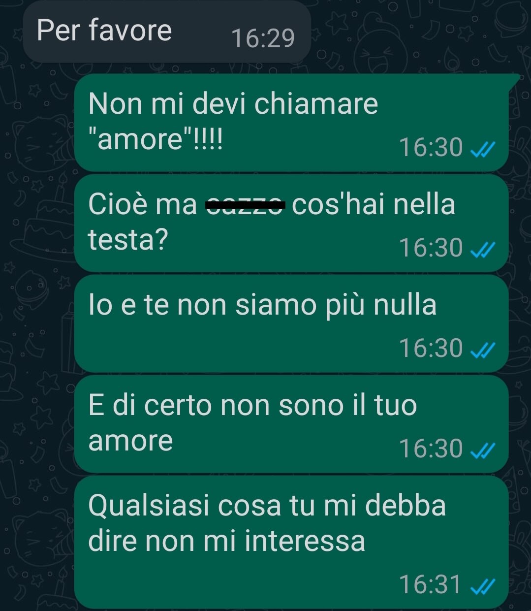Spero non vi verrà un colpo quando leggerete questi messaggi che io e la mia ex, se così si può chiamare, ci siamo scambiati per l’ultima volta. Che fosse un po’ strana lo avevo già capito (anche se ci siamo frequentati per tipo due mesi), ma ragazzi… Questa volta è stato troppo, credetemi. Ho perso cinquant’anni di vita. Ci siamo conosciuti nel bar in cui lavoro, lei veniva circa ogni mattina a fare colazione con le sue amiche e piano piano abbiamo iniziato a sentirci, per poi iniziare ad uscire insieme. Con il passare dei giorni ho iniziato ad accorgermi di alcuni suoi comportamenti strani, tipo che non voleva dire alle sue amiche di noi, perché diceva che erano delle peppie e la giudicavano sempre e non voleva farmi sentire male. Boh, all’inizio ho detto ok, va bene, ma poi i comportamenti strani sono aumentati e io ho poi scoperto tutto. Quindi ovviamente l’ho lasciata e non ci siamo più parlati per circa una settimana, fino a quando mi ha scritto questo giorno, in cui poi è successo il casino. Quindi, nulla… Mi chiamo Giovanni, e questo è stato il momento in cui ho avuto un infarto…