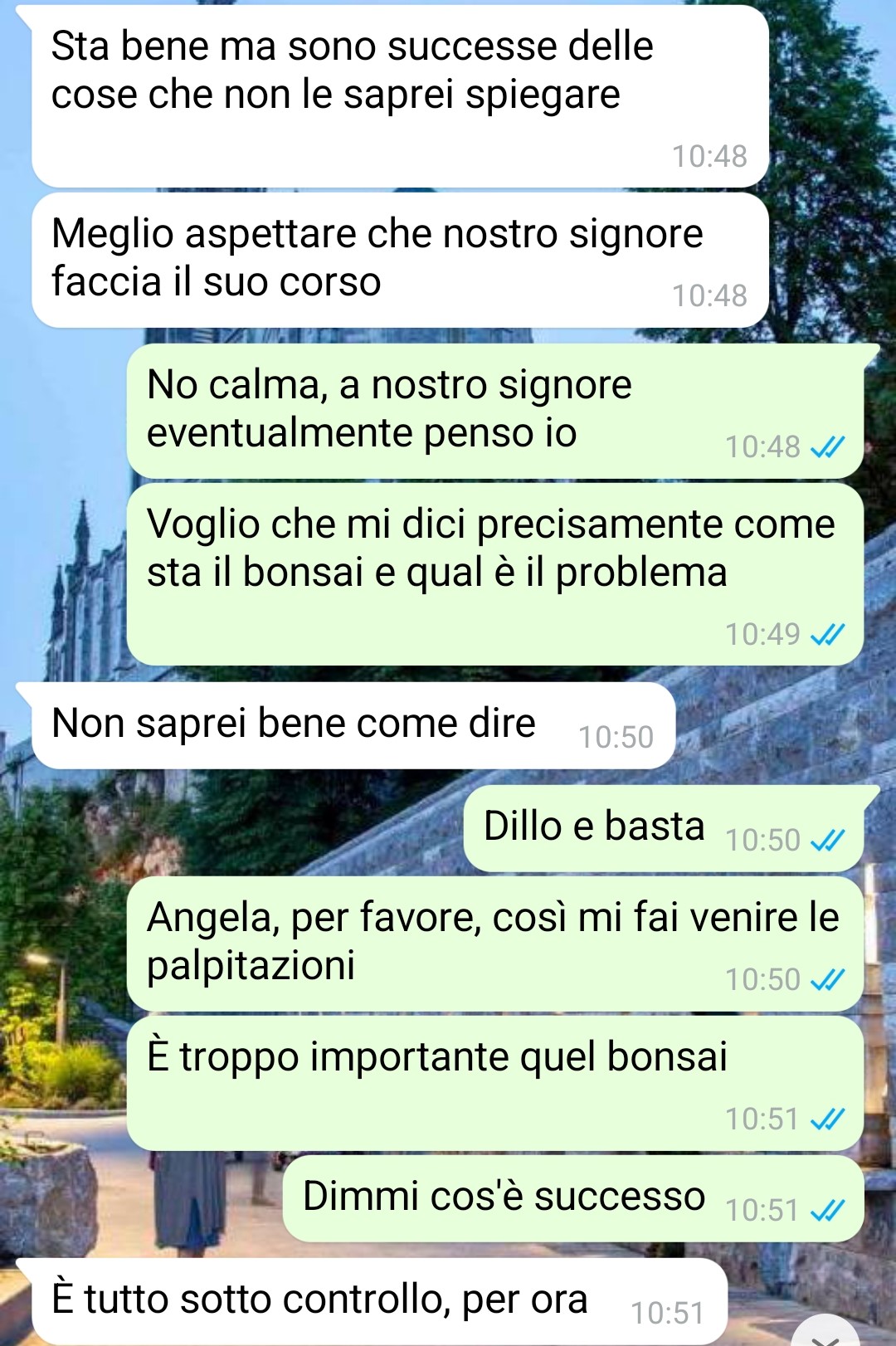 Sono tornata da un lungo pellegrinaggio, con il cuore pieno di pace, e ho trovato una brutta sorpresa. Prima di partire, avevo affidato a una persona “di fiducia”, Angela, una cosa per me molto preziosa, che curo da anni come fosse parte della mia vita. L’accordo era semplice: doveva solo prendersene cura, nutrirla e stare attenta. Niente di complicato. Sto parlando di una piccola pianta bonsai che però non si limita ad essere solo questo. Io sono una giovane suora da pochi anni e possiedo questo bonsai che mi era stato benedetto dal Papa in persona con tanto di foto e attestato di certificazione fatto in Vaticano. Ha un grande valore spirituale ma per noi credenti anche un grande valore economico. Inizialmente tutto sembrava andare bene, ma poi mi ha scritto che c’erano dei problemi. Io mi fidavo di questa persona, le ho affidato soldi e non solo per portare a termine questo compito, ma sentivo in cuor mio che c’era qualcosa sotto. Ovviamente il perdono è sempre per tutti, ma questa volta Angela si era spinta troppo oltre arrivando a fare una cosa terribile che mai mi sarei aspettata.