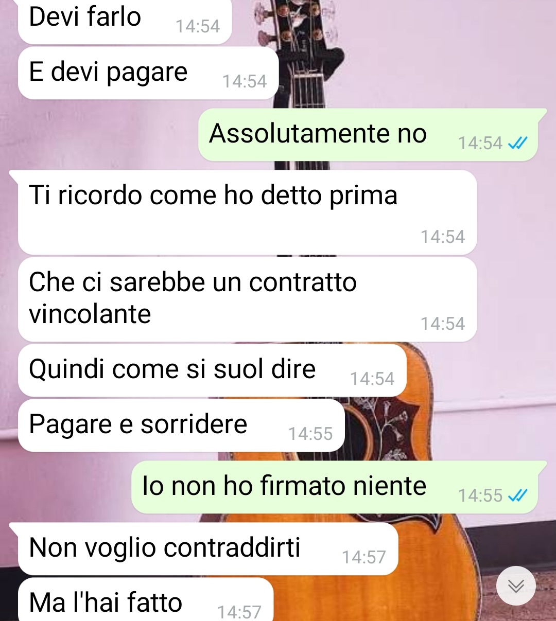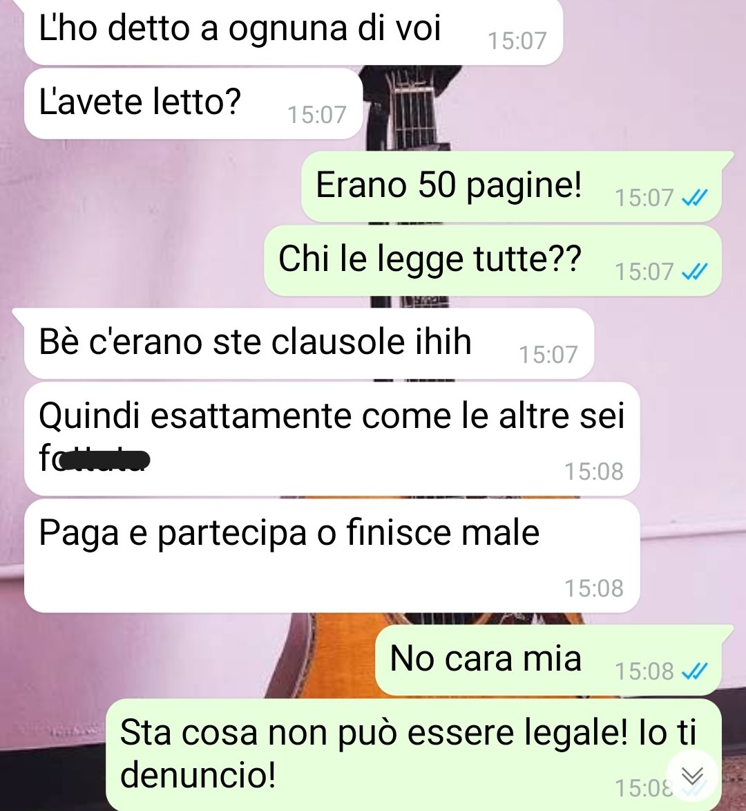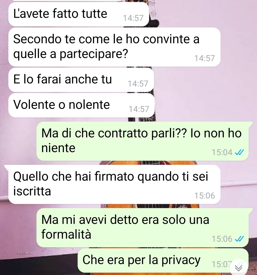 Nonostante ciò, ha continuato a partecipare, finché Francesca non le ha proposto di prendere parte a un piccolo saggio, riservato solo a pochi presenti, tra cui il suo ragazzo. Aurora ha accettato, fidandosi della parola dell’amica. Tuttavia, a distanza di poco tempo, le condizioni sono cambiate. Francesca ha modificato radicalmente i termini dell’accordo e, secondo quanto racconta la nostra fan, è arrivata addirittura a minacciarla.