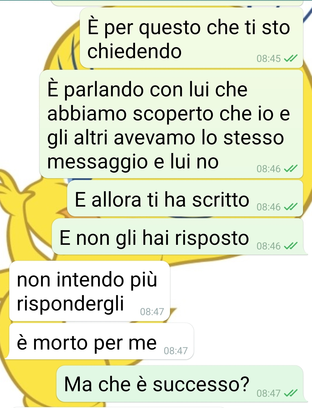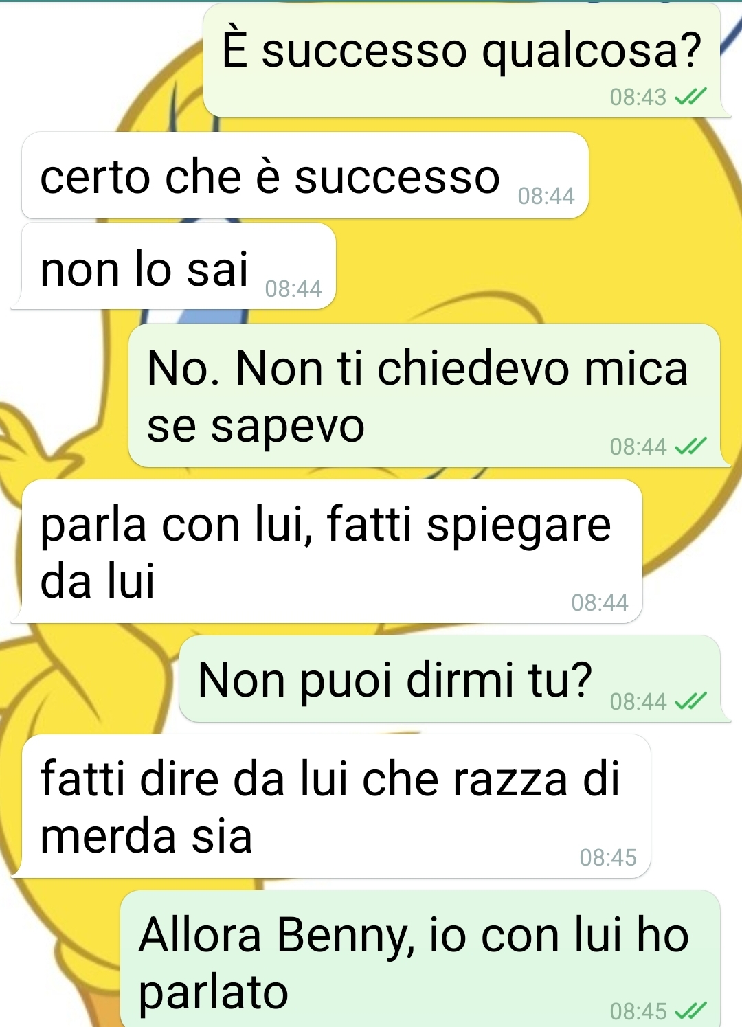 Vi è mai capitato di assistere ad un totale cambiamento di a3eggiamento di una persona, dopo che la stessa si è liberata di un peso personale? È quello che è successo al mio amico Benny, con conseguenze nefaste. io sono Teresa e questa è la chat che ho avuto con Benny appena ieri. Non so da dove cominciare e cosa dirvi, forse meglio che vi faccio il quadro e poi ognuno Cra le proprie conclusioni. Siamo una comiCva di 25enni circa, amici da più di 10 anni e venerdì scorso Benny ha fa3o coming out, è gay. Diciamo che non si è sorpreso nessuno. Domenica siamo tuL a fare una grigliata, la giornata passa tranquilla, niente da segnalare. Cosa c’entra vi chiedete? Ora ci arrivo. Martedì Benny, saputo il giorno della sua proclamazione, ci invita tuL con un messaggio alla laurea. Ma non Livio, quello della comiCva che è sempre stato come un fratello per lui. Chiedo pensando ad una dimenCcanza. E scopro quello che vi apprestate a leggere. Una salsiccia di troppo…