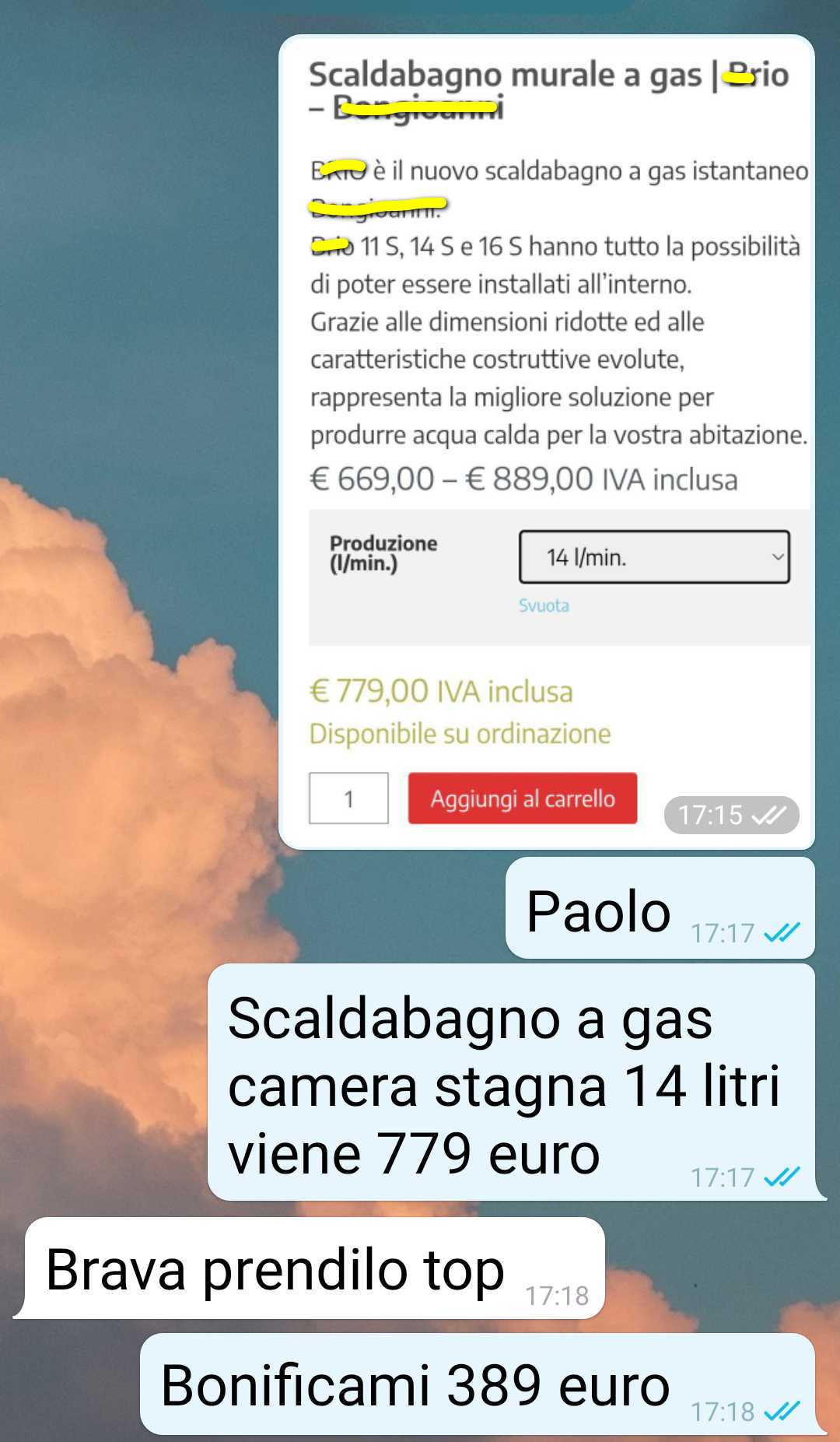 Il mio compagno non vuole dividere la spesa per lo scaldabagno a gas. Non so come farlo ragionare. Io e il mio compagno viviamo in un appartamento di mia proprietà. S9amo cominciando a vederlo come il nostro nido. Ma forse sono solo io a vederlo così. Ci sono delle cose da sistemare ancora. Tipo lo scaldabagno. In casa, c’è installato un modello vecchio per ora, che non funziona bene e che o fa l’acqua a temperatura geyser o la fa fredda 9po acqua del monte Bianco. Per me è normale che le spese per queste cose, come per ogni cosa in casa si devono dividere 50 e 50, dato che entrambi lavoriamo. Che c’entra che questa è casa mia?? Lui ha una teoria assurda. La potete trovare nella chat spiegata da lui come se fosse una cosa normale. Ma anche se la legge dice questo, ma è possibile in una convivenza comportarsi così?? è possibile che lui debba comportarsi come se io fossi sua mamma e lui, come ha faKo per una vita a casa di lei, non spende niente e si raccoglie tuL i soldi dello s9pendio?? Com’è finita? Ecco la chat.