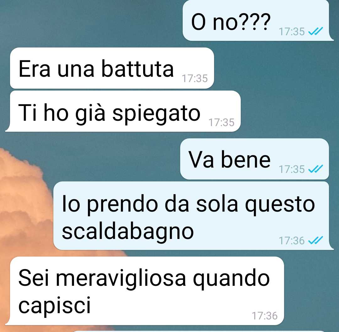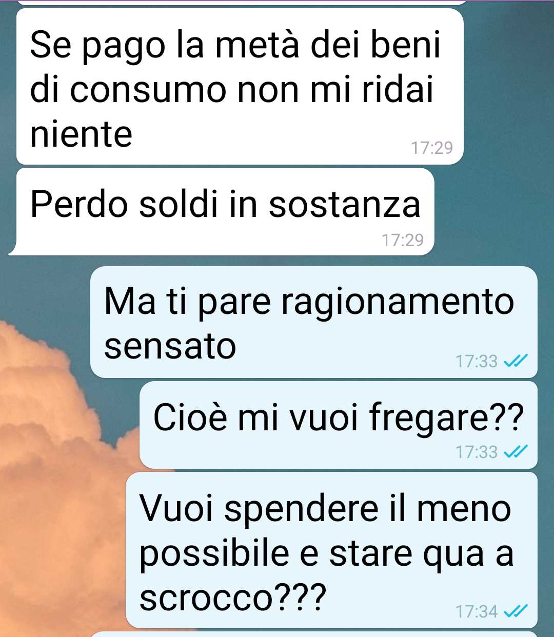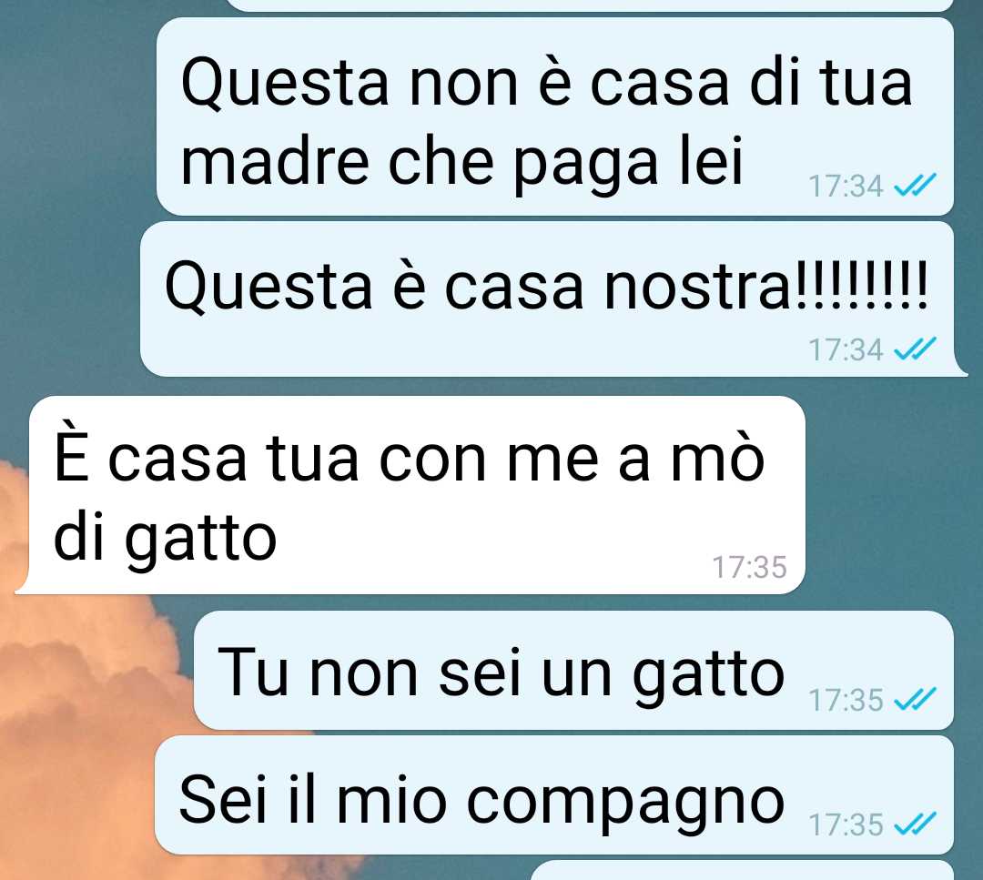 Per far capire meglio il contesto e la posizione del compagno, ha deciso di condividere gli screenshot della loro conversazione, in cui lui spiega la propria “teoria” con naturalezza, come se fosse del tutto logica. Una lettura che lascia spazio a riflessioni su cosa significhi davvero costruire qualcosa insieme e se sia possibile portare avanti una convivenza in queste condizioni.
