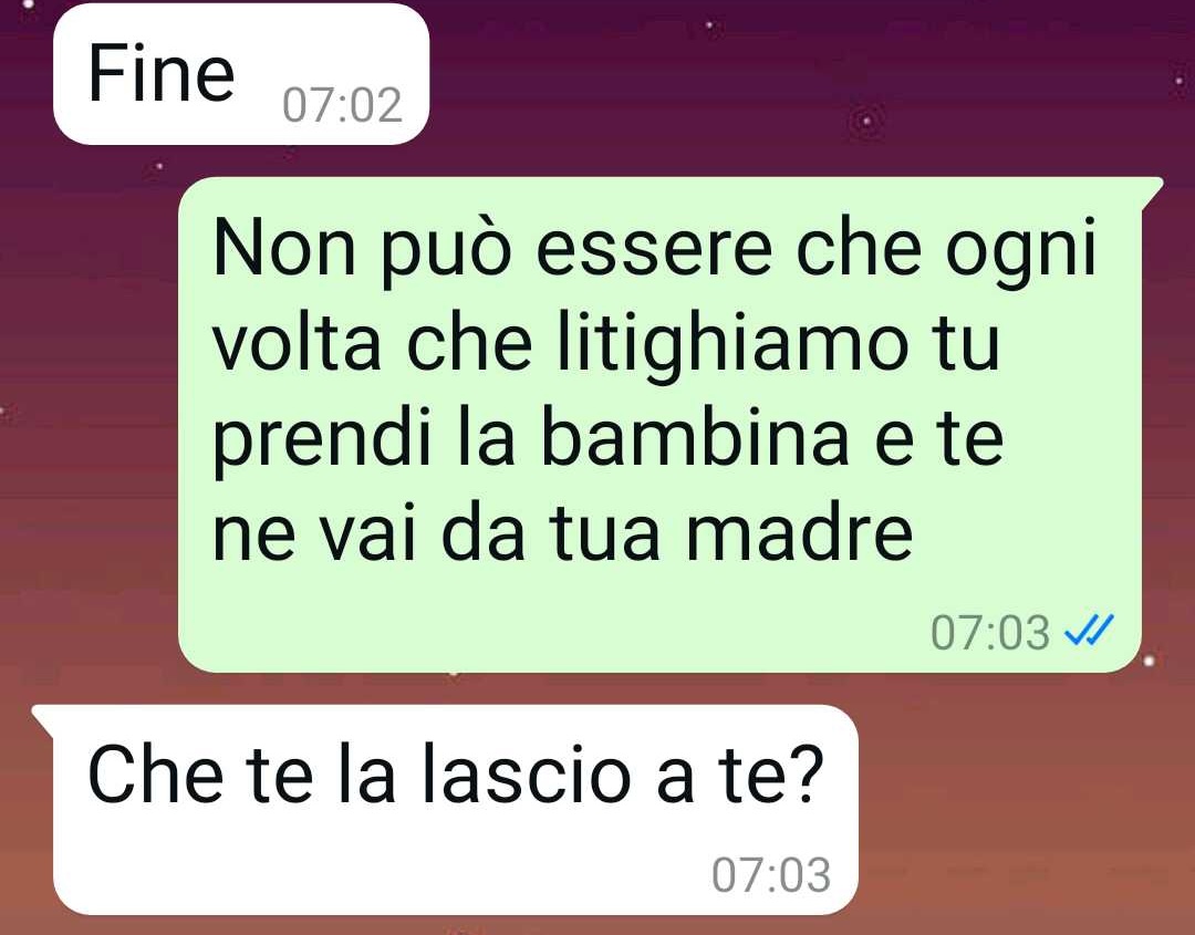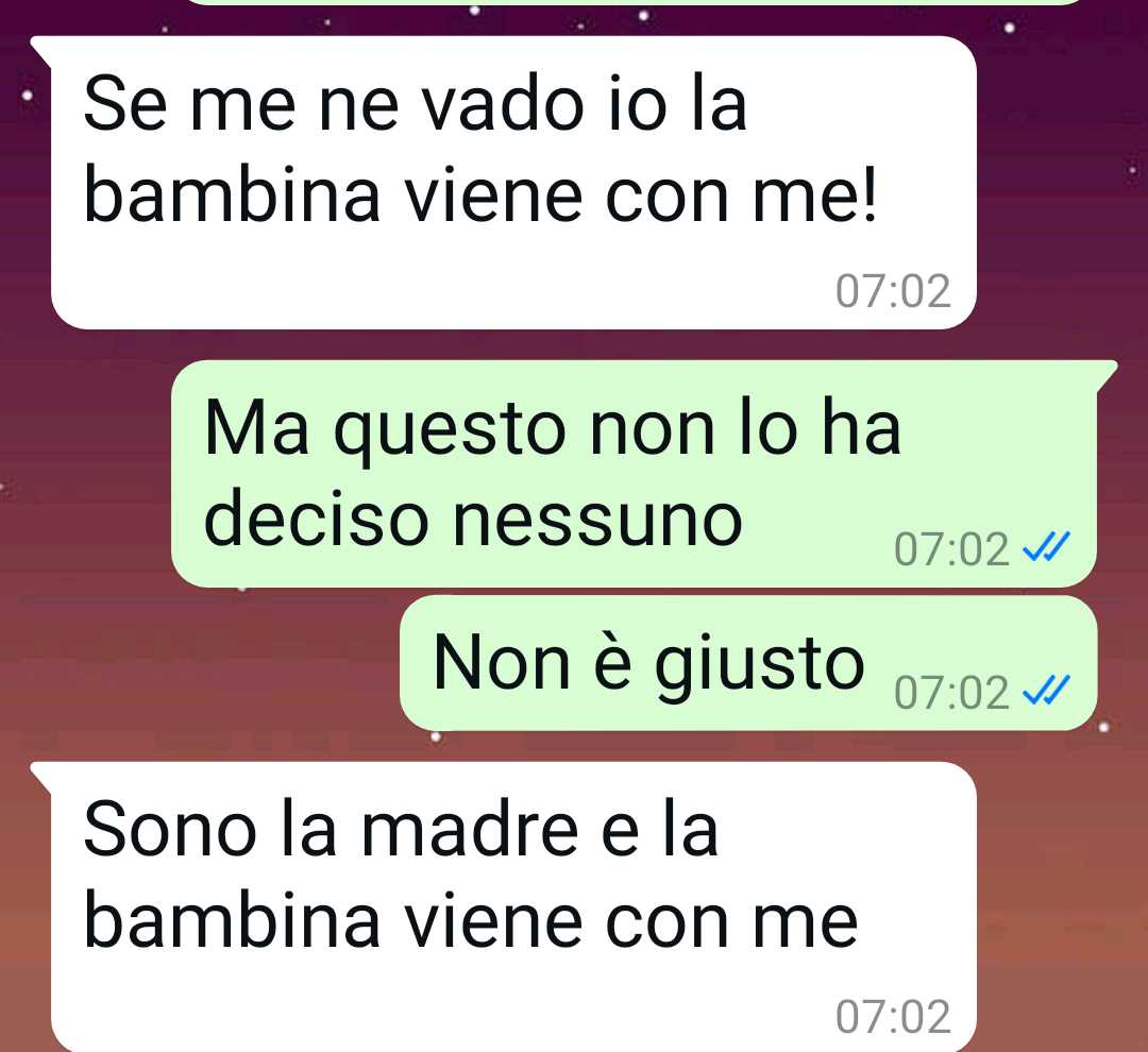 La mia compagna si è portata via la bambina dopo un litigio. È giusto?? Per me non lo è!! Assolutamente. Lei è la madre, ok. Ma io sono il padre. E non potrei essere un padre più innamorato di sua figlia. Monica è la luce dei miei occhi. Ok, mi sono comportato male, ok ho sbagliato e chiedo scusa. Ho chiesto scusa alla mia compagna in mille modi diversi. Le ho chiesto perdono e sono pronto a inginocchiarmi. Ma lei è irremovibile. Lei non vuole riportare nostra figlia a casa mia dove abitiamo, dove stiamo ormai da un bel po’. Cosa devo aspettarmi?? Questa è la casa di Monica. Io sono il padre. Sono una brava persona. Per un capriccio della mia compagna, devo rischiare di vedere mia figlia col contagocce???? E no, non me ne frega niente della casa. In questo momento il mio unico terrore è vedere poco mia figlia e perdermi tutti quei momenti che noi padri amiamo da morire. Perdermi tutta quella meravigliosa innocenza di mia figlia, non esserci per giocare ai leoni, agli astronauti, alle principesse disney, a Oceania. Non esserci quando lei ha bisogno di me, quando ha la febbre, la tosse o deve fare l’aerosol. Ho avuto un padre splendido e presente e ciò che più desidero al mondo è dare lo stesso amore a mia figlia.