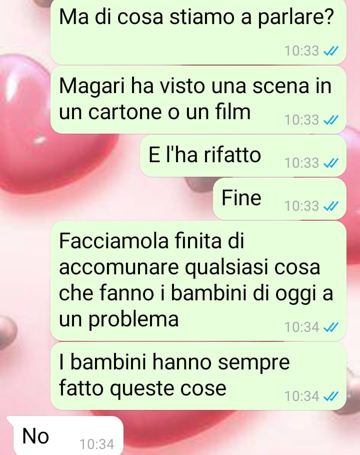 La nostra amica si chiede quindi se davvero ci si debba trasformare in “paladini della giustizia” ogni volta che accade qualcosa tra bambini, o se non sia invece più sano permettere ai piccoli di affrontare anche momenti di normale confronto. Ha deciso di condividere lo scambio avuto con l’altra mamma per mostrare quanto, a suo avviso, certi eccessi siano diventati la regola.