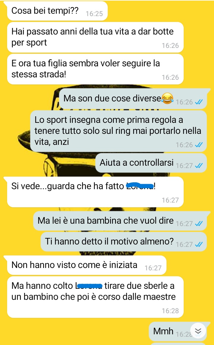 Buongiorno a tutti. Volevo condividere con tutti voi, e in particolare con i papà (e certamente, anche le mamme) di bambini questa conversazione con mia moglie in seguito a uno dei momenti più temuti da ogni genitore… i colloqui con le maestre! È stato uno dei momenti in cui, grazie a mia moglie, mi sono reso pienamente conto di quanto non solo le nostre parole e i nostri insegnamenti possano influire sui nostri figli, ma anche di come a volte possa capitare di proiettare la propria vita sulla loro. Se a volte questo può essere fatto in buonafede e diventare di aiuto al bambino (o bambina, nel mio caso), altre volte si rischia di influenzarli per paure, insicurezze o piccoli traumi che appartengono alla nostra infanzia. Non sempre è facile ricordarsi che i bambini hanno un modo diverso di interpretare il mondo. Nonostante questo episodio fosse, in realtà, andato esattamente come pensavo (e ciò mi ha reso estremamente orgoglioso di mia figlia), mi ha fatto anche riflettere un attimo su come avessi rischiato di dare un insegnamento errato, seppur con tutte le migliori intenzioni, a quella che era solo una bimba. Bisogna sempre fare attenzione a cosa succede ai nostri figli: prepotenze o bulli possono sempre essere davanti ai nostri occhi senza che ce ne accorgiamo. Allo stesso tempo, abbiamo anche il dovere di rispettare le fasi della vita e non correre mai. Ogni età richiede una strategia diversa per insegnare loro ogni cosa.