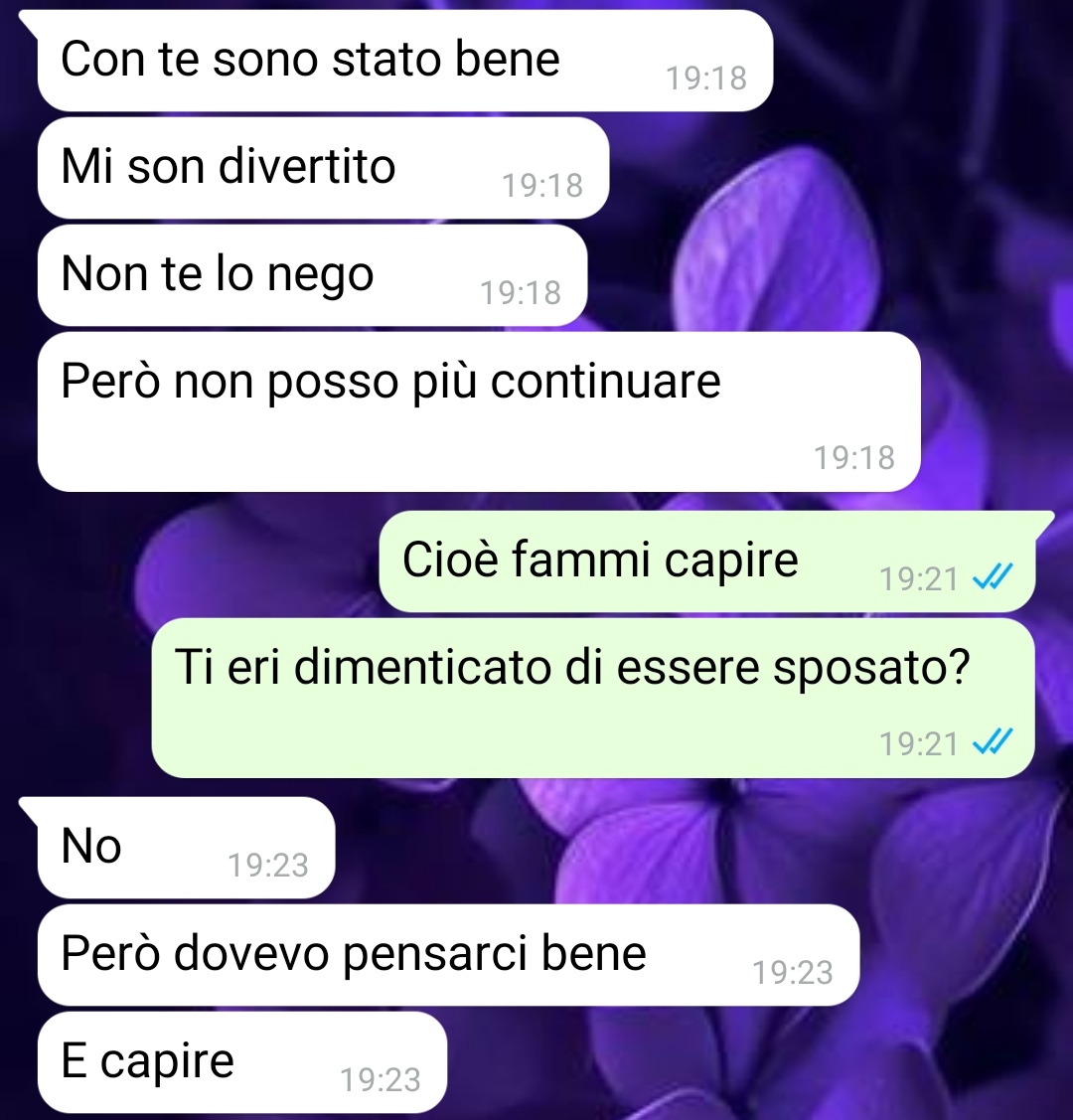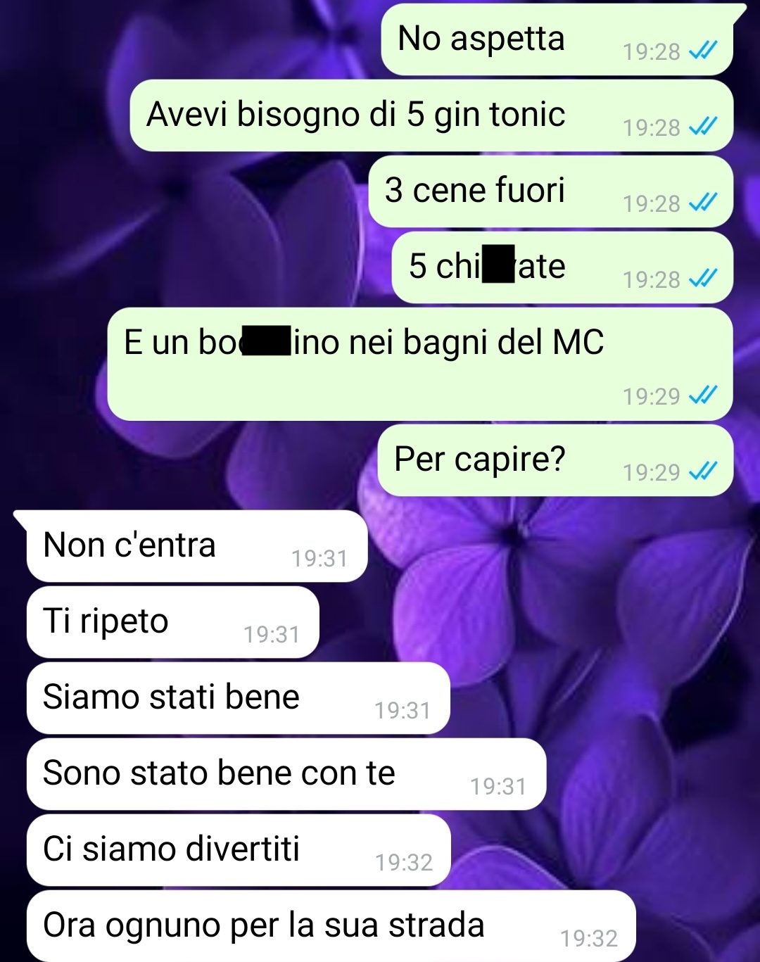 La nostra fan non immaginava che un giorno si sarebbe trovata nella situazione di inviare una conversazione a Commenti Memorabili, ma la vita, si sa, può riservare sorprese inaspettate. Racconta di aver vissuto un episodio particolarmente spiacevole, che l’ha segnata in modo profondo, soprattutto perché coinvolgeva una persona per cui iniziava a provare una forte fiducia e un sincero interesse.