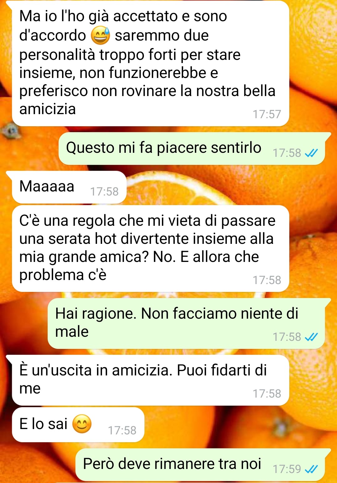 L’amicizia con Valentino è sempre stata un’avventura, piena di risate e momenti imprevedibili. Sin dal primo giorno, abbiamo avuto una sintonia particolare: ci capivamo al volo e ci divertivamo insieme. Ma, come spesso accade nelle amicizie, ci sono stati anche dei malintesi che hanno messo in pericolo il nostro legame. Recentemente, mi ha chiesto di uscire e per il tipo di proposta che mi ha fatto io ho pensato subito che non avesse ben capito i limiti del nostro rapporto. Ma abbiamo subito chiarito essendo io fidanzata. L’altro giorno, però, mi fa una nuova proposta, mi parla di un evento che prometteva di essere molto “coinvolgente”. Il problema è che sono sempre incerta su questa questione. Io amo moltissimo il mio fidanzato e quindi sto sempre attenta a non fare nulla che possa mettere in difficoltà lui e il nostro rapporto. Ma Valentino sembrava super tranquillo e preso bene, allora ho ascoltato questa proposta perché mi sembrava la cosa giusta da fare in quel momento. Purtroppo, le cose non sono andate per niente come avevo immaginato. Non mi posso proprio fidare di nessuno.