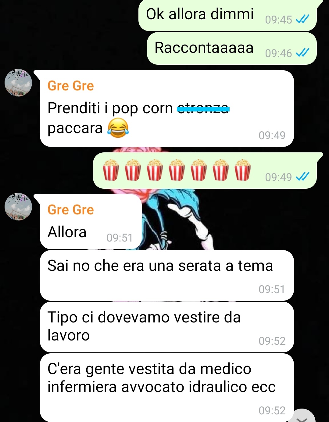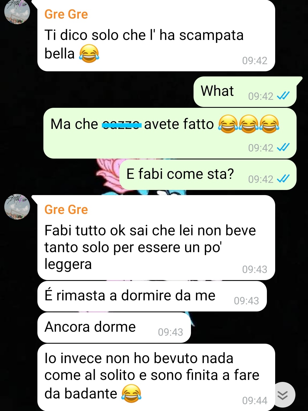 Siamo Artemisia e Greta, due amiche di una vita che fanno cose da ragazze 20/30 enni (non vi sveliamo l’età precisa) ma che poi finiscono nei casini. In realtà nel gruppo siamo quattro: Io (Artemisia), Greta, Fabiana e Miriam. Siamo tutte sigle per scelta, degli altri, l’unica fidanzata è Miriam. O meglio dire che lo era fino a qualche tempo fa. Recentemente il suo ragazzo l’ha mollata e abbiamo deciso tutte di portarla in discoteca a divertirsi un po’ e dimenticare il suo ex per qualche ora, o per sempre. Io, Artemisia, non sono potuta andare con le altre perché quella sera festeggiavamo il compleanno di mio fratello insieme a nonni, genitori, cugini e altri amici di lui. Però le altre sono andate a divertirsi, ma non mi hanno calcolata tutta la sera. Pensavo mi mandassero foto e video o pensavo di vedere qualche storia su Instagram ma nulla. Allora il giorno dopo scrivo sul nostro gruppo di amiche su whatsapp per chiedere come è andata. L’unica che mi risponde all’inizio è Greta e mi racconta tutto per filo e per segno della serata. Vi lasci amo gli screen sotto così vi rendiamo partecipi. Ciaoo