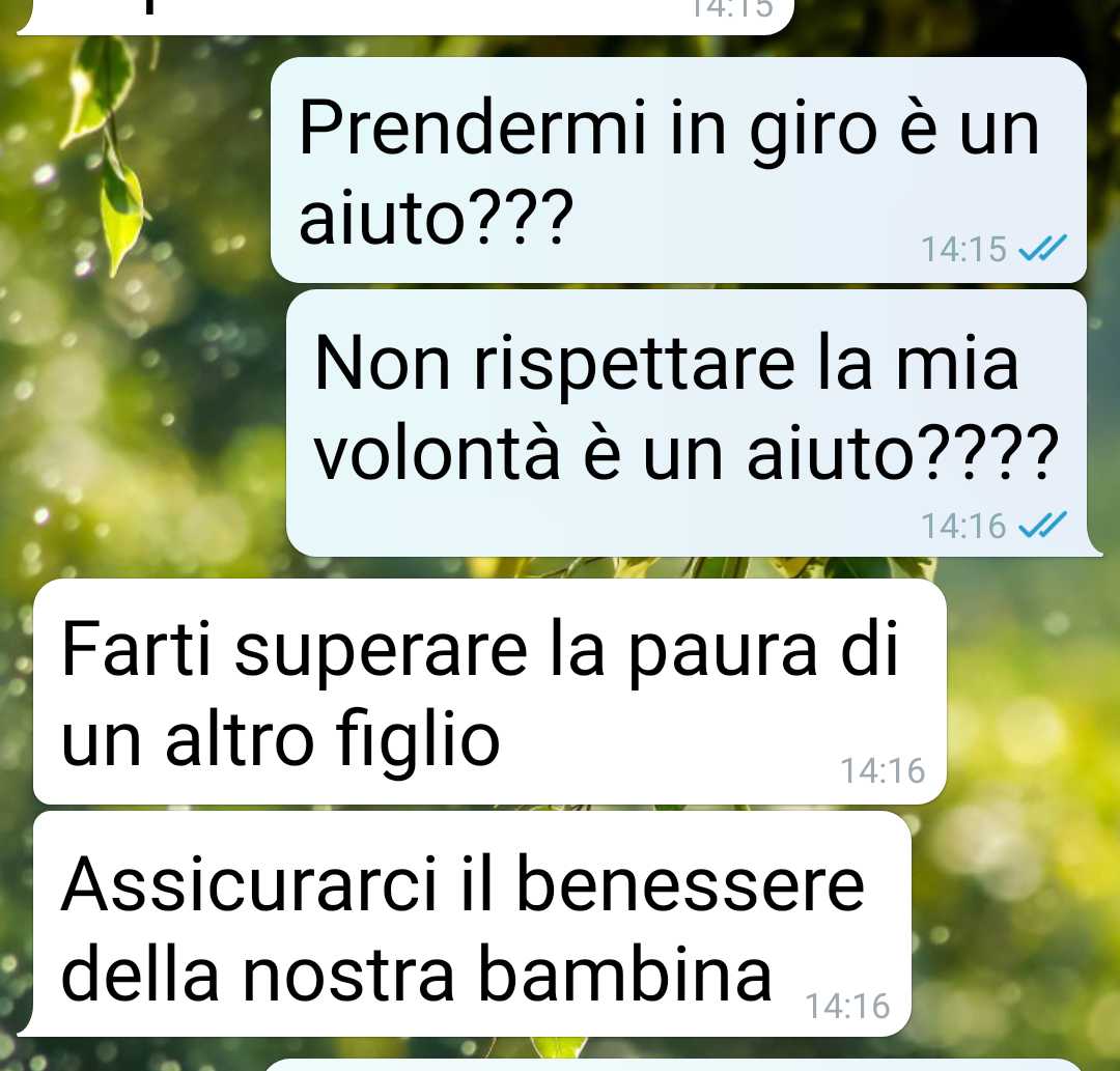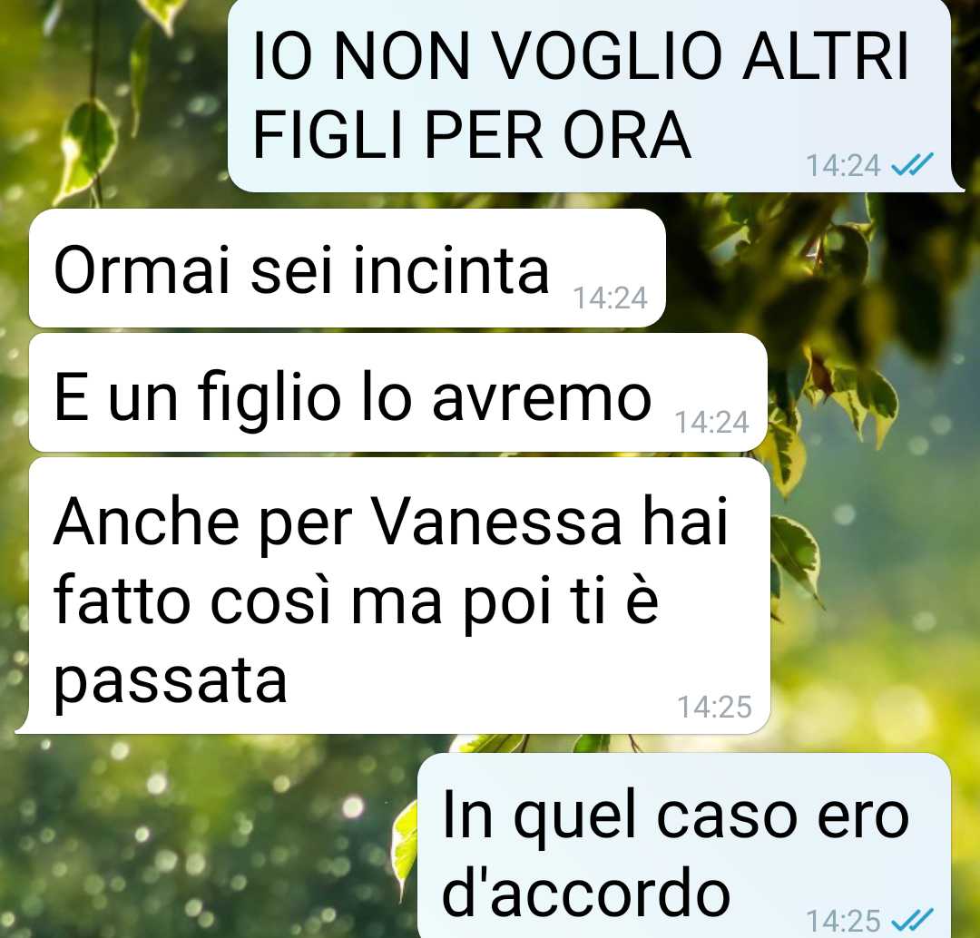Secondo quanto riferisce la nostra amica, questa sua posizione era sempre stata chiara e condivisa in modo esplicito all’interno della coppia. Nonostante ciò, racconta di essersi trovata improvvisamente davanti a una situazione che non aveva scelto e che non aveva approvato.