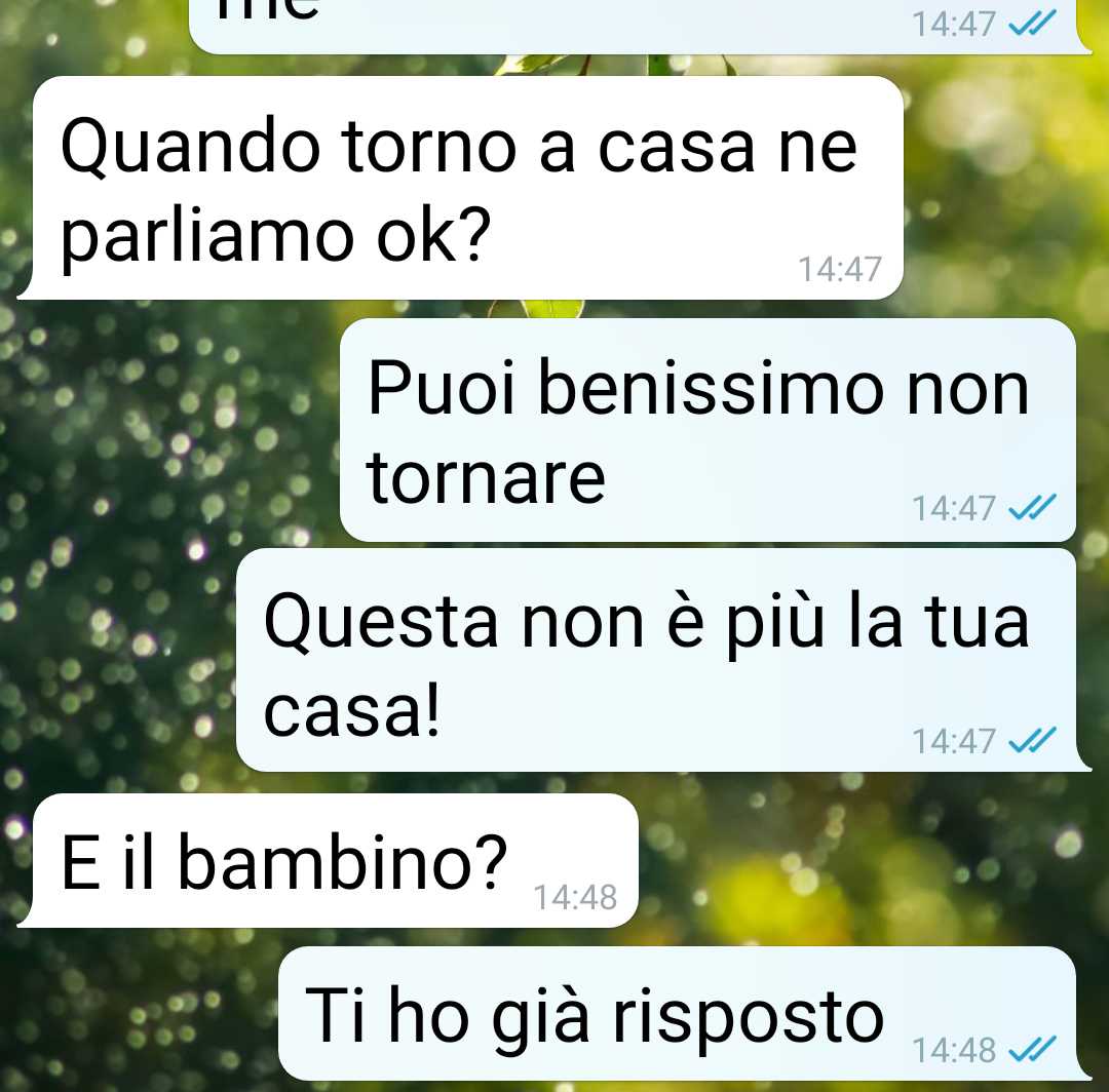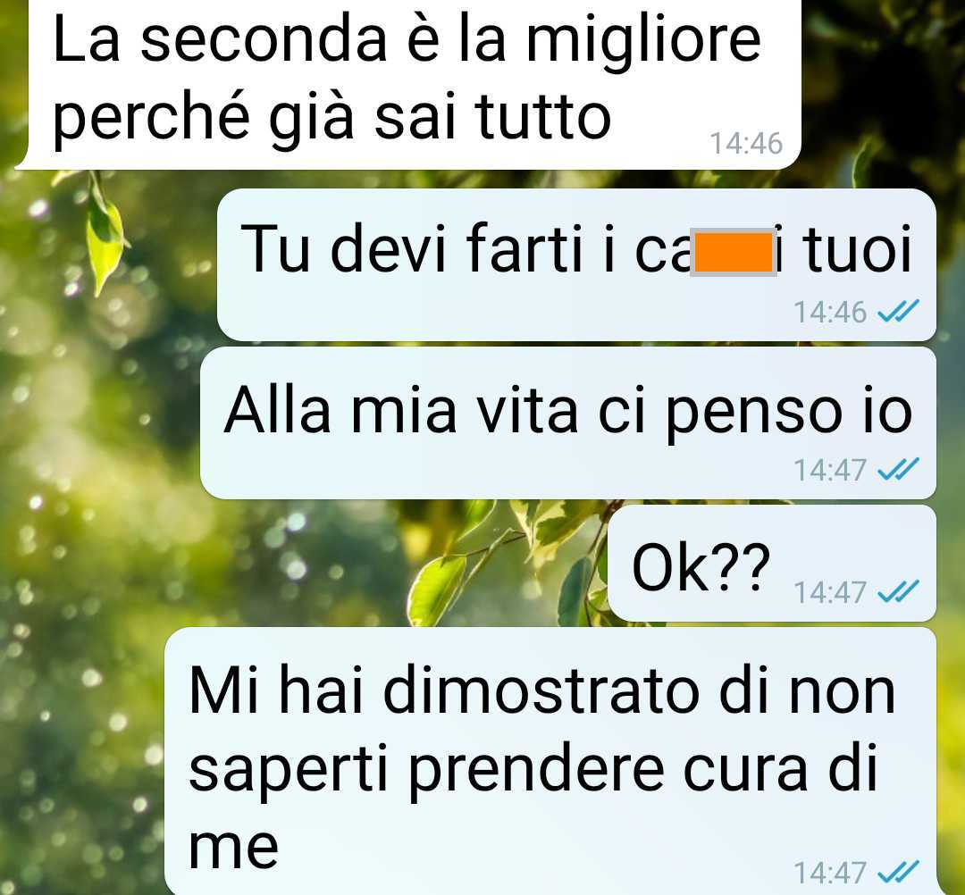 La nostra fan descrive il comportamento del marito come un atto di egoismo estremo, che l’ha costretta ad affrontare una realtà che non desiderava. Nel suo racconto emerge un forte senso di delusione verso un uomo di cui si fidava e che ora non riconosce più come prima. Ha deciso di inviare la conversazione avuta con lui per raccontare ciò che è successo e per dare voce alla rabbia che prova. Secondo quanto dichiara, il rapporto tra loro, da questo momento in poi, resterà limitato esclusivamente alle necessità legate alla figlia che già hanno insieme.