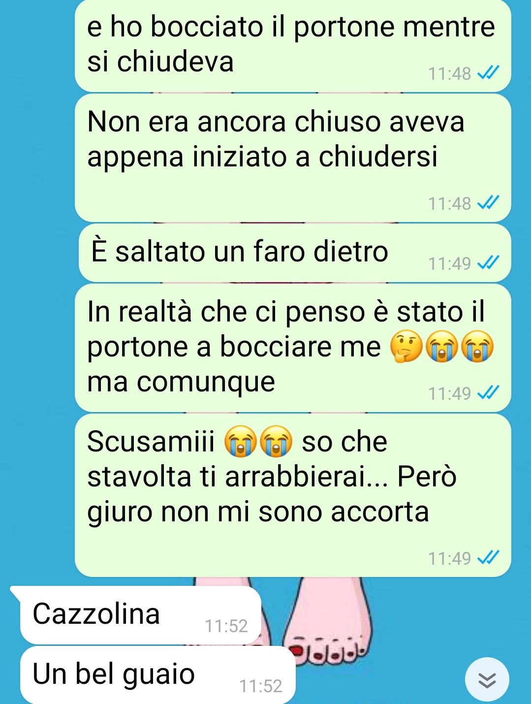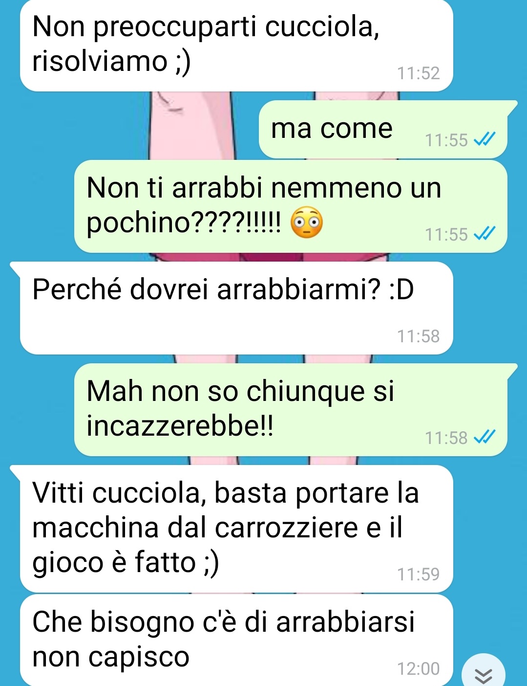 Mi chiamo Vittoria e ho 41 anni e sono “fidanzata” con Cristian da 5 anni, ma conviviamo da 2 annetti. Non siamo sposati e non vogliamo sposarci mai, anche perché abbiamo avuto esperienze precedenti e non vogliamo replicare. Ci siamo accordati così. Cristian è un uomo rispettabile e rispettato che lavora per una grande azienda che non vi posso dire ma guadagna molto bene. Lui ha 45 anni ormai è stabile lì. Io sono una donna più semplice con il mio diploma superiore e lavoro in una aziendina come segretaria part ti me. Vi dico queste cose per dire che alla fine non ci manca nulla, ma da quando abbiamo iniziato a convivere 2 anni fa lui non si arrabbia più per nulla, non si confida e non mi parla mai di nulla che lo preoccupa. Molti la considererebbero un a relazione perfetta, zero problemi, zero discussioni, zero urla, zero parolacce, ma io vedo solo piattitudine e mosceria. Credevo che questa volta si sarebbe arrabbiato invece ho scoperto una cosa che voi secondo me pensate di aver intuito invece non è come credete. Per favore leggete la chat che vi mando e aiutatemi a reagire nel modo giusto, perché sono bloccata.