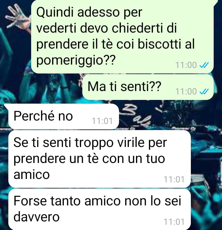 Il nostro fan si chiede come sia possibile che, per colpa di una delusione amorosa, una persona cambi al punto da rifiutare tutto ciò che prima amava: la compagnia degli amici, le serate insieme, il semplice piacere di divertirsi. E si rivolge in particolare alle lettrici, domandandosi come una ragazza – che definisce “capricciosa” – possa essere stata capace di avere un impatto tanto devastante sulla psiche di una persona.