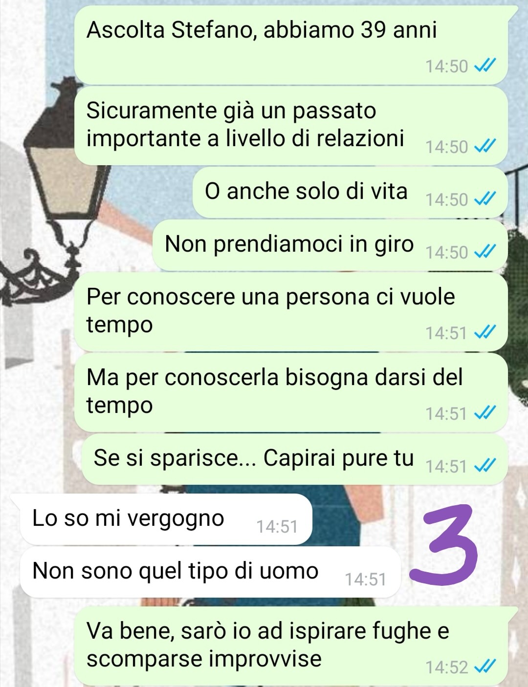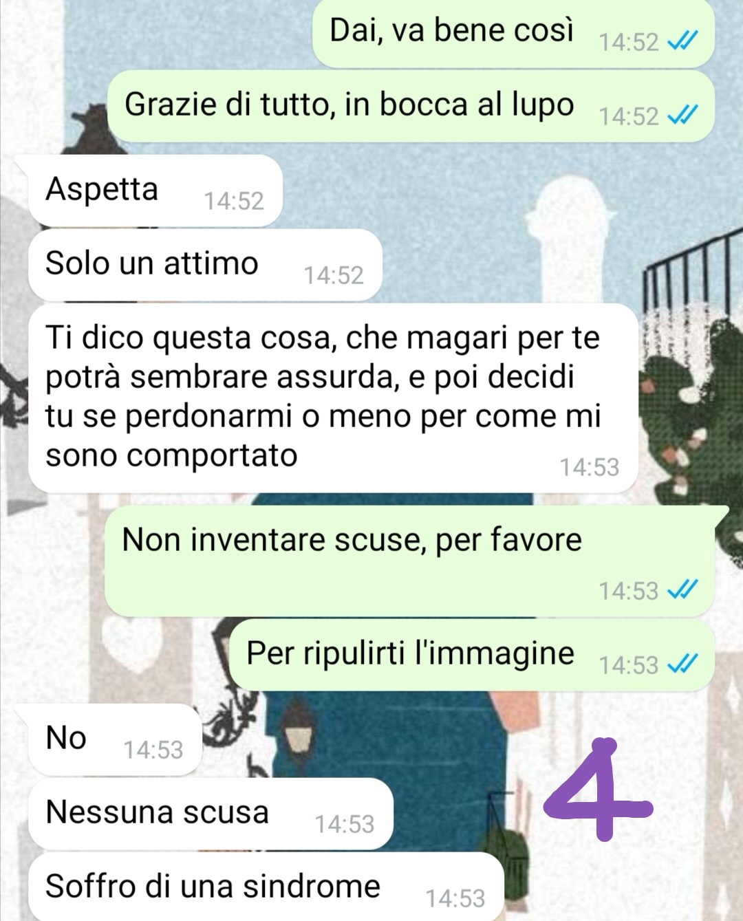 Amici, vi sembrerò l’ennesima donna che scrive dopo essere uscita con un uomo per un paio di mesi, aver creduto che potesse essere finalmente quello giusto per poi non ricevere più una risposta ai miei messaggi e vedere questa persona scomparire nel nulla. E che c’è di strano, direte voi? È la sindrome del nostro millennio. Ma io questa volta non volevo lasciar perdere, sentivo davvero che fosse una brava persona e allora ho provato a riscrivergli. Errore fatale… dirà qualcuno, ma io ci tenevo davvero. E con il senno di poi forse lo rifarei, perché quando l’ho ricontattato ho saputo che era affetto letteralmente da una sindrome che non avrei mai immaginato e che in realtà non conoscevo… anche perché durante la nostra conoscenza aveva omesso una parte della sua vita che invece avrei voluto conoscere. Vi lascio la chat così potrete comprendere meglio… so che viviamo in una società nella quale le relazioni sono sempre più difficili, ma se sto mandando questi stralci di conversazione è perché credo che potranno aiutare qualcuno a non fermarsi alla superficie di ciò che sembra, ma spesso non è …