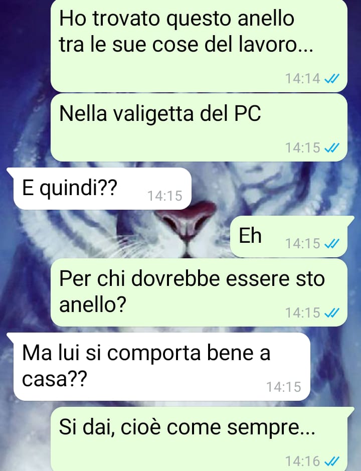 sono una ragazza che l’anno prossimo comincerà l’università e che ha sempre vissuto una vita tranquilla. Mi sono sempre vantata di avere una famiglia molto affettuosa e calorosa, anche se sono figlia unica i miei genitori non mi hanno mai fatto mancare niente. Qualche giorno fa, però, ero nello studio di mio padre perché avevo bisogno di alcune foto che teniamo nel suo hard disk, ma nel cercarlo ho invece scoperto un anello nella borsa del pc di mio padre e questa cosa mi ha messo in forte allarme. Ho fatto subito una foto e l’ho mandata a una delle mie migliori amiche per chiederle consiglio. Voglio molto bene a Martina e sapevo che con la sua esperienza mi avrebbe dato sicuramente i consigli più giusti. Ma sono rimasta molto confusa dalle sue parole. A essere onesta, ora non so davvero come dovrei comportarmi, perché qualsiasi cosa mi sembra sbagliata. Leggete gli screen che vi ho inviato per capire cosa intendo, perché io non sono affatto d’accordo con la sua opinione, ma ora mi sentirei in colpa a fare qualsiasi cosa.