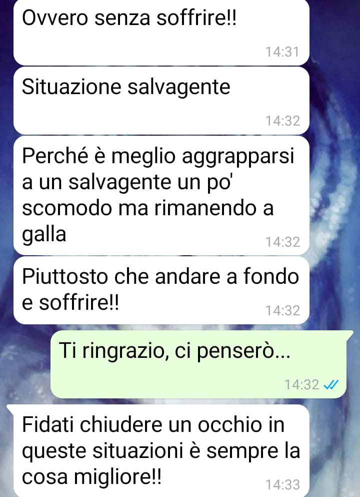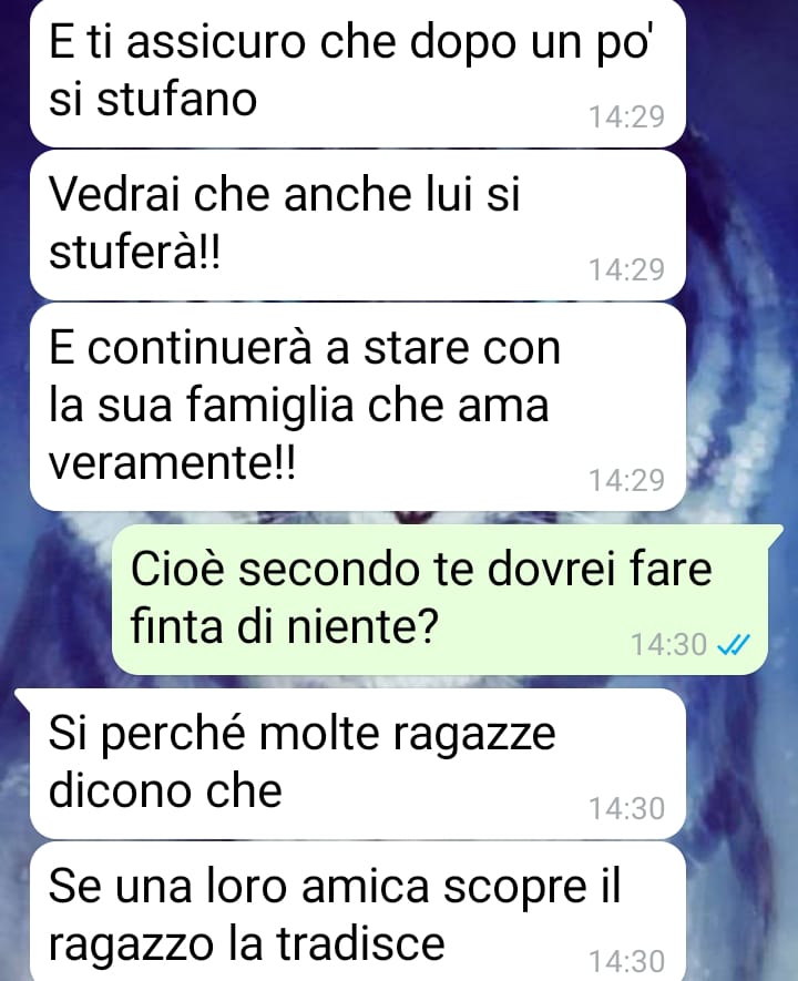 La follower spiega di sentirsi ora combattuta e in colpa, anche solo all’idea di prendere una decisione. Pur non essendo d’accordo con l’opinione della sua amica, quelle parole l’hanno messa in crisi e l’hanno portata a dubitare di se stessa. Per questo ha deciso di inviare gli screen della conversazione, spiegando che solo leggendoli si può comprendere appieno la confusione e il disagio che sta vivendo in questo momento.