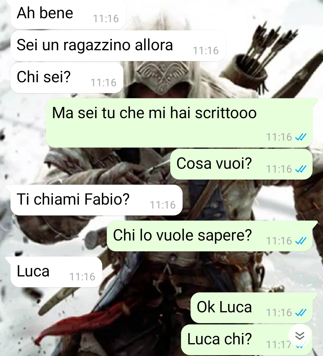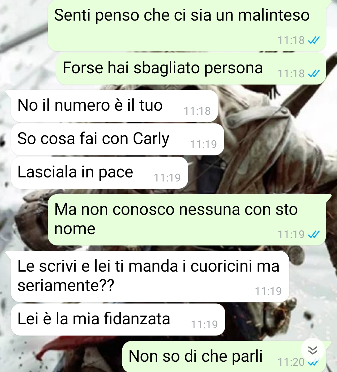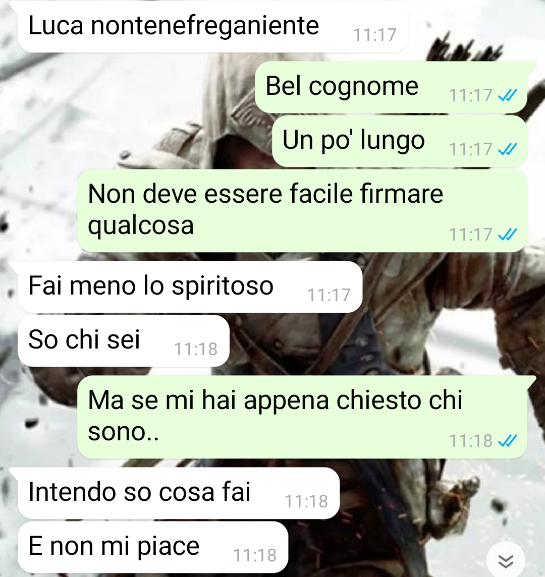 Salve, sono Fabio e mi sono ritrovato in una situazione che dirsi spinosa è dire poco. Non voglio anticiparvi troppo di quello che leggerete nella chat, quindi vi parlerò di me. Vi basti sapere, però, che all’inizio (ma anche alla fine tutto sommato) la conversazione da me avuta è stata piuttosto ridicola e sembrava una comica fatta apposta, quando invece era tremendamente reale. Purtroppo poi assume toni tragici, ma vedrete. Io sono un ragazzo semplice, mi piace giocare ai videogiochi, uscire con gli amici, ho un lavoro che amo e sono single. Mi vedo a volte con alcune ragazze, è capitato che nascesse qualcosa, ma amo tanto la mia indipendenza e non mi va in questo momento della mia vita di vivere una relazione, ma anche una frequentazione perché non mi interessa nel modo più assoluto. Sembra che questa cosa non sia stata capita da Luca, una persona che io non conosco e non sapevo minimamente chi fosse, che mi ha contattato sul mio numero e ha iniziato a trattarmi malissimo. Diciamo che era una persona interessata a me, senza che io lo sapessi. Ma vi ripeto, non vi anticipo troppo, vi lascio alla lettura e divertitevi, sicuramente più di quanto mi sono divertito io dato che a una certa mi sono pure preoccupato.