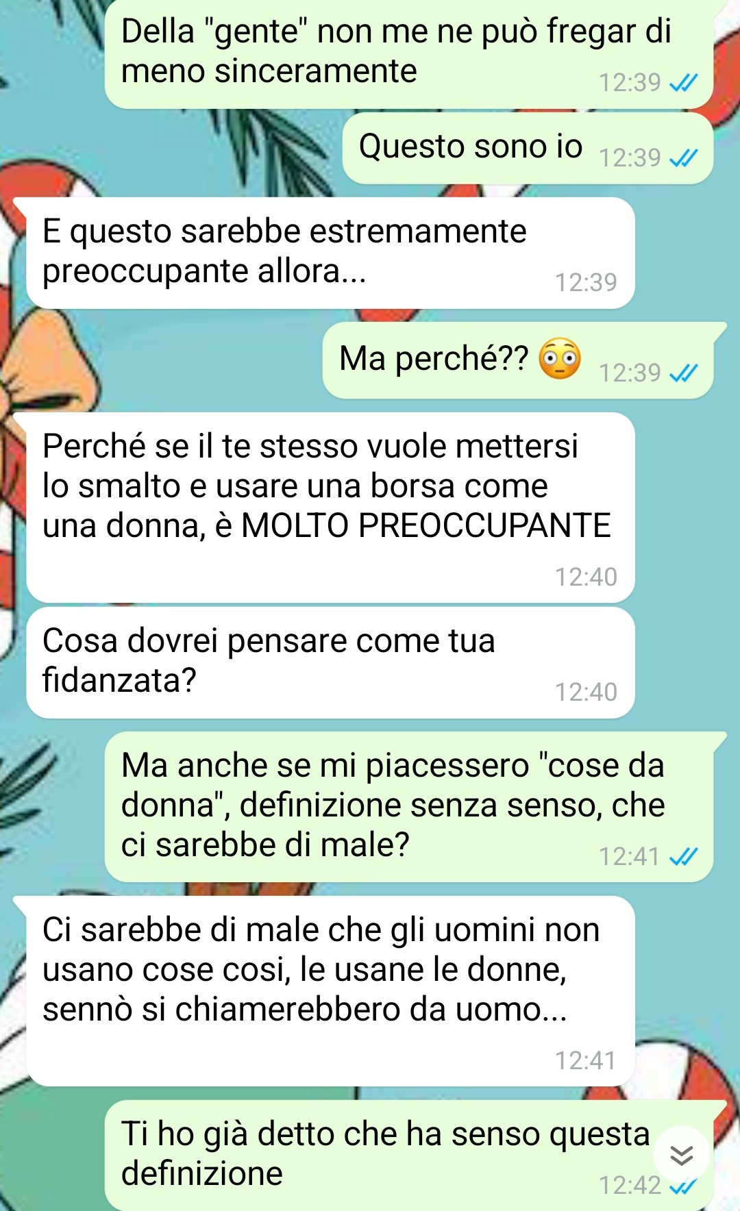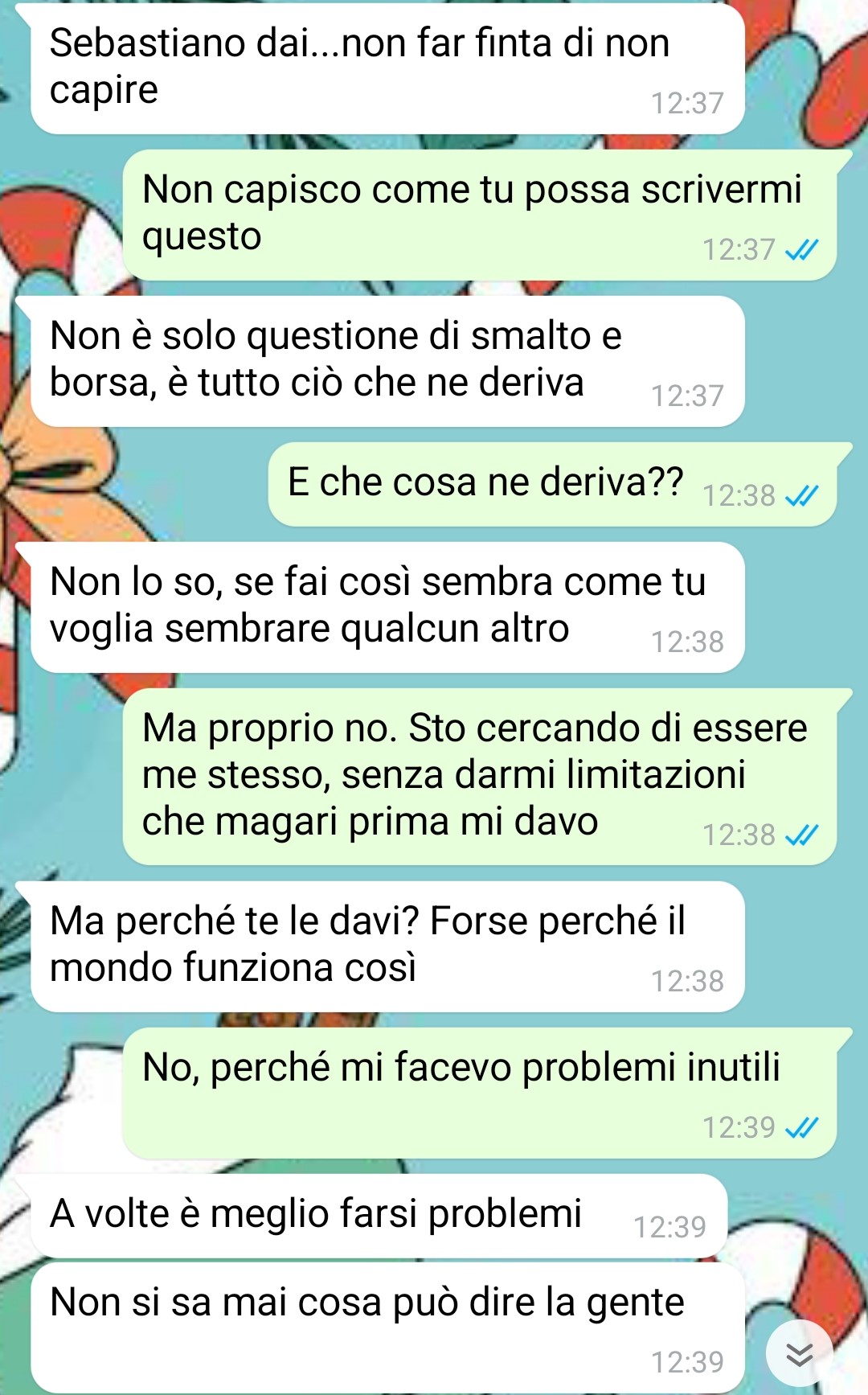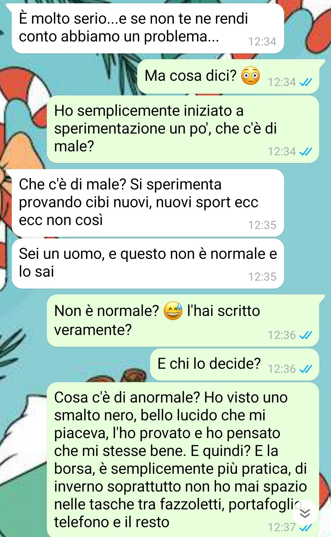 Dicono che il Natale porta gioia e felicità, ma così non è stato per me, non quest’anno, che proprio nel pieno delle feste ho visto la mia vita ribaltata, e per cosa? Per niente, per uno smalto e una borsa…assurdo, ma andiamo per ordine. Da circa nove mesi sto con Claudia, una ragazza bella, intelligente (ma forse non quanto credessi) a cui piace vivere a pieno il mondo, come me, e infatti ci siamo trovati bene fin da subito. Come in tutte le relazioni, o comunque parlo per me, all’inizio magari non si è del tutto sé stessi, si cerca di piacere all’altro e solo piano piano esce fuori la propria essenza più completa. E così è stato con lei. All’inizio ero un po’ frenato su alcuni comportamenti ma poi, e questo lo dico in generale nella vita, mi sono deciso a mettere la libertà al primo posto. E quindi, semplicemente perché mi piacevano e mi piaceva l’effetto che avevano, anche esteticamente, su di me, ho cominciato a mettere lo smalto e utilizzare una borsa. Una scelta a mio parere normalissima, no? Evidentemente no, non per Claudia almeno, che in piene feste di Natale ha voluto affrontare la questione.